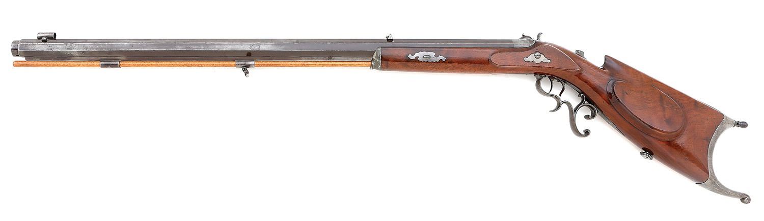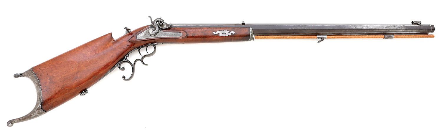 .40 cal, 33 1/2'' octagon barrel turned for starter with a bright very fine bore showing a little sparse mild oxidation and crisp rifling throughout. The barrel retains a healthy amount of original plum-brown finish with overall toning to gray and showing some old oxidation staining and sparse pinprick pitting. The top flat retains crisp stamped maker markings ''H. BERG. / DAVENPORT IOWA.'' and the lockplate is rather spartan showing some nice smoky case-hardened colors. The fancy spur triggerguard and Berg schuetzen buttplate also retain some remnants of smoky case-hardening along with some oxidation speckling and light staining. The rifle is equipped with under-rib and two ramrod thimbles, pewter nosecap, fancy silver wedge and lock screw escutcheons. The smooth walnut stock remains in very fine condition retaining most of its original varnish with scattered light dings, handling marks and a small gap at the toe against the buttplate. There is a vacant base at the upper tang for mounting a diopter sight, the rear sight is a fine adjustable v-notch and the front is a target globe with fine bead-on-post. A simple replacement wooden ramrod is present and the lock with double set triggers seems to function well mechanically. A nice rifle from the well-regarded Henry Berg of Davenport. (13B11804-15) {ANTIQUE} [Dale Beeks Collection] (2000/3000)