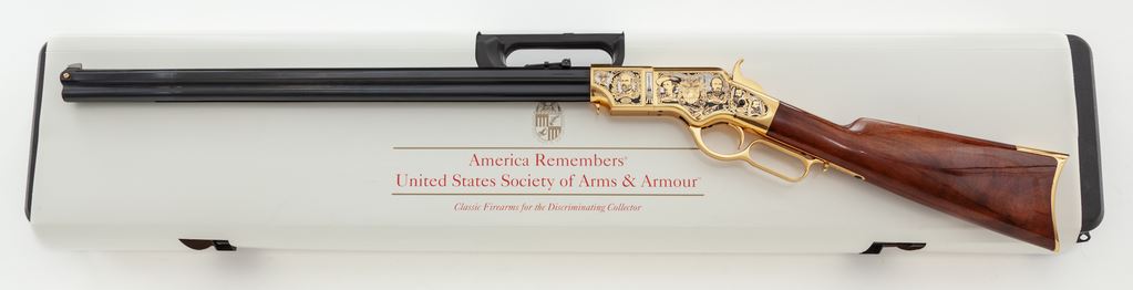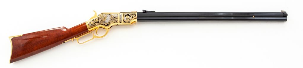 Limited Production America Remembers Uberti Henry Lever Action West Point Civil War Tribute Rifle, #19090, and is #152 of 300. Chambered in .44-40 cal., with a 24.25'' blued barrel, and 24k gold-plated receiver, lever, and crescent-shaped buttplate. Both sides of the receiver with extensive Civil War themed decorations as well as several portraits, including Custer, S. Jackson, R.E. Lee, U.S. Grant, etc. Straight grip walnut stock with a high gloss finish. This rifle includes a black plastic Gun Guard case with white outer America Remembers cardboard wrap, cable lock, maroon colored protective sleeve, America Remembers cleaning cloth, and plain white shipping box. In excellent as new and unfired condition. Est.: $1,000-$1,500. (Modern)(Sierra Sid's Casino, Sparks, NV.)