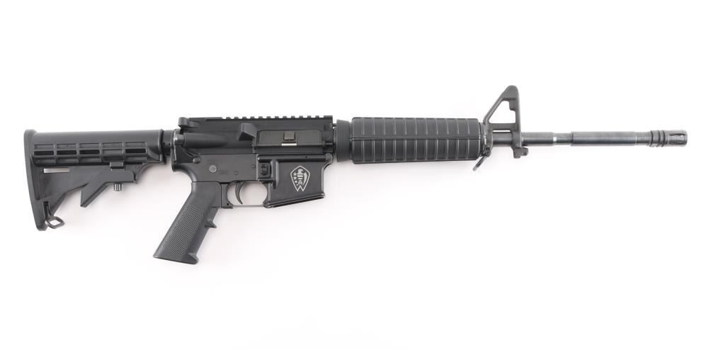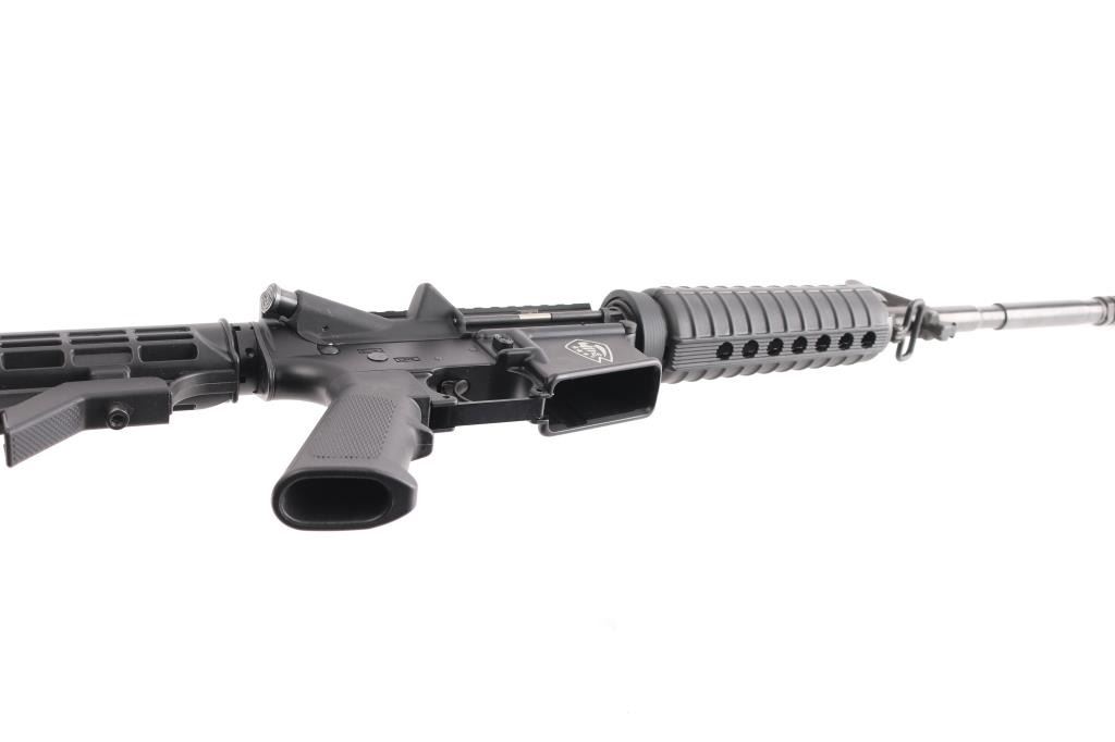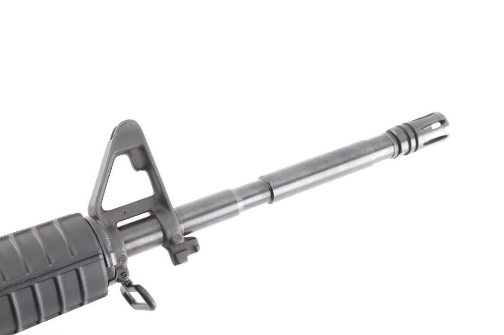 AR style semi-automatic rifle chambered in 5.56 NATO. Features a blued 16" barrel with a 1/9 inch twist and A1 M4 profile flash hider, front sight with bayonet lug and sling swivel, carbine length gas system, slim black round polymer handguards, black Picatinny flat top receiver with ejection port cover and forward assist. Ken Elmore style black polymer retractable butt stock with sling swivel, standard AR style lower receiver with smooth trigger, black polymer checkered pistol grip, thumb lever safety & push button magazine release. Retains approximately 95% of it's finish with little to no edge wear overall. No magazine or rear sight. Bore is pristine and shiny.