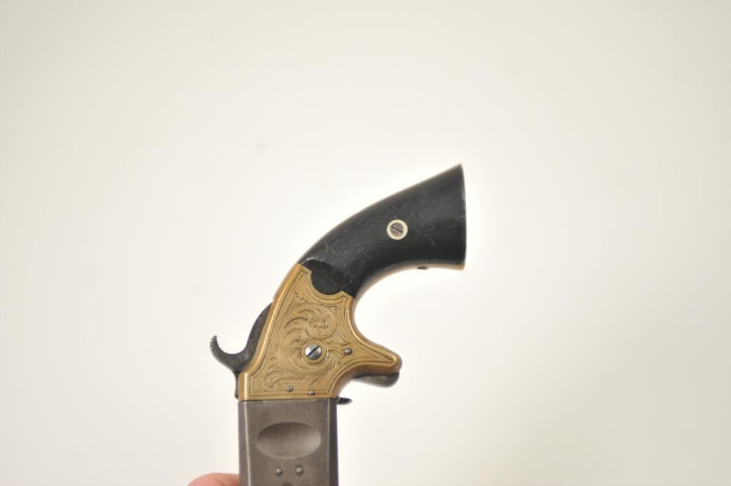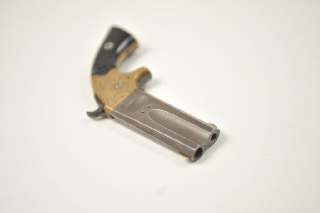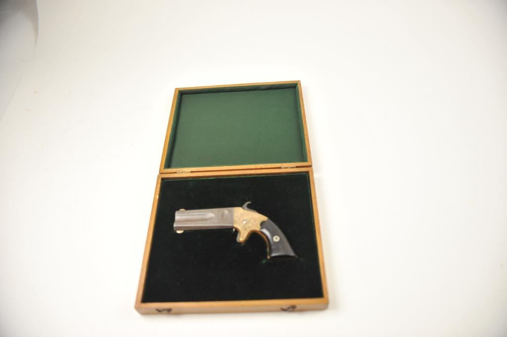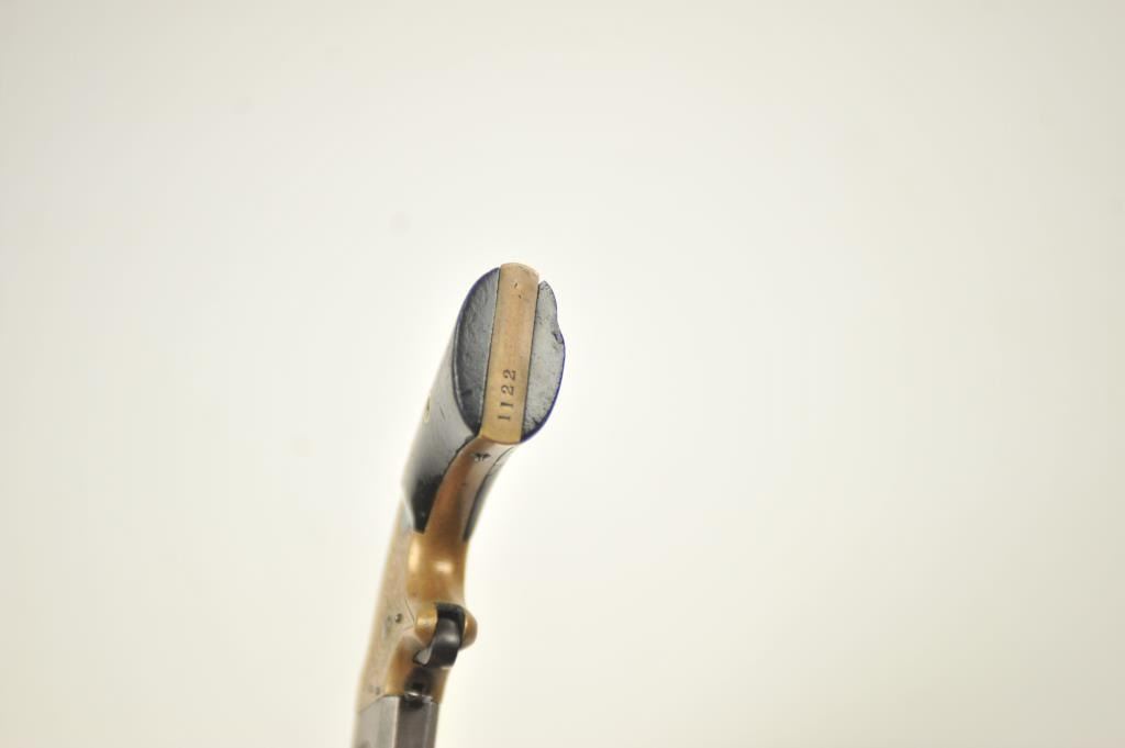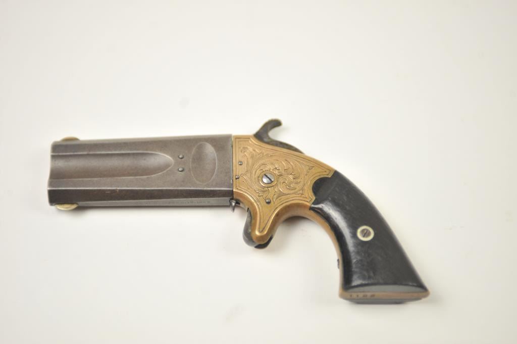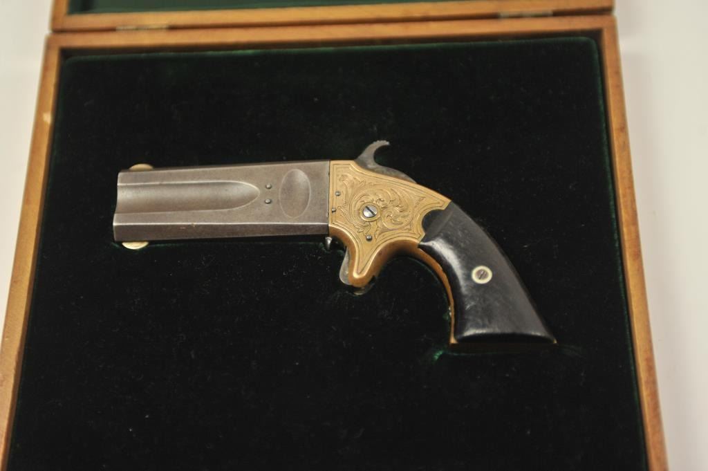 American Standard Wheeler’s Paten O/U Derringer in .22/.32 caliber with original New York Scroll engraving and select wood grips, S/N 1122. Remains in very good condition showing traces of blue on thebarrel and uncleaned and sharp brass frame with traces of gold gilt. The grips are good with minor losses and even wear and aging. Good markings and working action. In modern display case. (Antique) Est.: $750-$1500