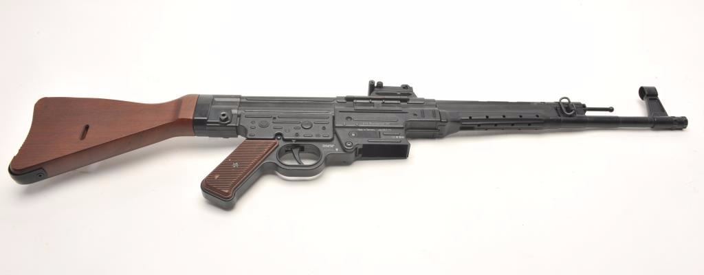 American Tactical by GSG STG44 Schmeisser semi-auto rifle, .22 L.R. caliber, serial #535096. The rifle is in very good overall condition with an 18” barrel. The rifle retains nearly all of its black militaryfinish with small mars and handling marks. The wood stocks are in very good condition showing only storage marks and little use. The bore is good, the action crisp and markings are sharp. A replica of a World War II STG44 in .22 caliber, the lot includes the wooden shipping crate, canvas magazine pouches, an extra set of scales and all associated packing materials, instructions, etc. A neat piece for the re-enactor,plinker or collector. Marked made in Germany the lot does not include a magazine. (Modern) Est.: $300-$600.