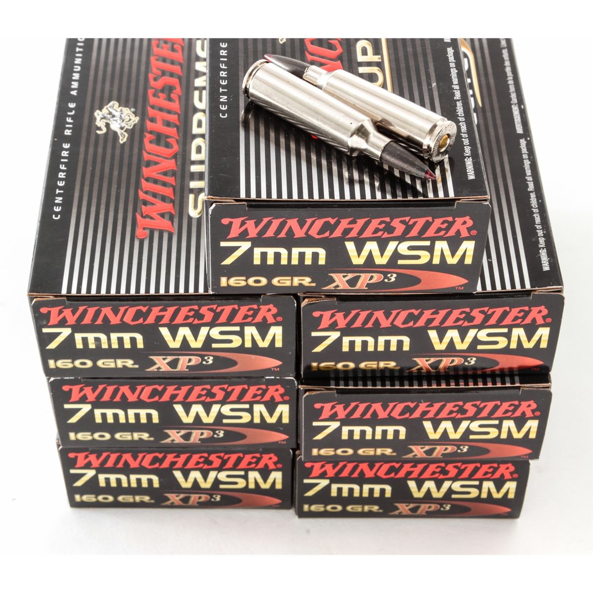 Ammo Lot: Lot of Seven (7) Boxes of Winchester Supreme Elite 7mm WSM, 160 grain XP3 cartridges, Part #SXP7WSM, 20 rounds per box. Condition is excellent, remaining new in original boxes. Retails @ $385/lot. Est.: $200-$300/lot. (Field Time)