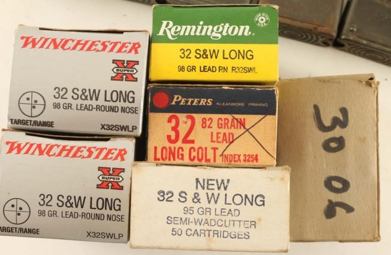 5 boxes of 32 S&W, clips, Army/Navy Service book, 30-06 in 3 clips, various brass, 12 Ga die set and other ammo.