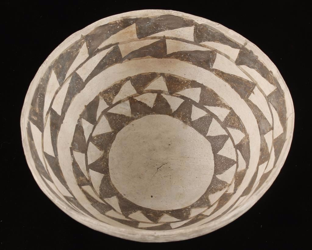 Geometric designs in bowl. 1050-1250 A.D. Has repair and small losses on rim. Measures 4"x8". Includes Statement of Authenticity and Origin of Artifact.