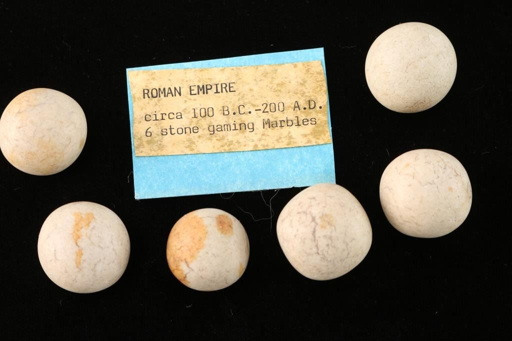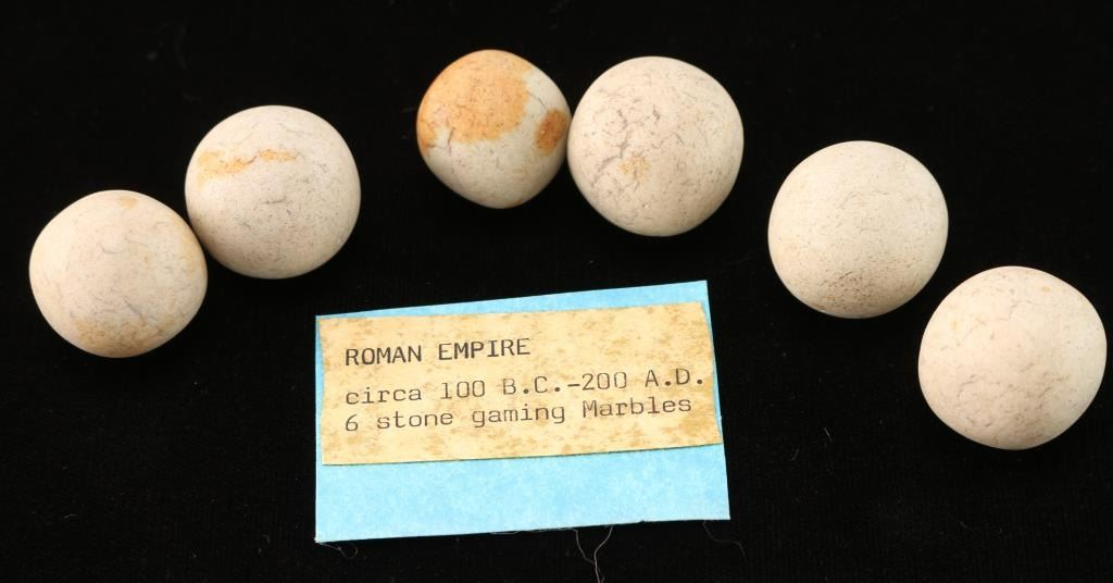 (6) white clay gaming marbles from between 100 B.C. and 200 A.D.