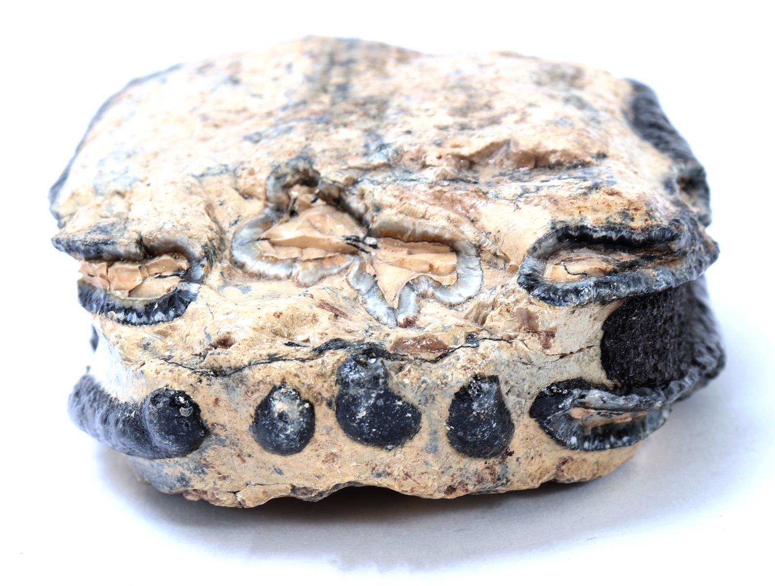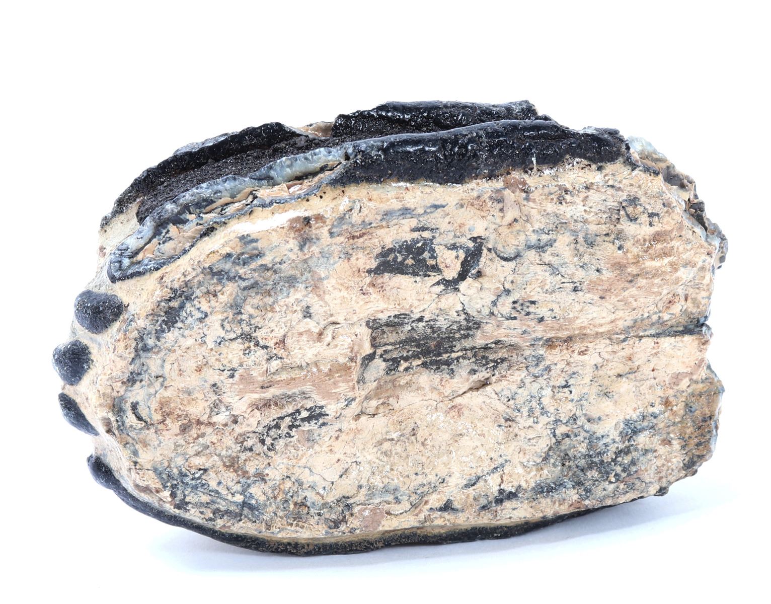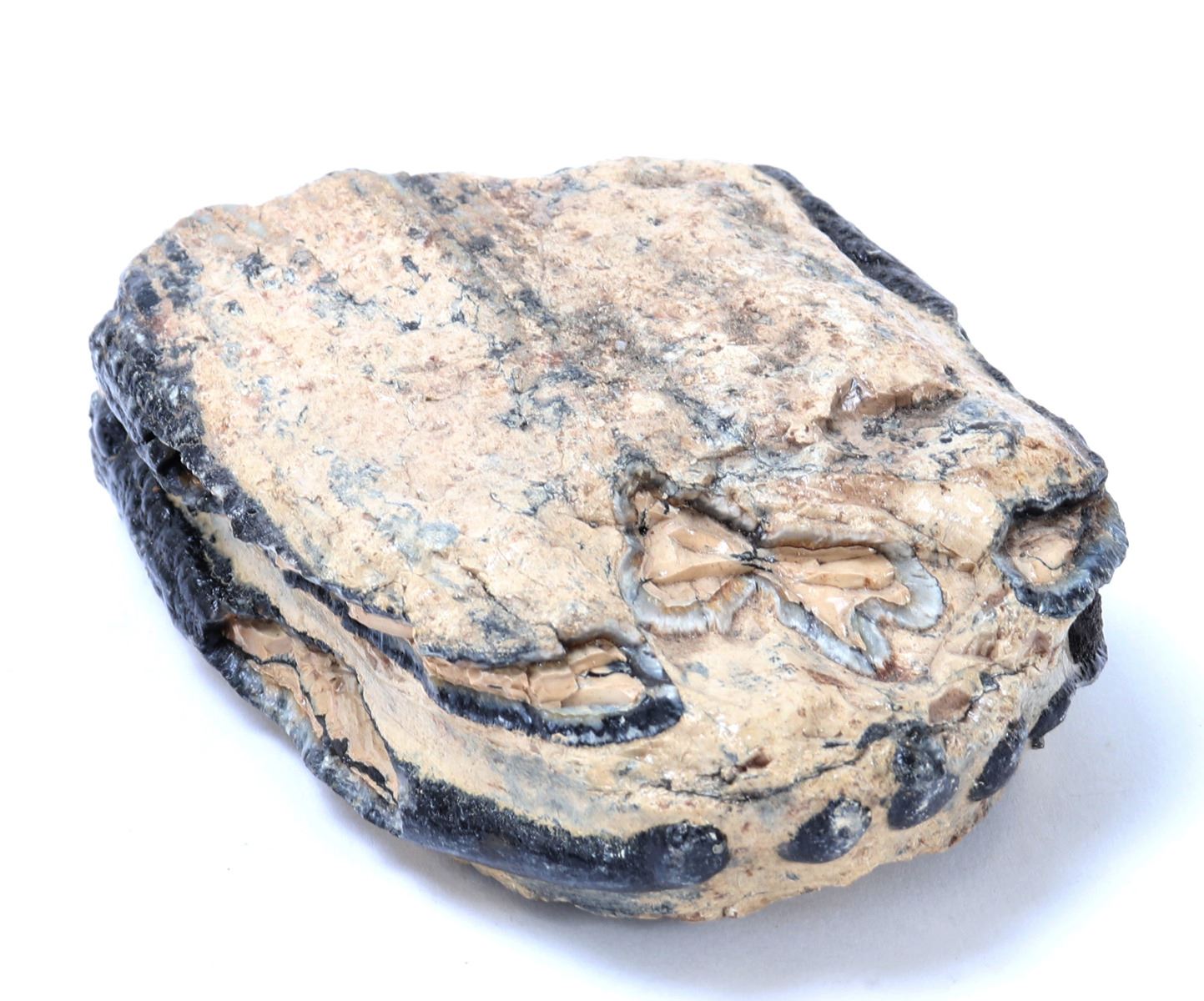 Ancient fossilized woolly mammoth molar section with natural earth deposits still remaining. Woolly mammoth were known for each grasses, sedges, and other vegetation, making it so they didn't require sharp canines like others. Size 5" L, Weight 556 g. Condition: Well overall preserved condition.