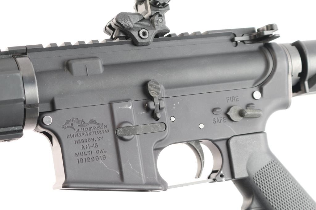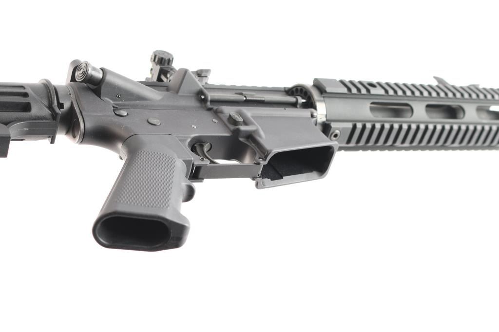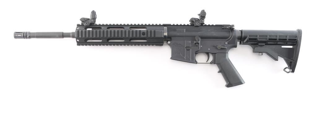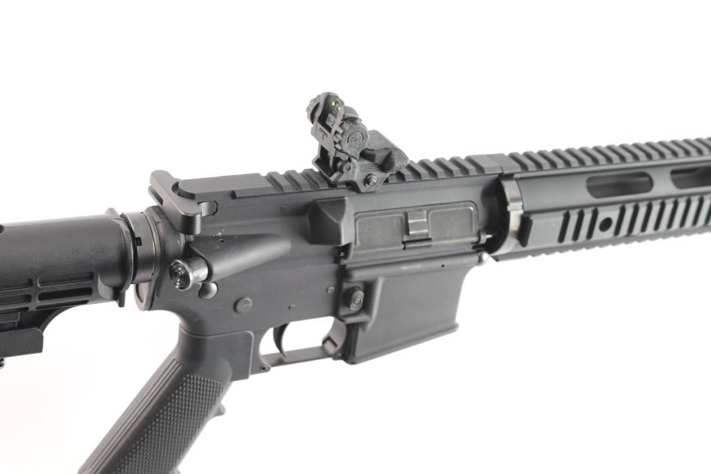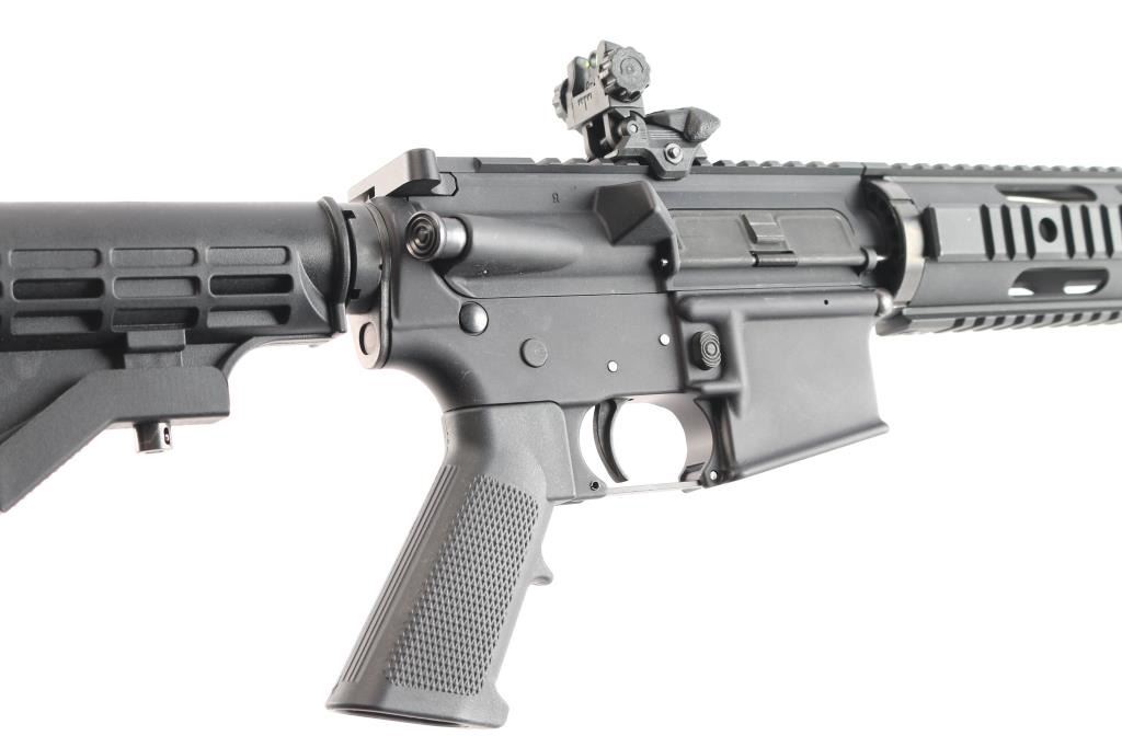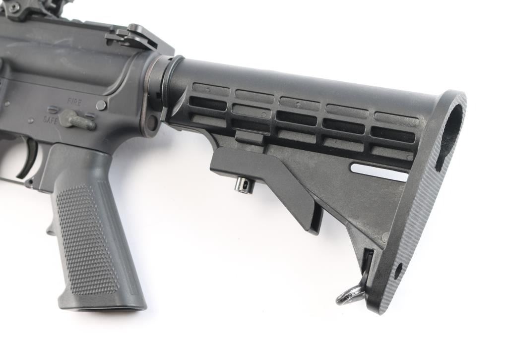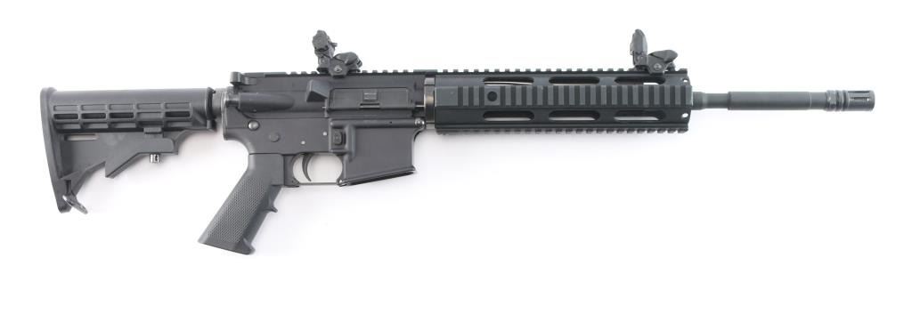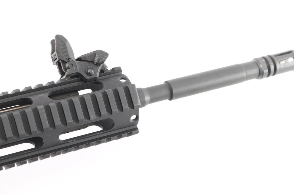 Semi-automatic direct impingement operated AR15 style rifle chambered in 5.56 NATO. Features a matte black finish, 16" M4 profile barrel with 1/7 twist, A2 flash hider, 10" free-float quad-rail handguard with QD points, A2 pistol grip and M4 telescoping buttstock, front flip-up adjustable sight w/red fiber optic insert and rear flip-up sight with green fiber optic inserts, manual safety. Flattop receiver with ejection port cover, forward assist, shell deflector, push button mag release, standard curved trigger and charging handle. Bore is excellent. Retains approx. 97% finish with a couple of scratches and dings on the receiver. No magazine. Condition is NRA Very Good. *** Modern Firearm ***