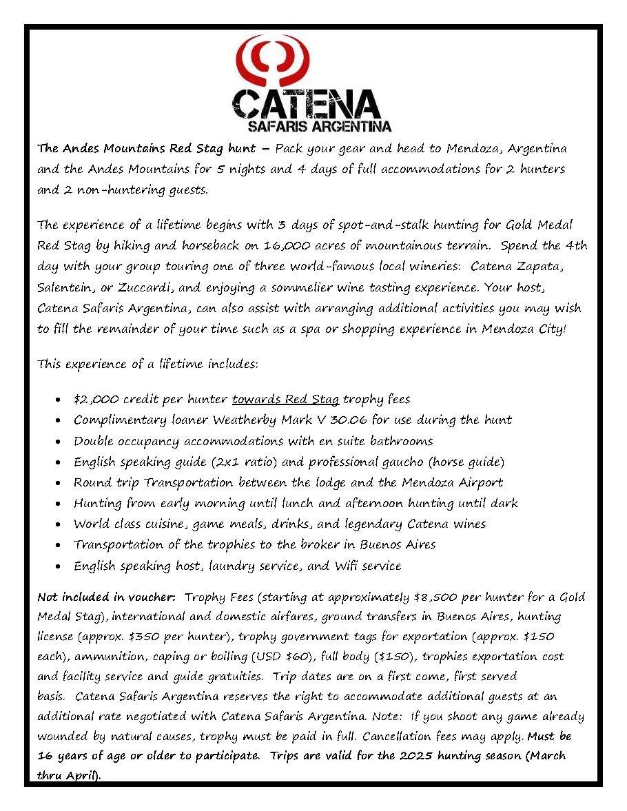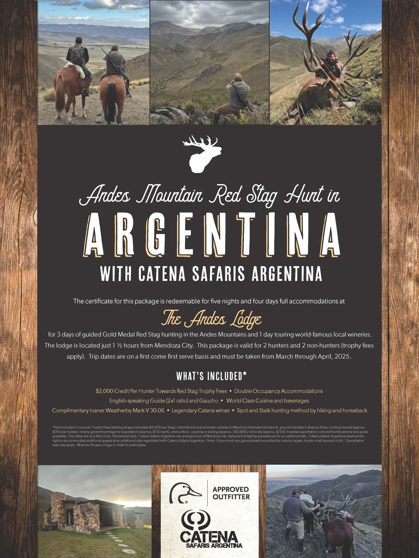 Pack your gear and head to Mendoza, Argentina and the Andes Mountains for 5 nights and 4 days of full accommodations for 2 hunters and 2 non-huntering guests. The experience of a lifetime begins with 3 days of spot-and-stalk hunting for Gold Medal Red Stag by hiking and horseback on 16,000 acres of mountainous terrain. Spend the 4th day with your group touring one of three world-famous local wineries: Catena Zapata, Salentein, or Zuccardi, and enjoying a sommelier wine tasting experience. Your host, Catena Safaris Argentina, can also assist with arranging additional activities you may wish to fill the remainder of your time such as a spa or shopping experience in Mendoza City! This experience of a lifetime includes: $2,000 credit per hunter towards Red Stag trophy fees, Complimentary loaner Weatherby Mark V 30.06 for use during the hunt, Double occupancy accommodations with en suite bathrooms, English speaking guide (2x1 ratio) and professional gaucho (horse guide), Round trip Transportation between the lodge and the Mendoza Airport, Hunting from early morning until lunch and afternoon hunting until dark, World class cuisine, game meals, drinks, and legendary Catena wines, Transportation of the trophies to the broker in Buenos Aires, English speaking host, laundry service, and Wifi service. Not included in voucher: Trophy Fees (starting at approximately $8,500 per hunter for a Gold Medal Stag), international and domestic airfares, ground transfers in Buenos Aires, hunting license (approx. $350 per hunter), trophy government tags for exportation (approx. $150 each), ammunition, caping or boiling (USD $60), full body ($150), trophies exportation cost and facility service and guide gratuities. Trip dates are on a first come, first served basis. Catena Safaris Argentina reserves the right to accommodate additional guests at an additional rate negotiated with Catena Safaris Argentina. Note: If you shoot any game already wounded by natural causes, trophy must be paid in full. Cancellation fees may apply. Must be 16 years of age or older to participate. Trips are valid for the 2025 hunting season (March thru April).