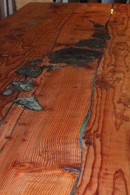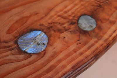 Now as a table it is adorned with even older labradorite stones that glisten like the stars with green and blue lights shining from the iridescent stones alongside Russian soap stones in a formation of a bar galaxy.
