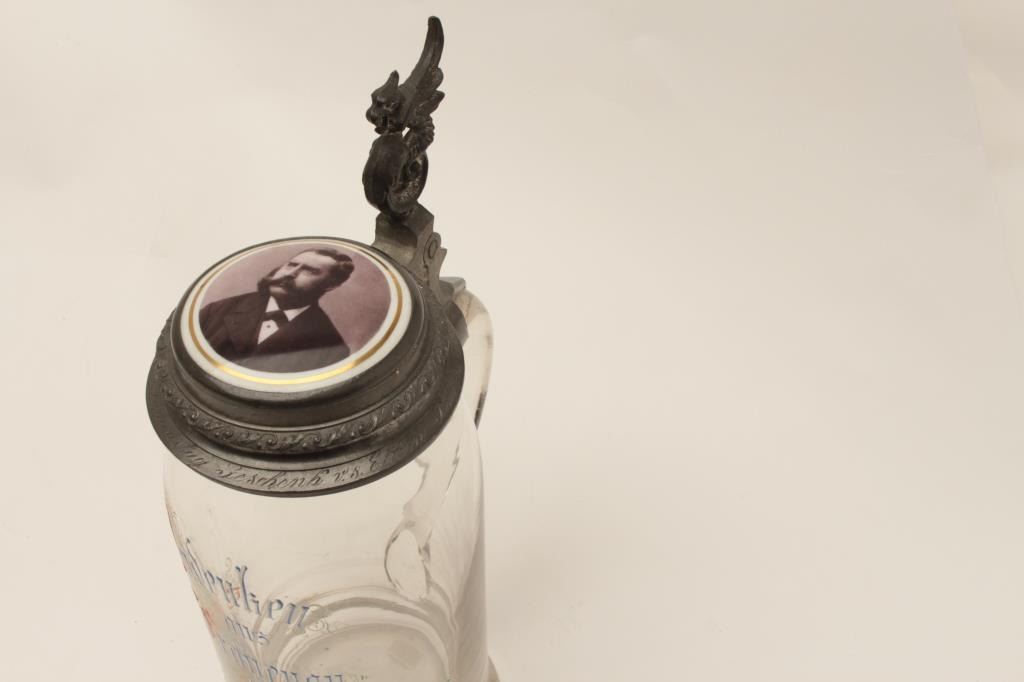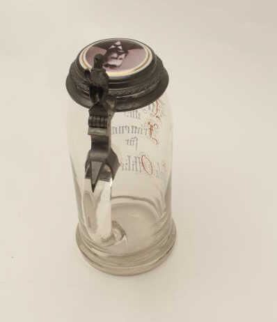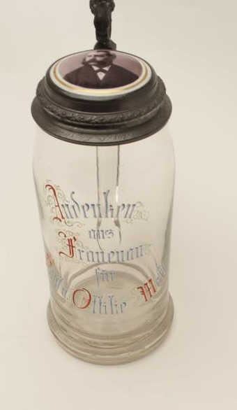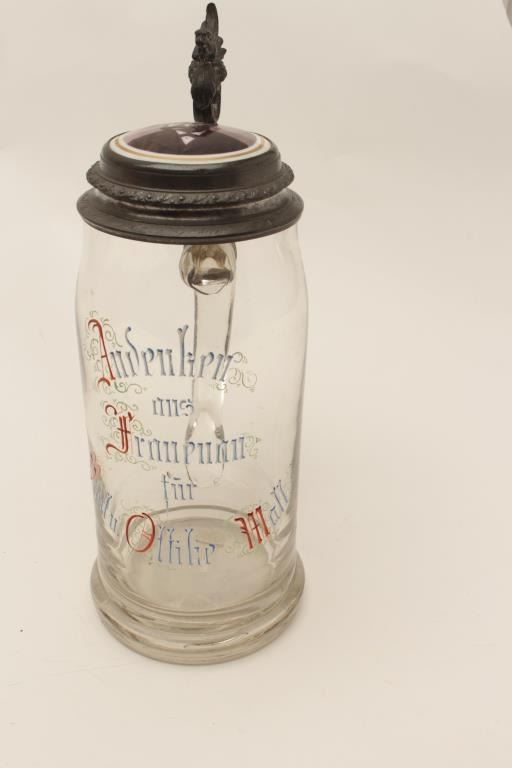 Anniversary stein, hand painted on glass with porcelain portraits of man and wife in lid; beautiful inscription around edge of lid; 11” in height, ca. 1890-1900’s. Est.: $150-$300.