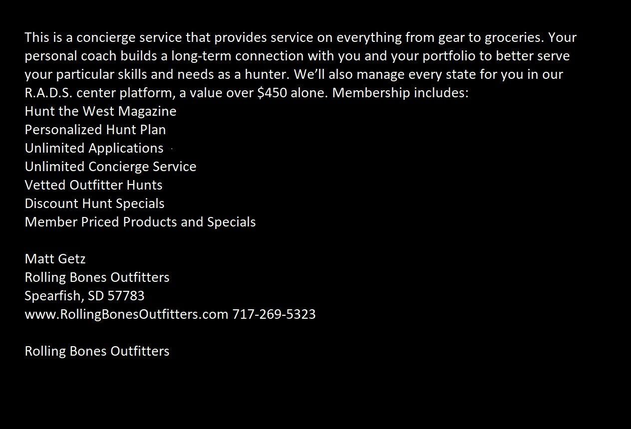 This is a concierge service that provides service on everything from gear to groceries. Your personal coach builds a long-term connection with you and your portfolio to better serve your particular skills and needs as a hunter. We’ll also manage every state for you in our R.A.D.S. center platform, a value over $450 alone. Membership includes: