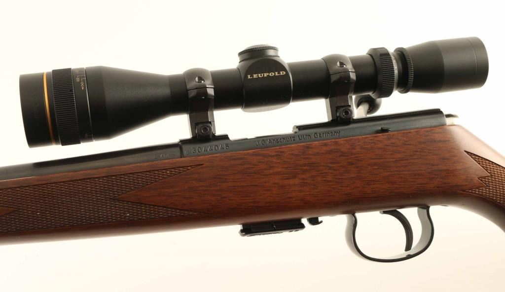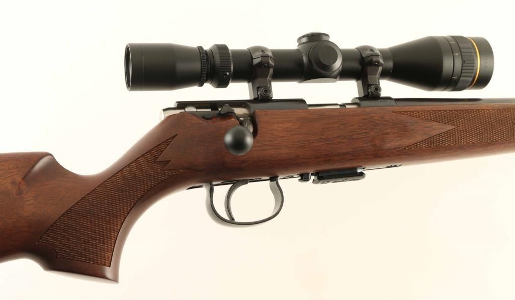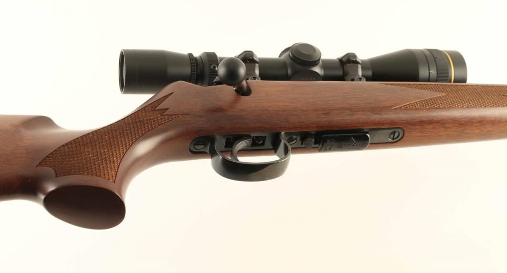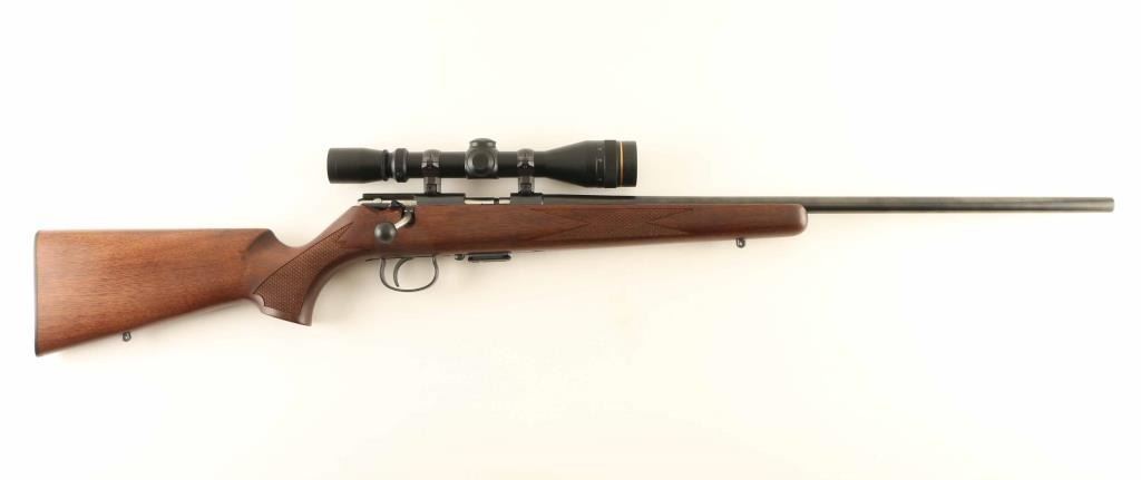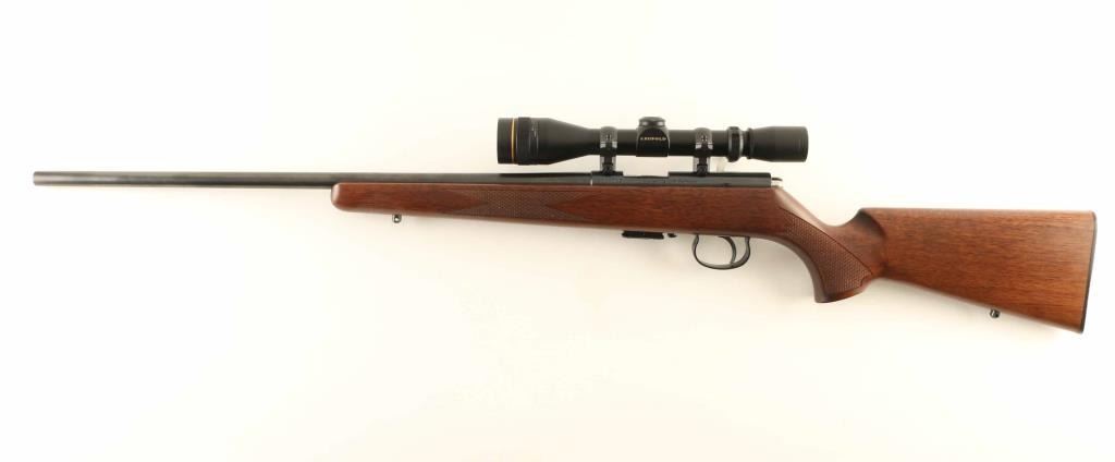 German bolt action rifle imported by Merkel USA. Features blued finish, wood stock with checkering at wrist & forend, flat plastic buttplate, sling studs, 23" barrel, no sights, receiver dovetail scope mount, detachable magazine,manual safety. Bore is excellent. Overall condition is like new with few signs of handling. Mounts a Leupold VX-II Rimfire EFR 3-9x33mm scope with duplex reticle, excellent view, adjustable objective, neoprene scope cover. Includes (1) magazine, factory box with manual. Condition is NRA Excellent - like new *** Modern Firearm ***