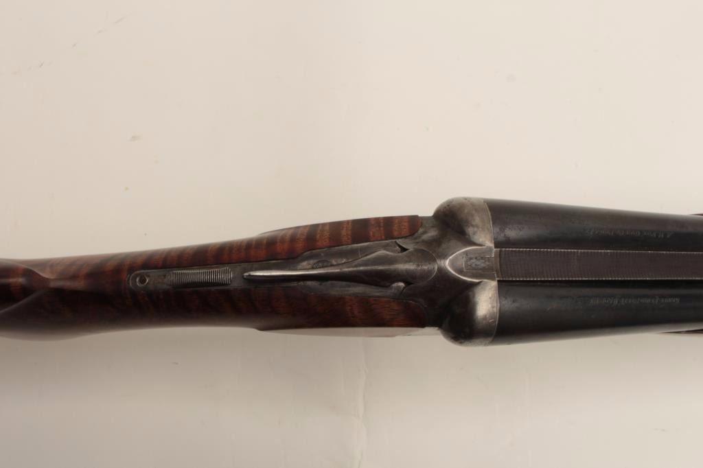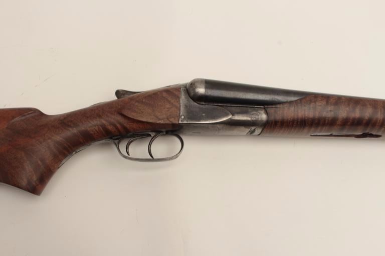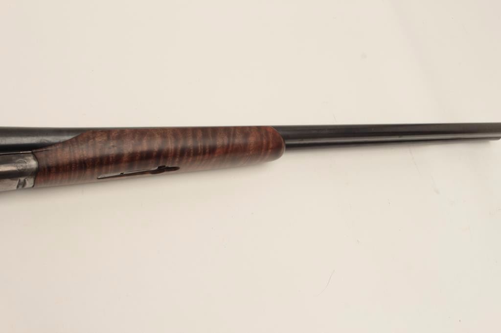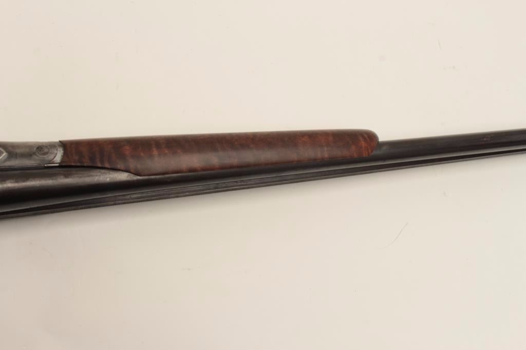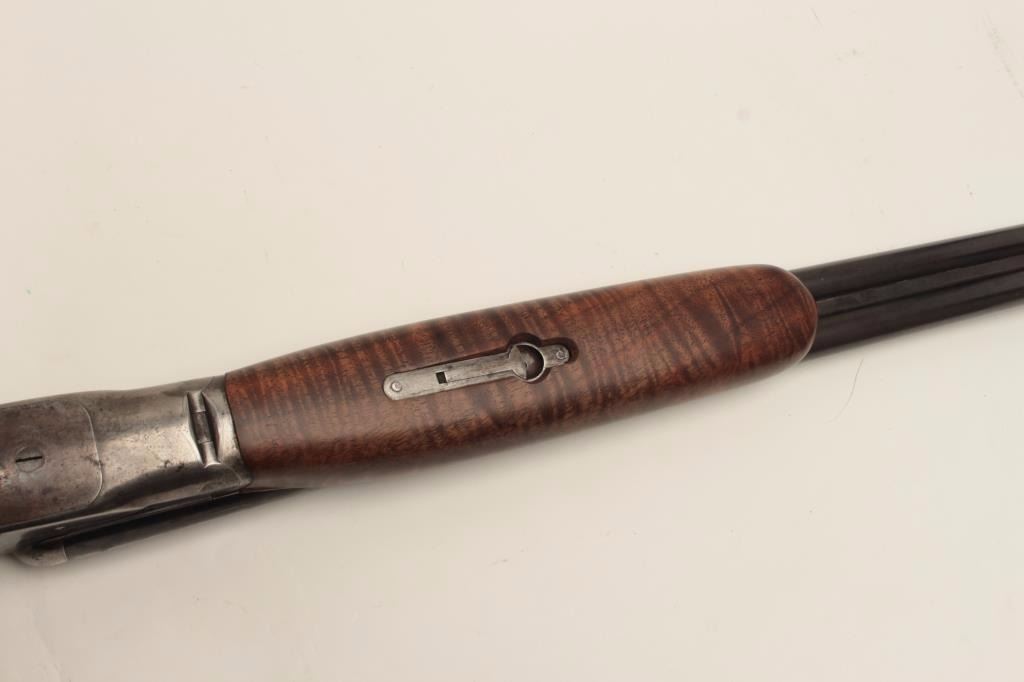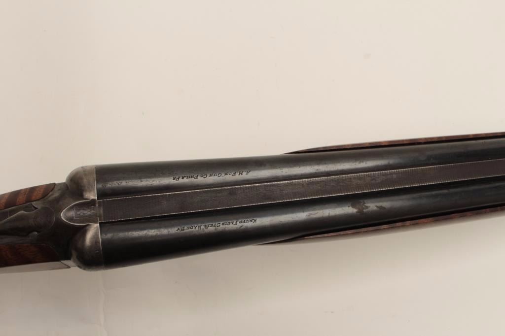 Ansley H. Fox SxS hammerless shotgun, 12 gauge, 30” barrels, double triggers, deluxe finely grained wood stocks, blued finish, S/N 19829, in overall very good + condition showing majority of blue remaining on barrelassembly and considerable blue on the receiver, very good to near fine bores, crisp actions, sharp marking and fine stocks that are likely custom to this gun; Decelerator hard rubber butt pad. (C&R/No PPT).Est.: $400-$800.