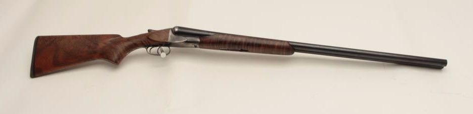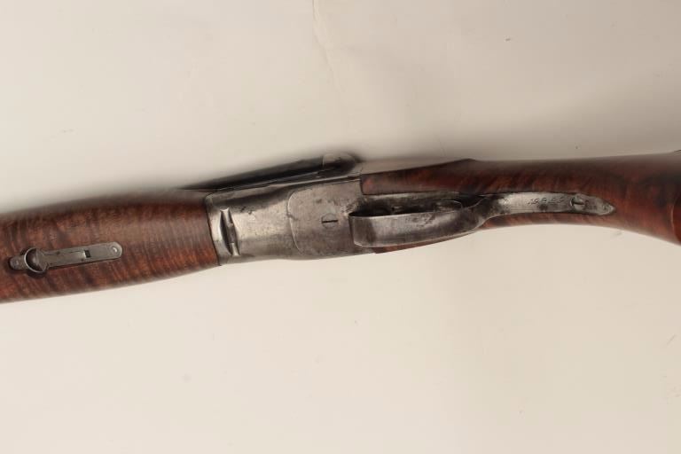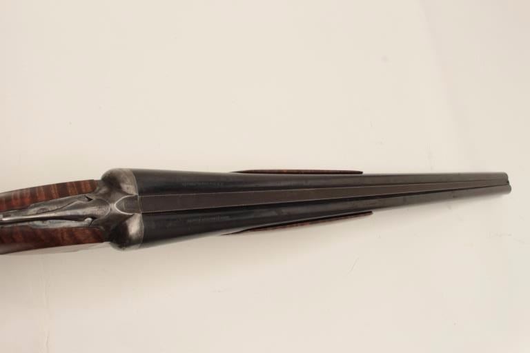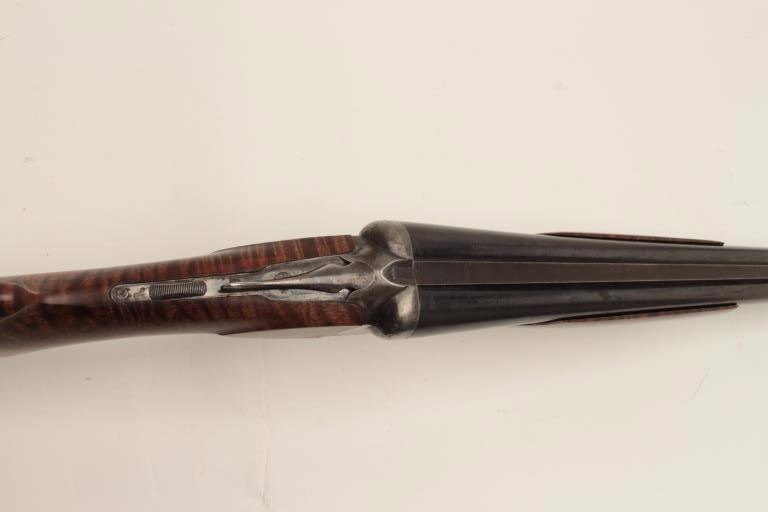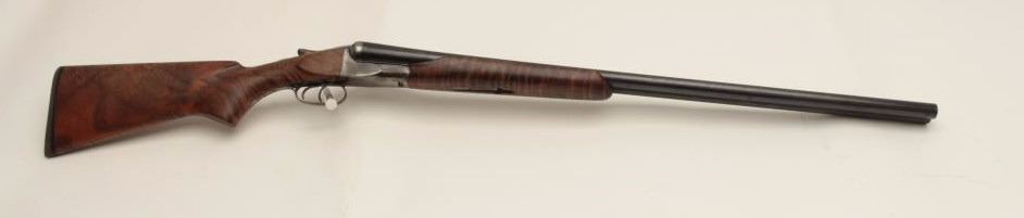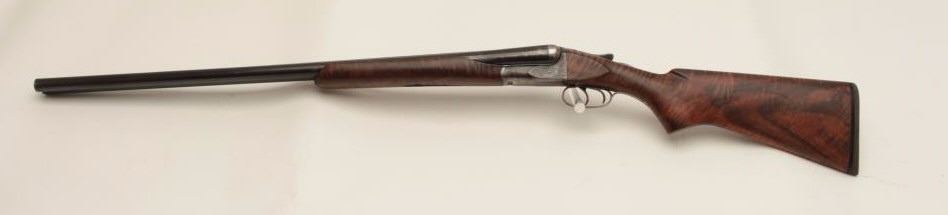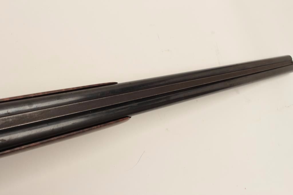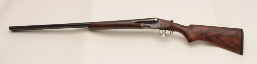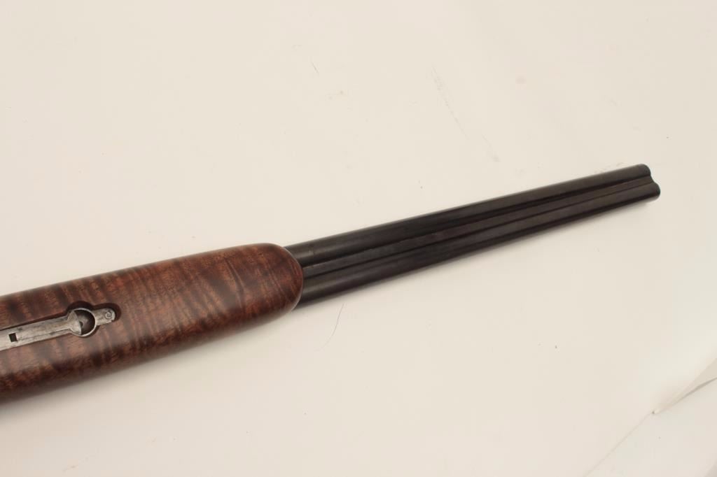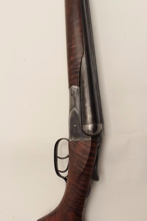 Ansley H. Fox SxS hammerless shotgun, 12 gauge, 30” barrels, double triggers, deluxe finely grained wood stocks, blued finish, S/N 19829, in overall very good + condition showing majority of blue remaining on barrelassembly and considerable blue on the receiver, very good to near fine bores, crisp actions, sharp marking and fine stocks that are likely custom to this gun; Decelerator hard rubber butt pad. (C&R/No PPT).Est.: $400-$800.