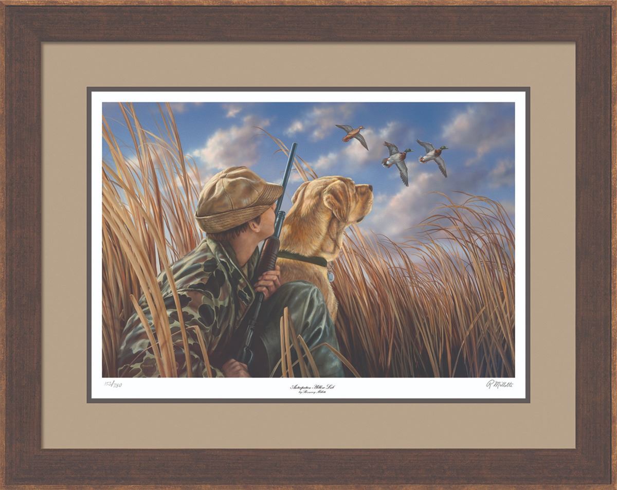 Rosemary Millette lives in South Dakota and finds subjects for her paintings in the outdoors around her. In Anticipation, a young hunter and his companion wait for the right moment as mallards fly overhead.