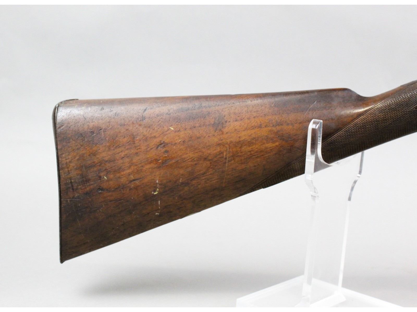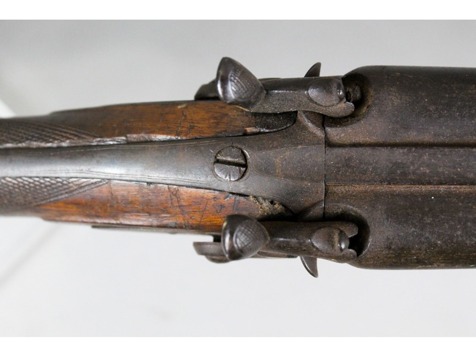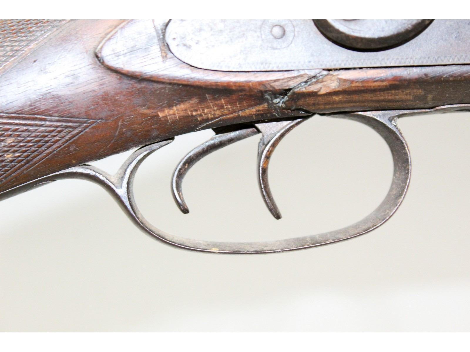 Antique, probably Belgian made SxS 12GA black powder shotgun. Sold as wall hanger only. Not safe to shoot. Stock is cracked by trigger. Both nipples broken. Has CVA ramrod.