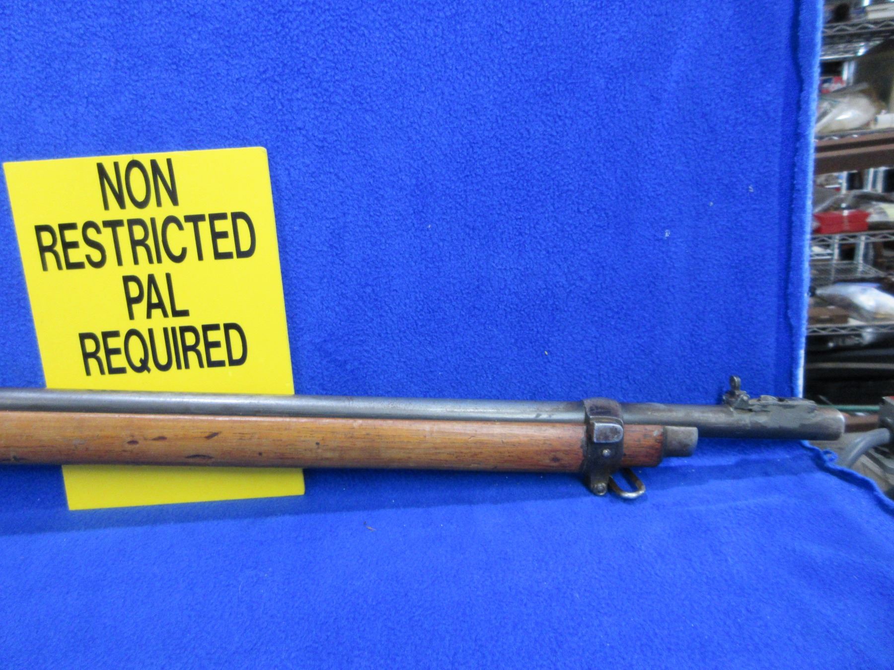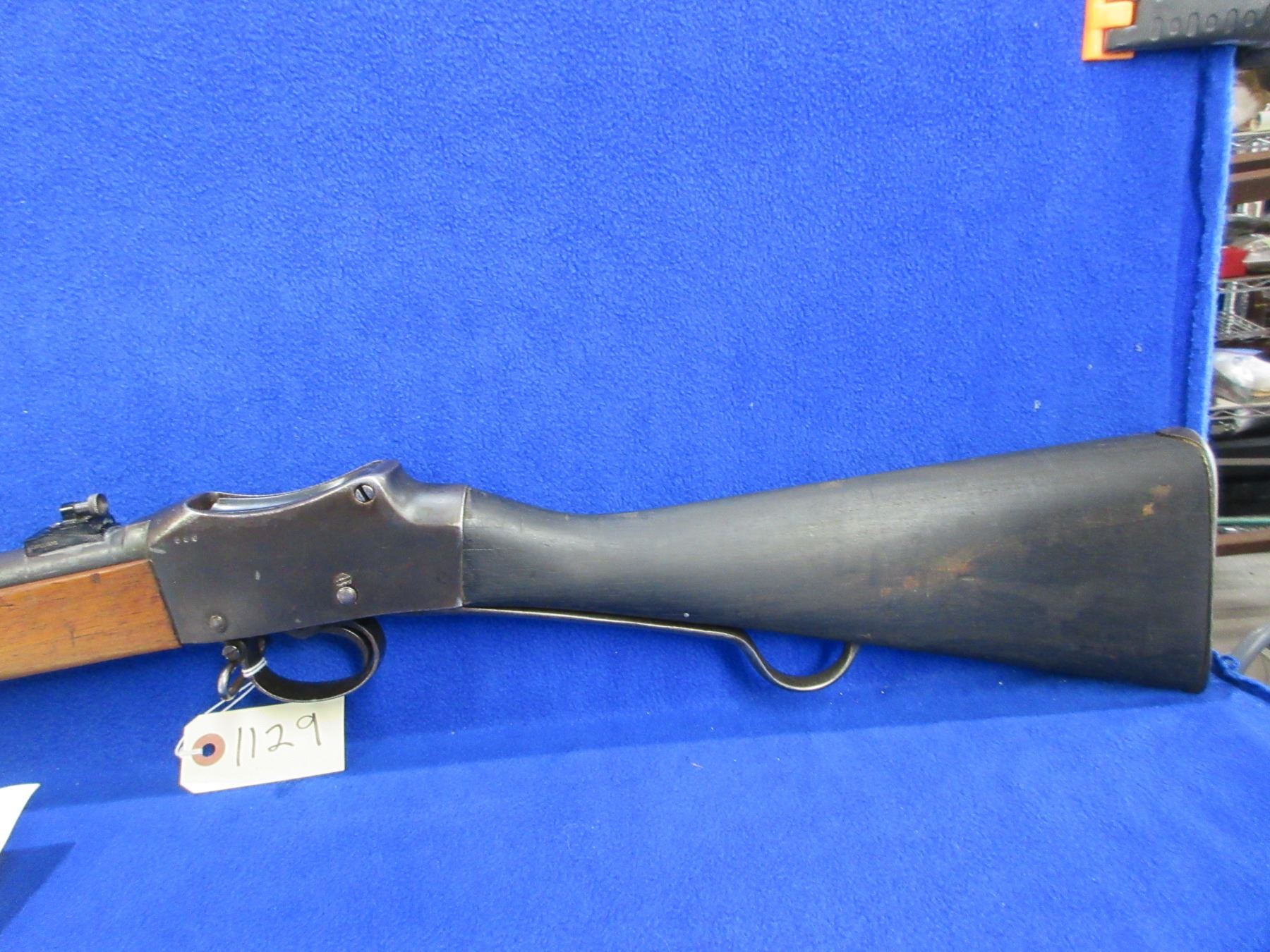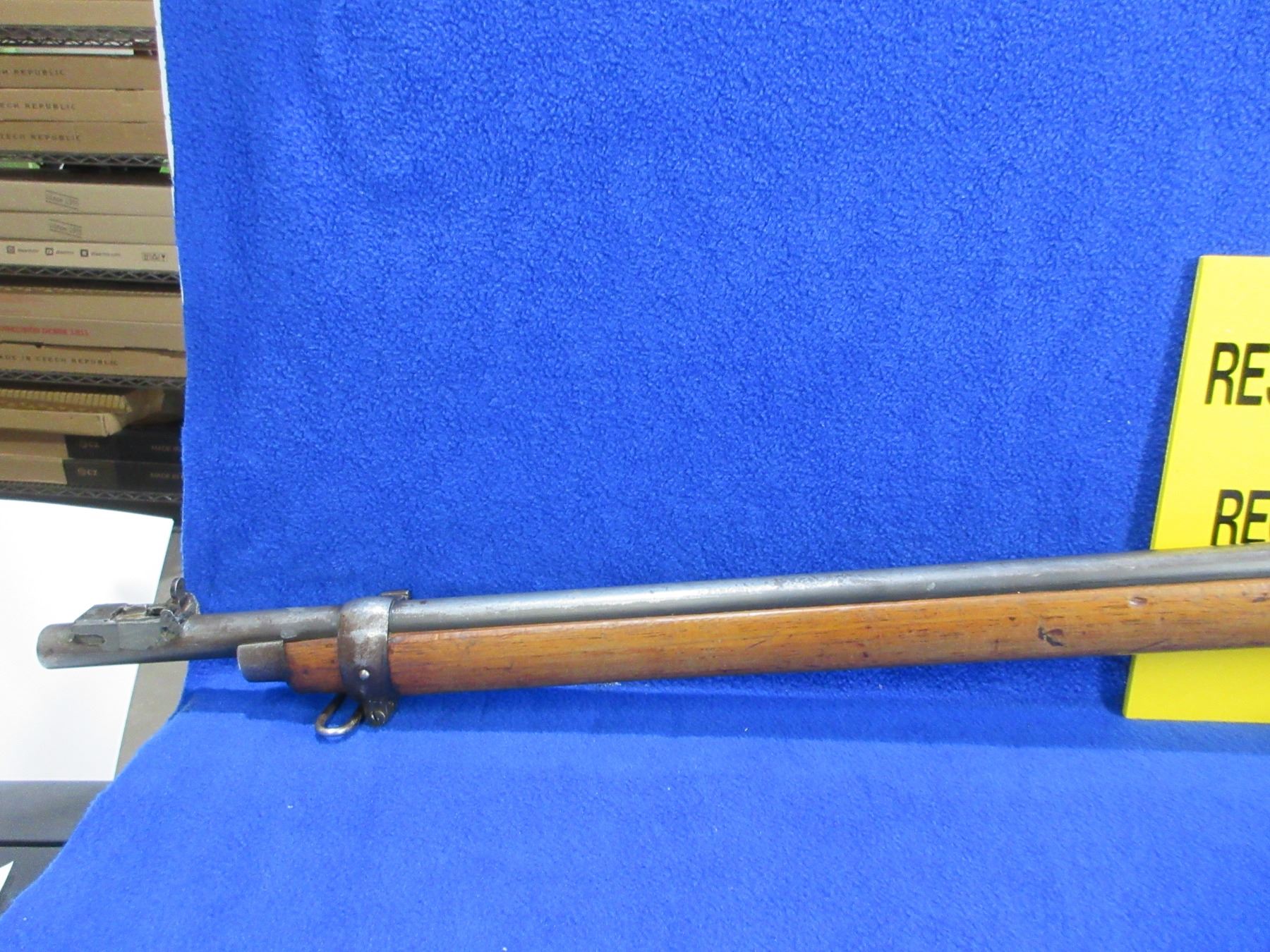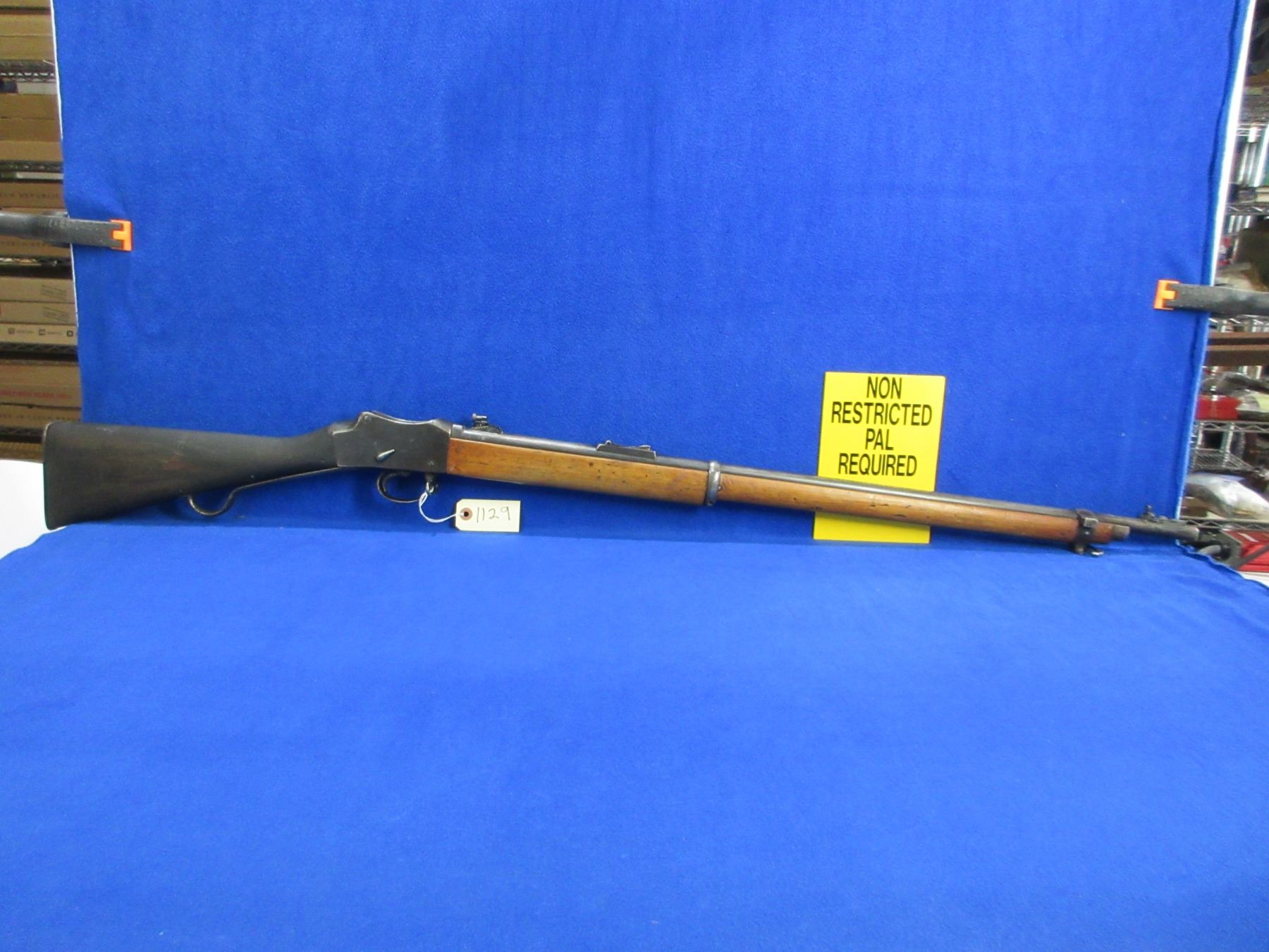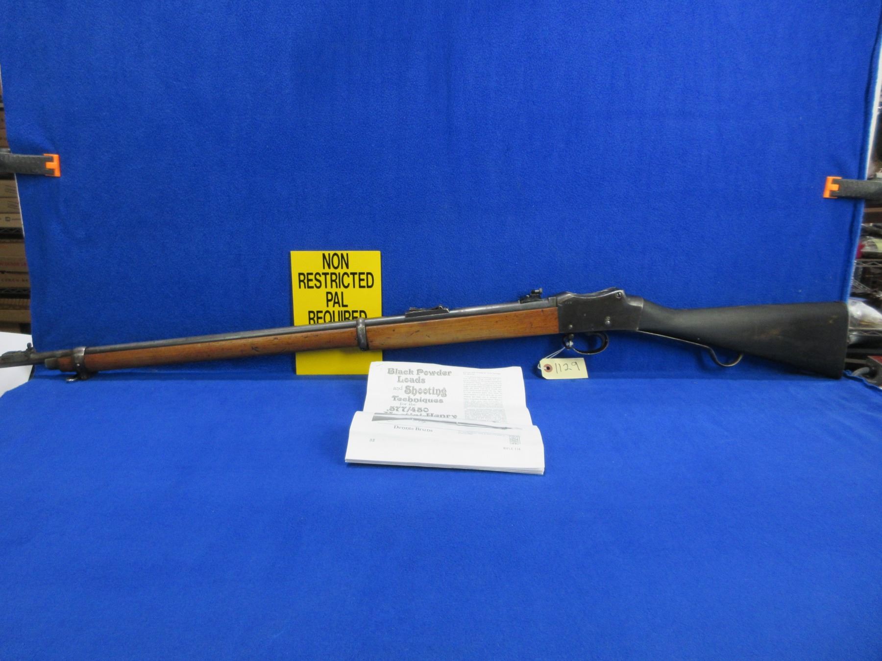 Antique - 1887 Martini Henry in 577/450 - This single shot falling block rifle appears to be in good to very good working order. Barrel is 24", rifling is good to very good for age, bluing is patchy and grey, has sights but missing parts of original rear sight, front sight modified, added rear peep sight, stock is a completely different color than forearm and has been sanded and refinished. forearm good to very good for age, metal butt plate good, comes with swivels. Missing the cleaning rod. Comes with paperwork for loads and shooting techniques. Ser # 588