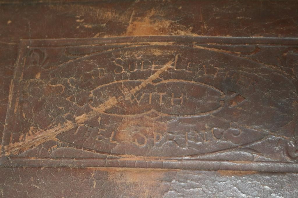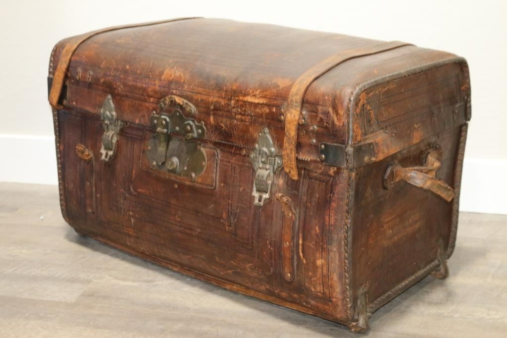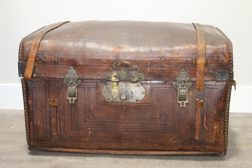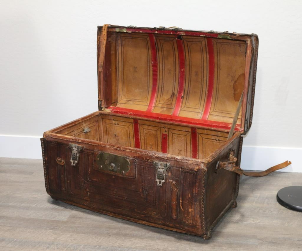 Rounded top of this stagecoach trunk inscribed, "Solid Sole Leather With Steel Springs" with tooled design, and sides of trunk are inscribed, "D.P. Graves, Orange City, Fl." Both leather straps in front are broken but a piece is inside along with one buckle. The brass front closure is broken on one side. Condition commensurate with age and much use. Measures 19" tall by 32 1/2" wide and 18 1/2" deep. On rollers.