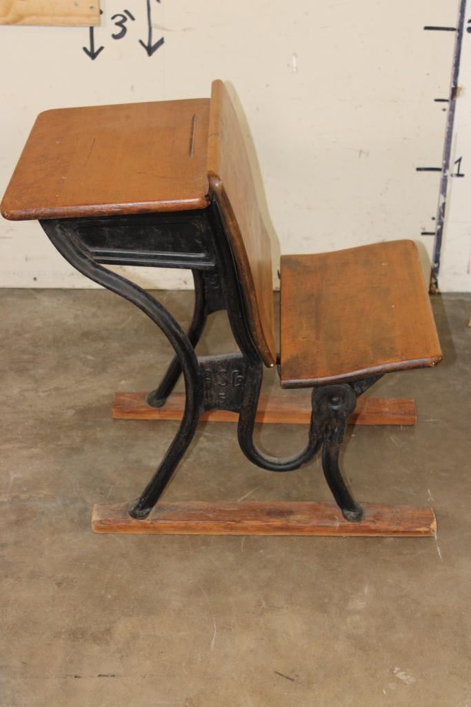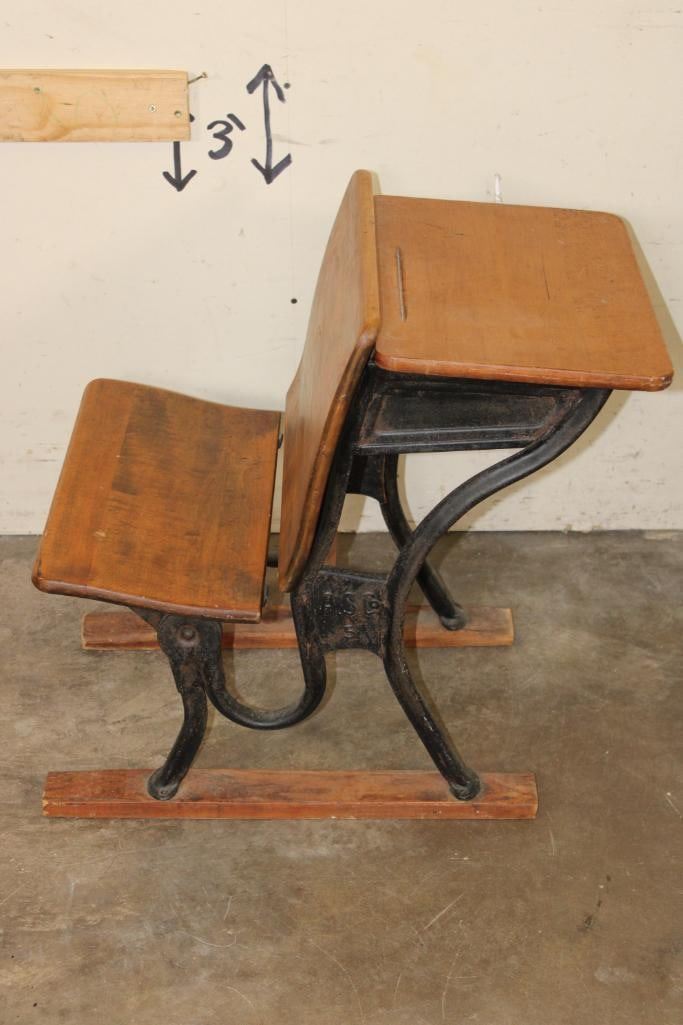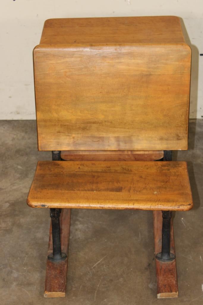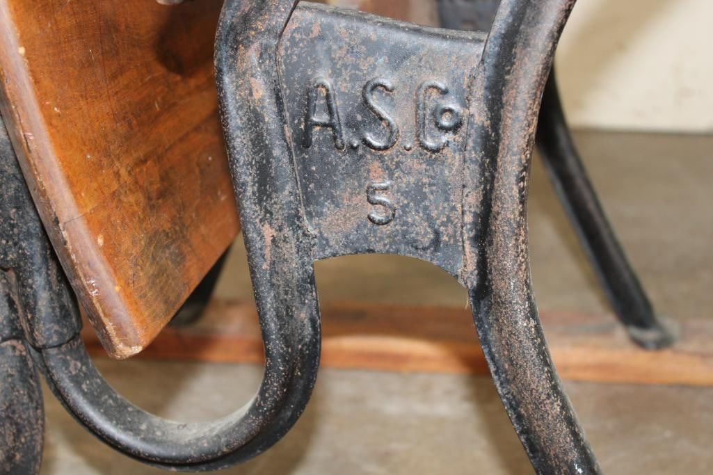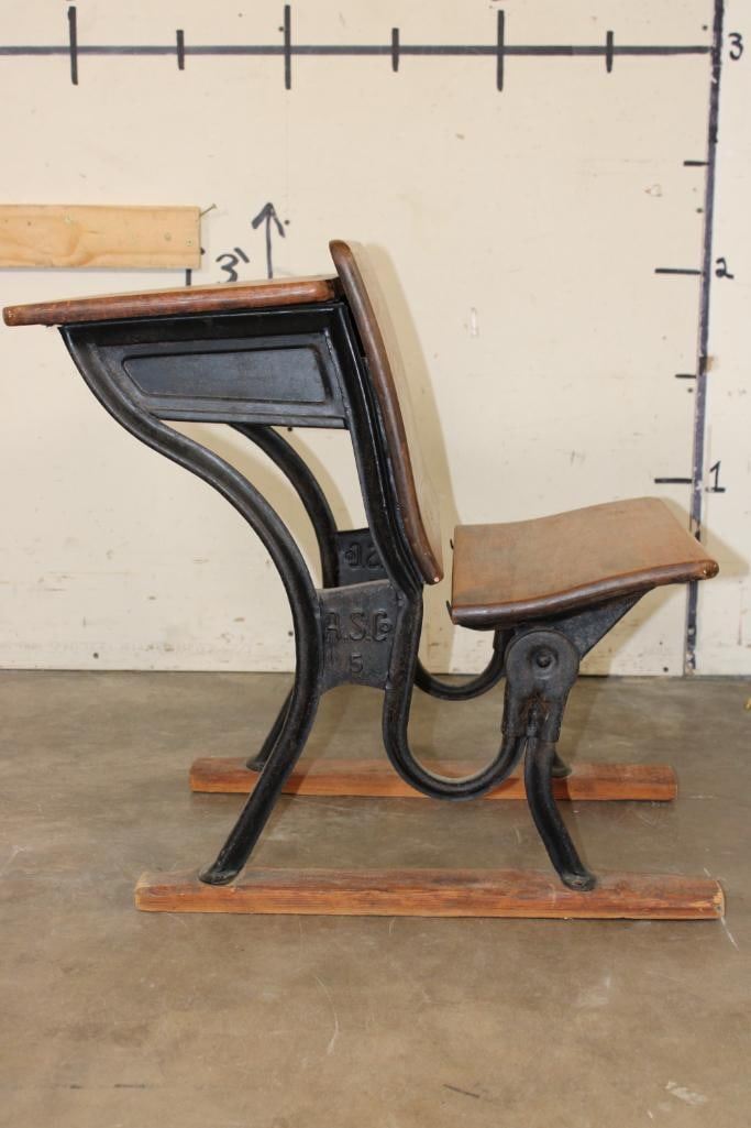 Antique "American Seating Company" SCHOOL DESK with a Folding Seat. It is made of Wood and Iron and measures 28" Long x 17.5" Wide x 26" Tall. It is stamped "A.S.Co 5". ANTIQUE DESKS AND FURNITURE