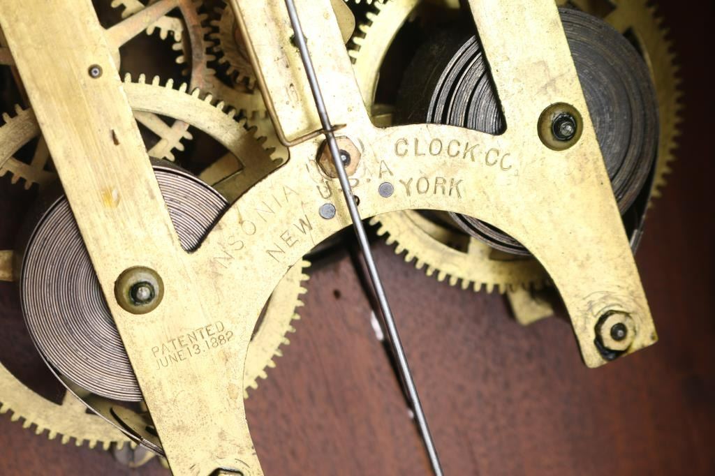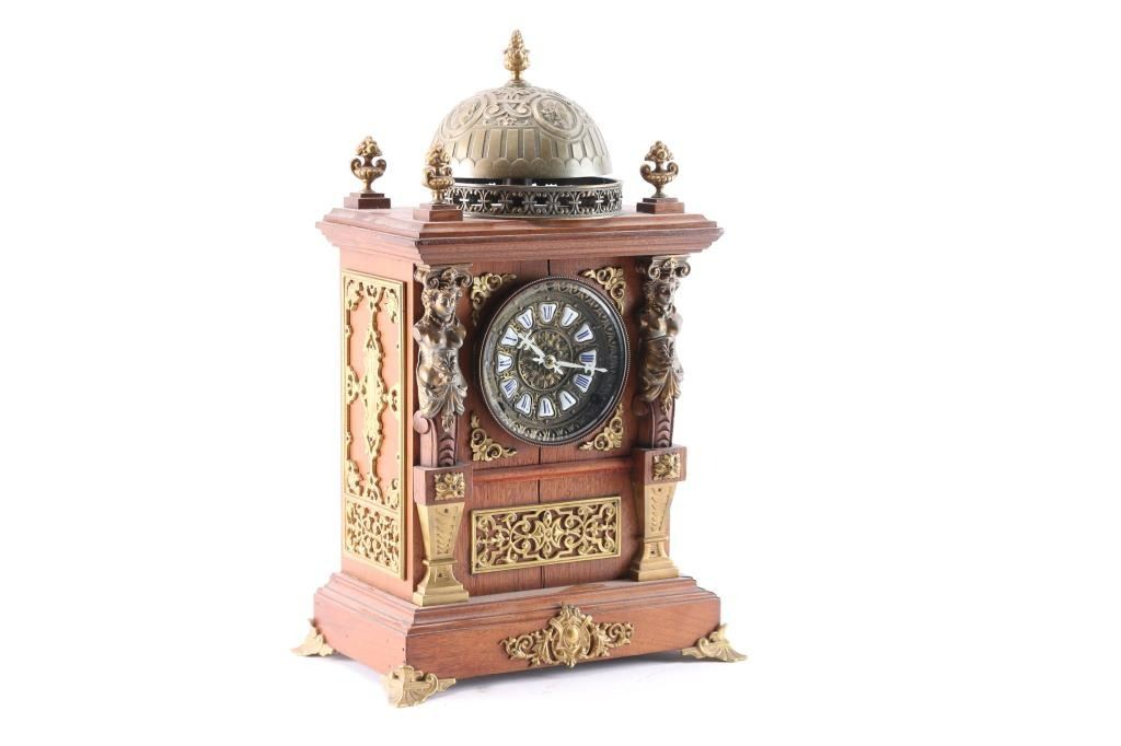 No. 1, features a wooden case with ornate gilt decoration, including figural caryatids on the corners and a large metallic dome on top. Has a brass faced dial with black Roman numerals. Ansonia Clock Company produced this model around 1894 and it is an example of late 19th century American horological craftsmanship. ***Buyer Must Arrange Shipping***