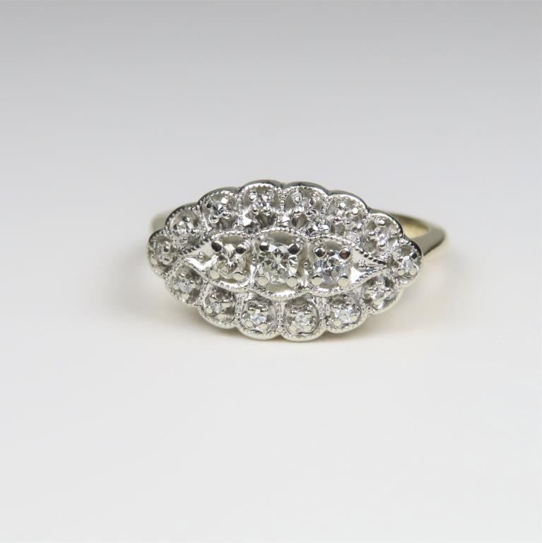 featuring 17 round cut Diamonds with G-H colors and VS clarity set in a highly detailed setting crafted in a combination of 14 karat yellow and white gold.