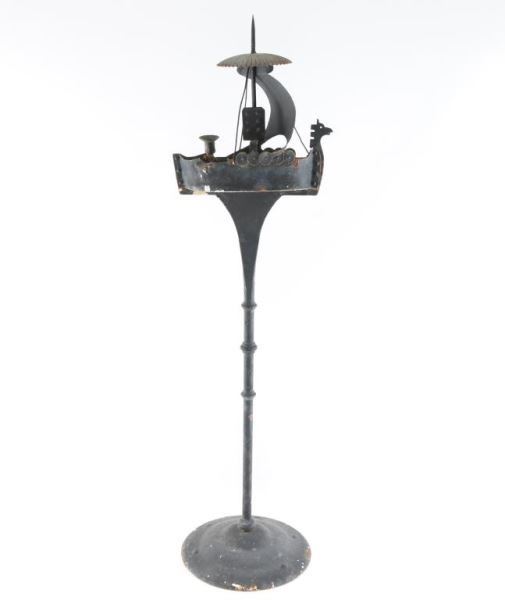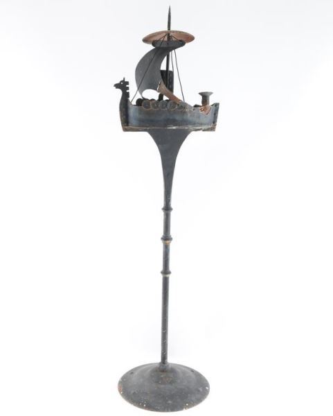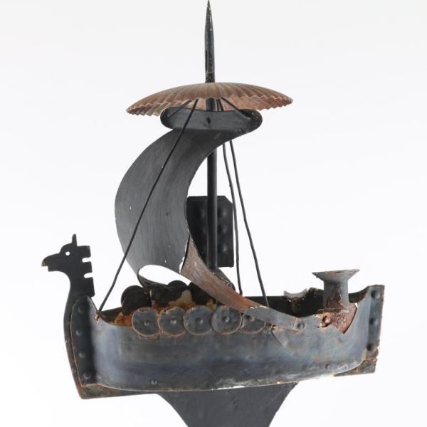 Metal painted Viking ship ashtray and pack holder. Shows age paint is flaking, measures 36"X10" APPROX.
