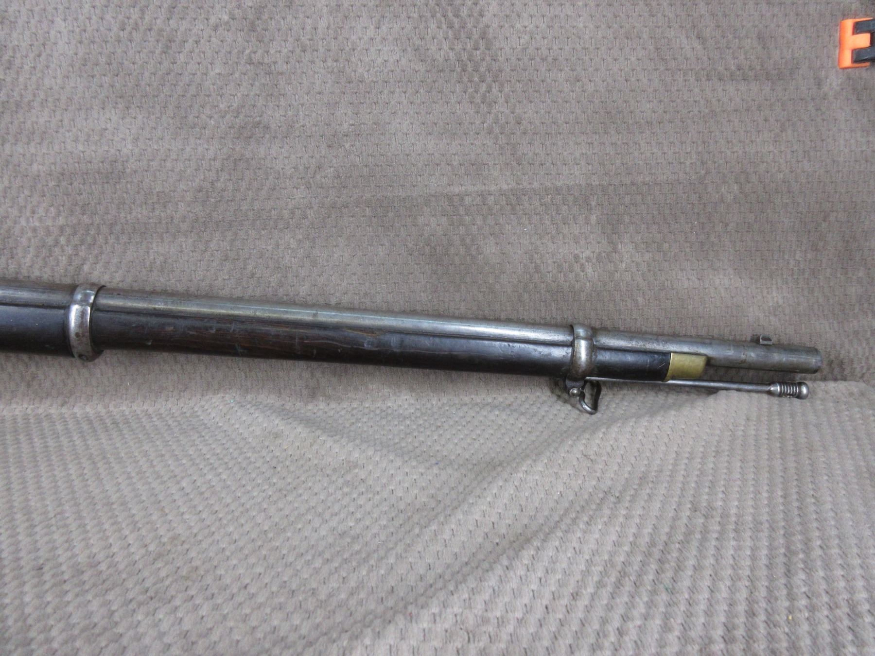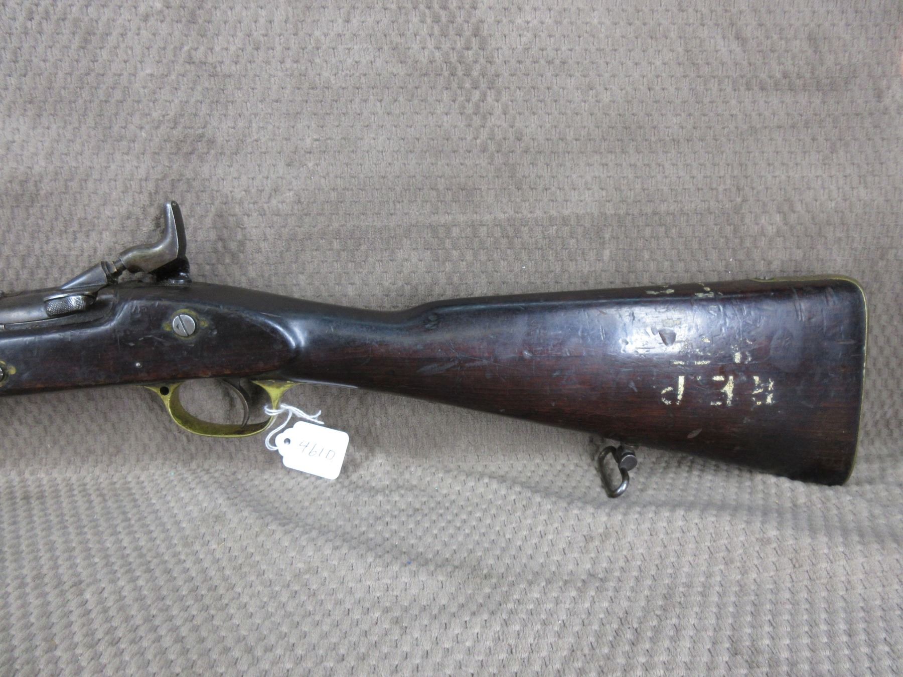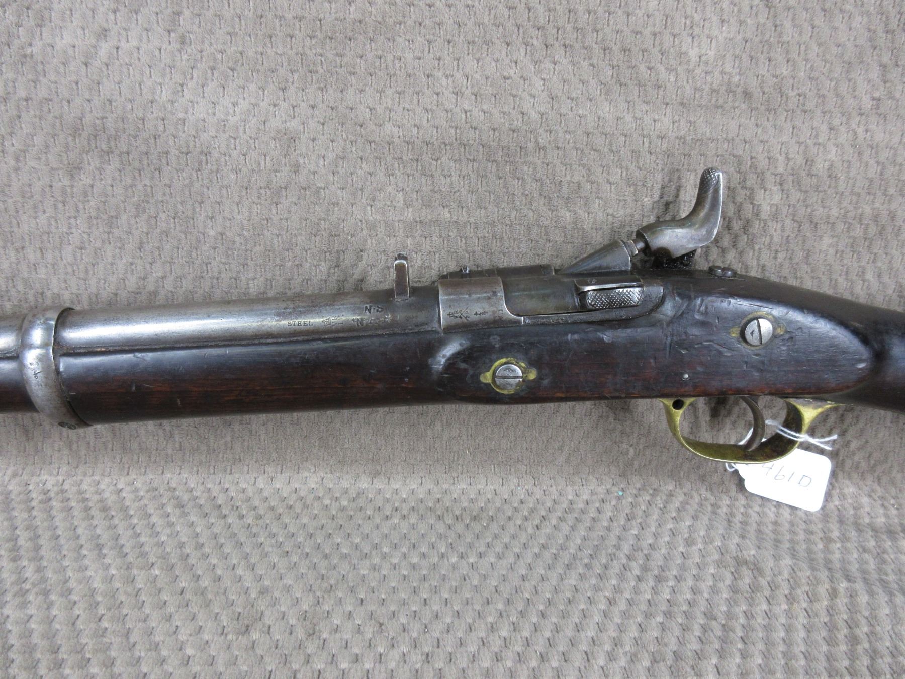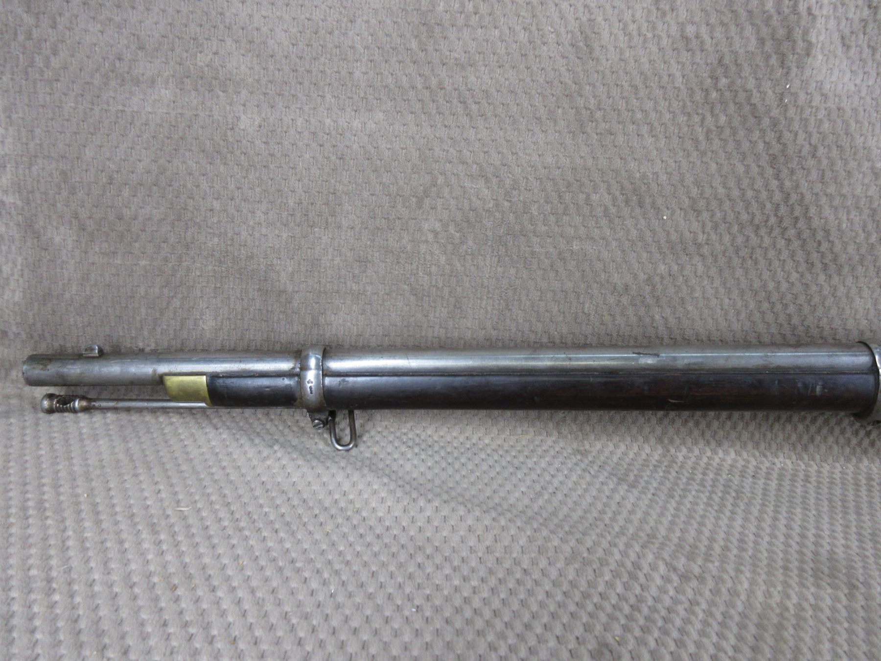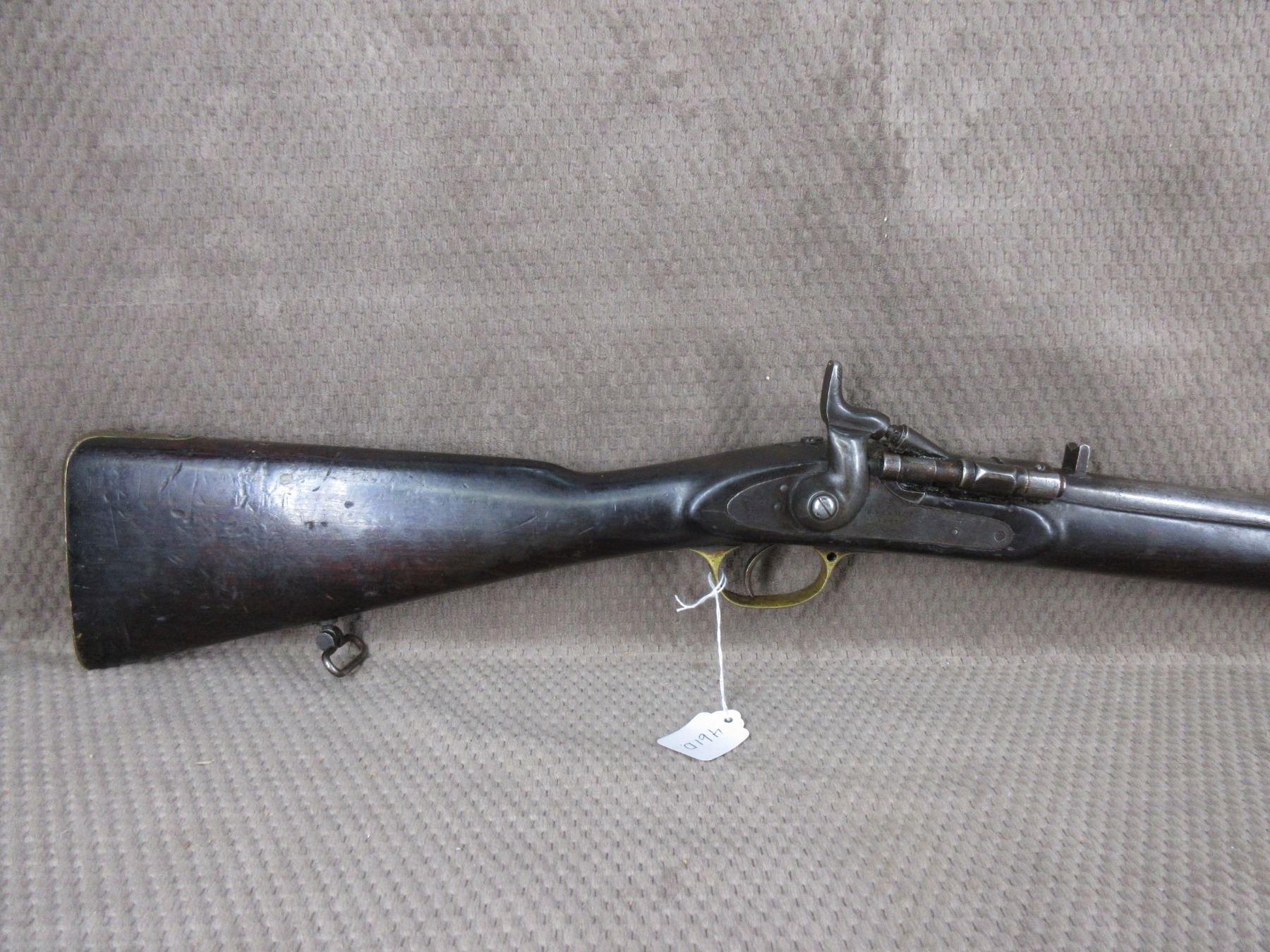 Antique - B.S.A. & M.Co. 1877 in 577 Snider??? - This single shot rifle/shotgun appears to be in working order. Barrel is 26 5/8", this is a smoothbore and is somewhat shiny, has both sights, rear sight it is very different, bluing is mostly gone, stock fair to good with minor cracks by lock, chip in forearm and usual usage marks, has cleaning rod, brass butt plate.