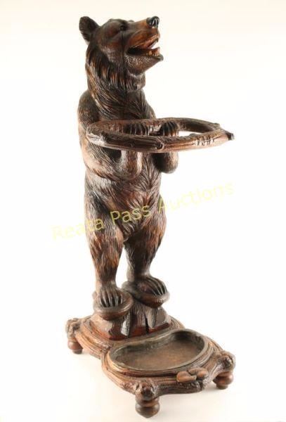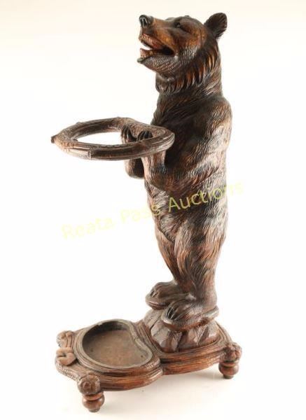 Lindenwood umbrella stand in the form of a bear perched on a rocky ledge looking alertly to the side. Attributed to Walter Linder circa 1890s. Measures 39" tall by 15" wide. From the Larry Howard Estate.