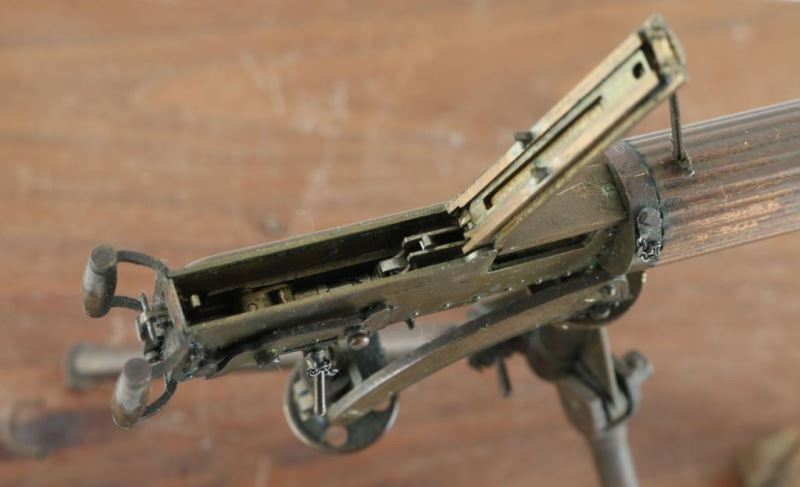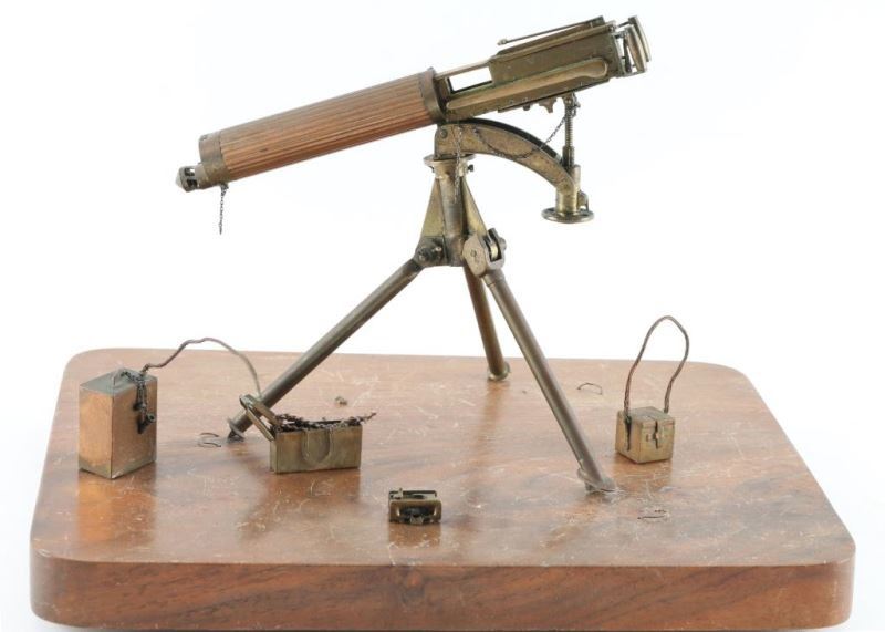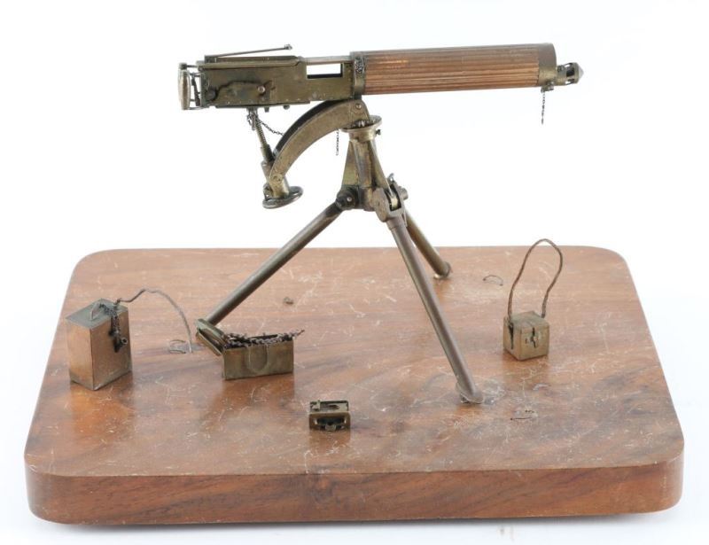 model of Maxim water cooled machine gun with accessories on wood display plaque. This model was first viewed by Little John Gangel in the possession of the famous miniature maker Weston of Mexico City. Mr. Weston son stated this miniature had been in the Mexico City arsenal since about 1914 and his top gunsmith. The miniature artist had obtained it from the arsenal in the 20-30's where he worked before his employment at Weston. Includes certificate of authenticity. Approx 5"x7". (Model Only)