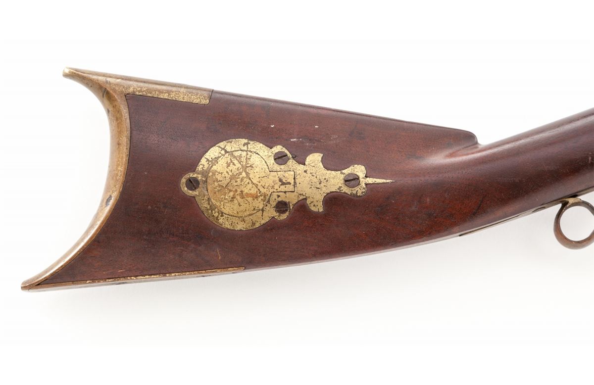 Antique Canadian Percussion Rifle, by Brunker (Ottawa), .40 cal., 31'' heavy octagonal barrel, double set trigger, perchbelly New York style walnut halfstock with pewter end cap, nickel silver details, brass buttplate and patchbox, with hickory ramrod. Threaded silver escutcheon at wrist of stock for rear peep sight. Brunker maker's mark is additionally accented with the Masonic square and compass. Condition is fine. Brown barrel shows light even wear at high edges with moderate pitting near nipple. Good working set trigger. Bore is at least very good. A seldom seen Canadian made rifle. Est.: $1,800-$2,400. (Antique)