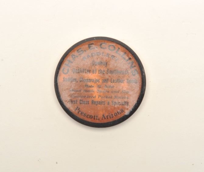 Antique Chas. E. Collins Saddlery, Prescott, Arizona advertising sharpening stone, approximately 2.25” in diameter; “Cowboy Outfitter of the Southwest/Saddles, Chaparejos and Leather Goods/Made toOrder/Handmade Spurs and Bits/Guaranteed Pocket Knives/First Class Repairs a Specialty”. Est.: $50-$75.