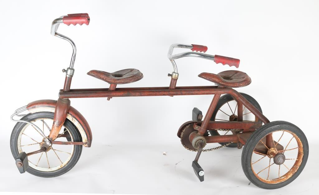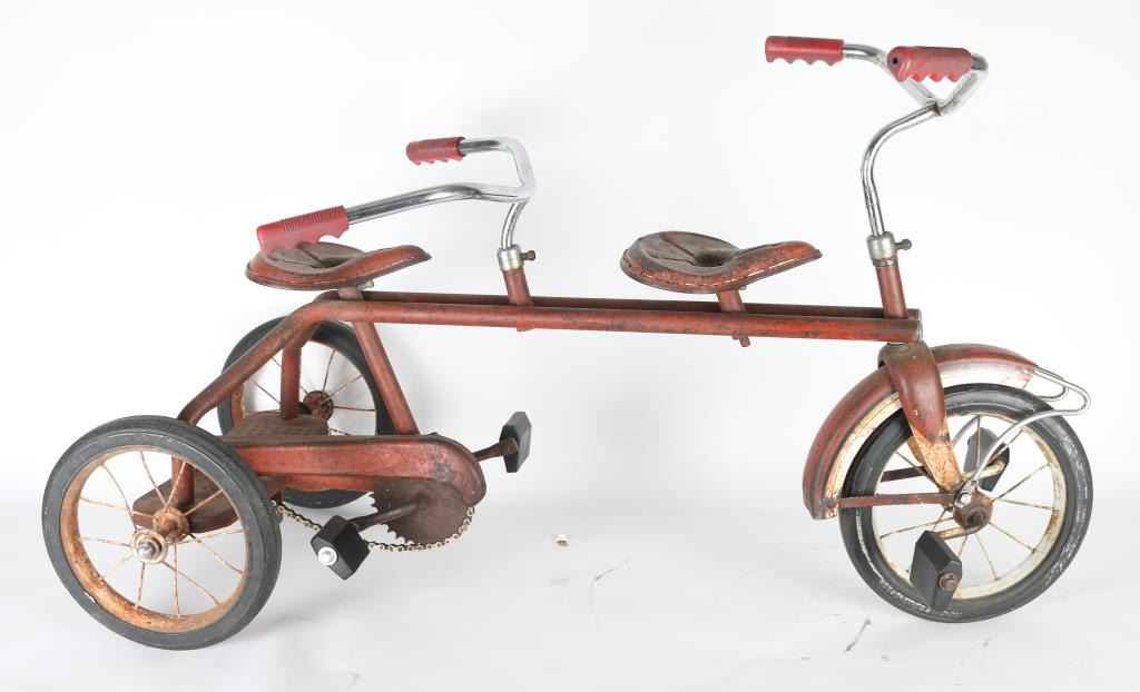 All metal tricycle with red painted finish, in rustic condition. Cute the way it is but would be an awesome project for restoration.