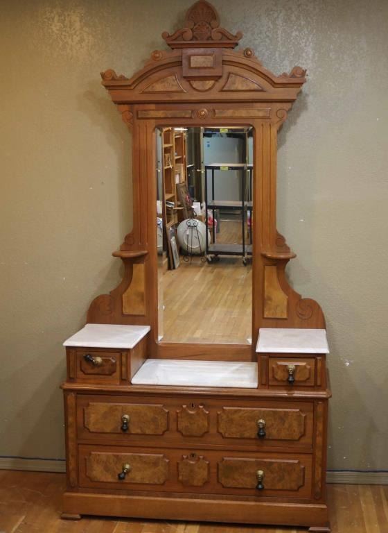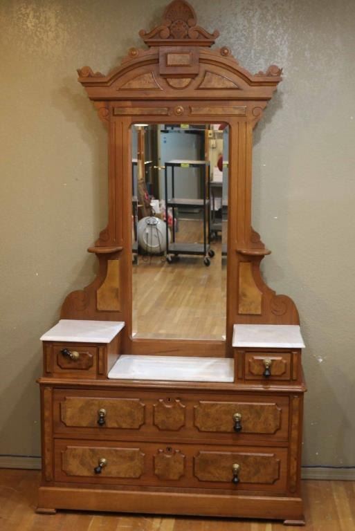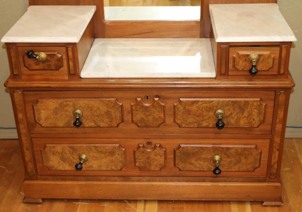 Burled walnut with traditional design and white marble tops. Includes (4) drawers with beautiful beveled mirrored back in overall excellent condition, measures 92" x 44" x 19 1/2".