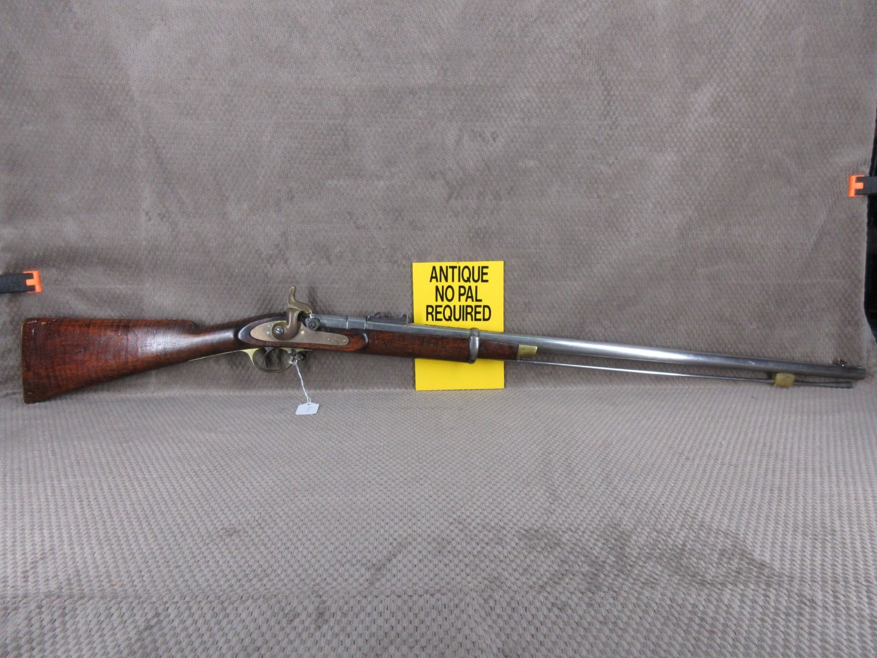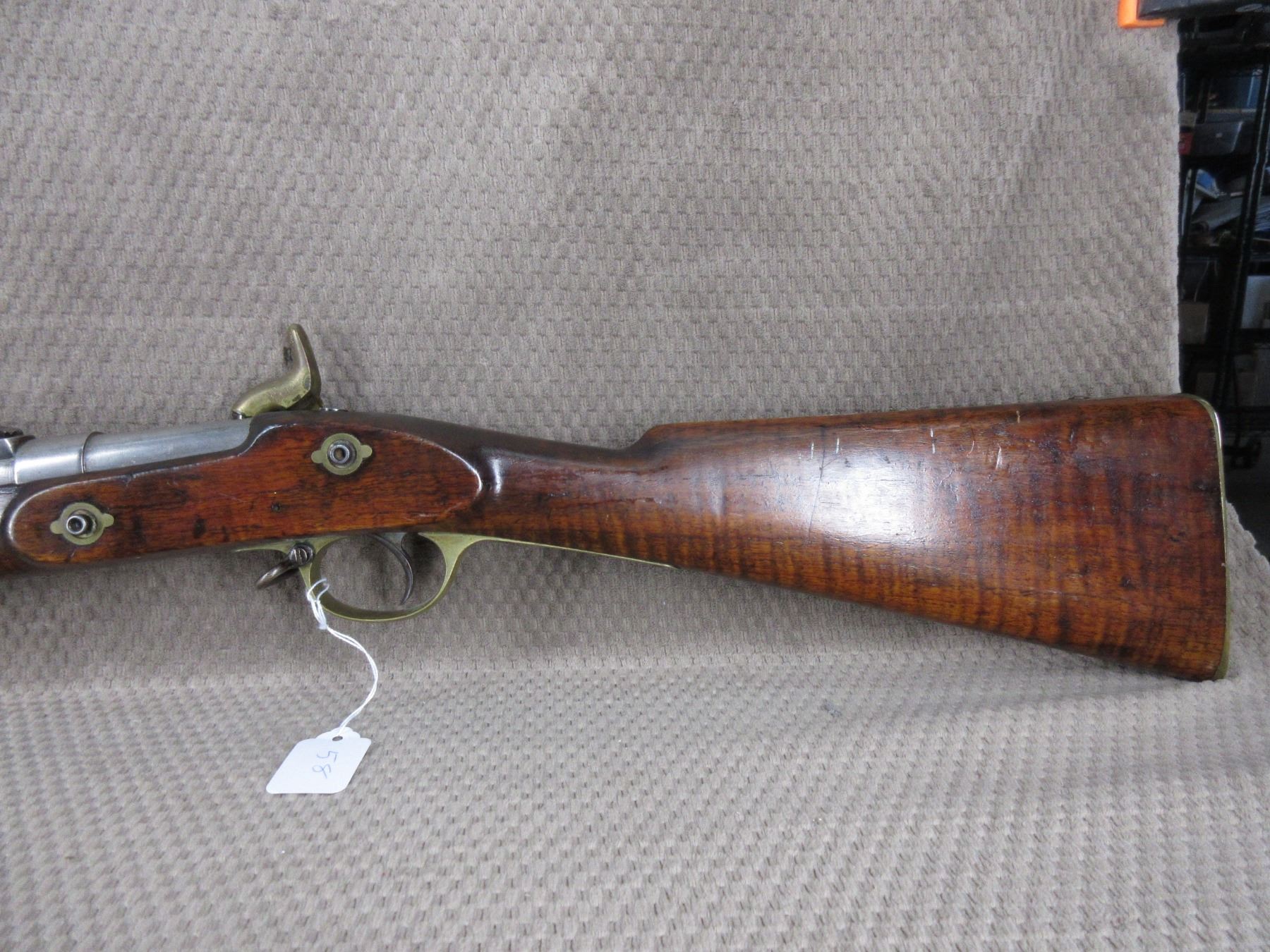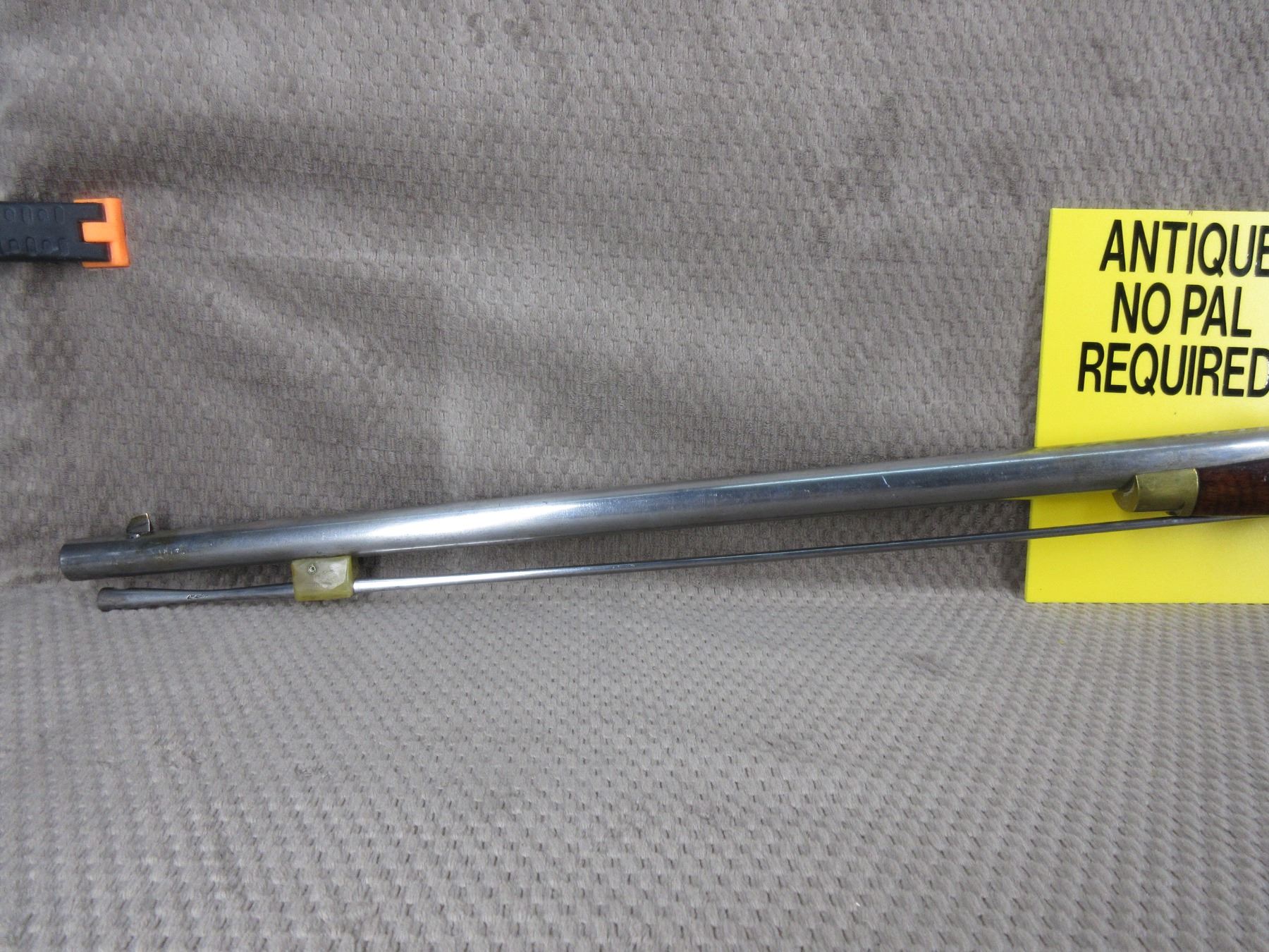 Antique - Enfield Muzzle Loader in 58 Caliber ??? - This muzzle loading rifle appears to be in working order but has been modified from original as it looks like it was a Sinder Enfield (shot at own risk). Barrel is 31 1/2", rifling is good, bluing has none, has both sights, stock is good, metal but plate. Ser # none