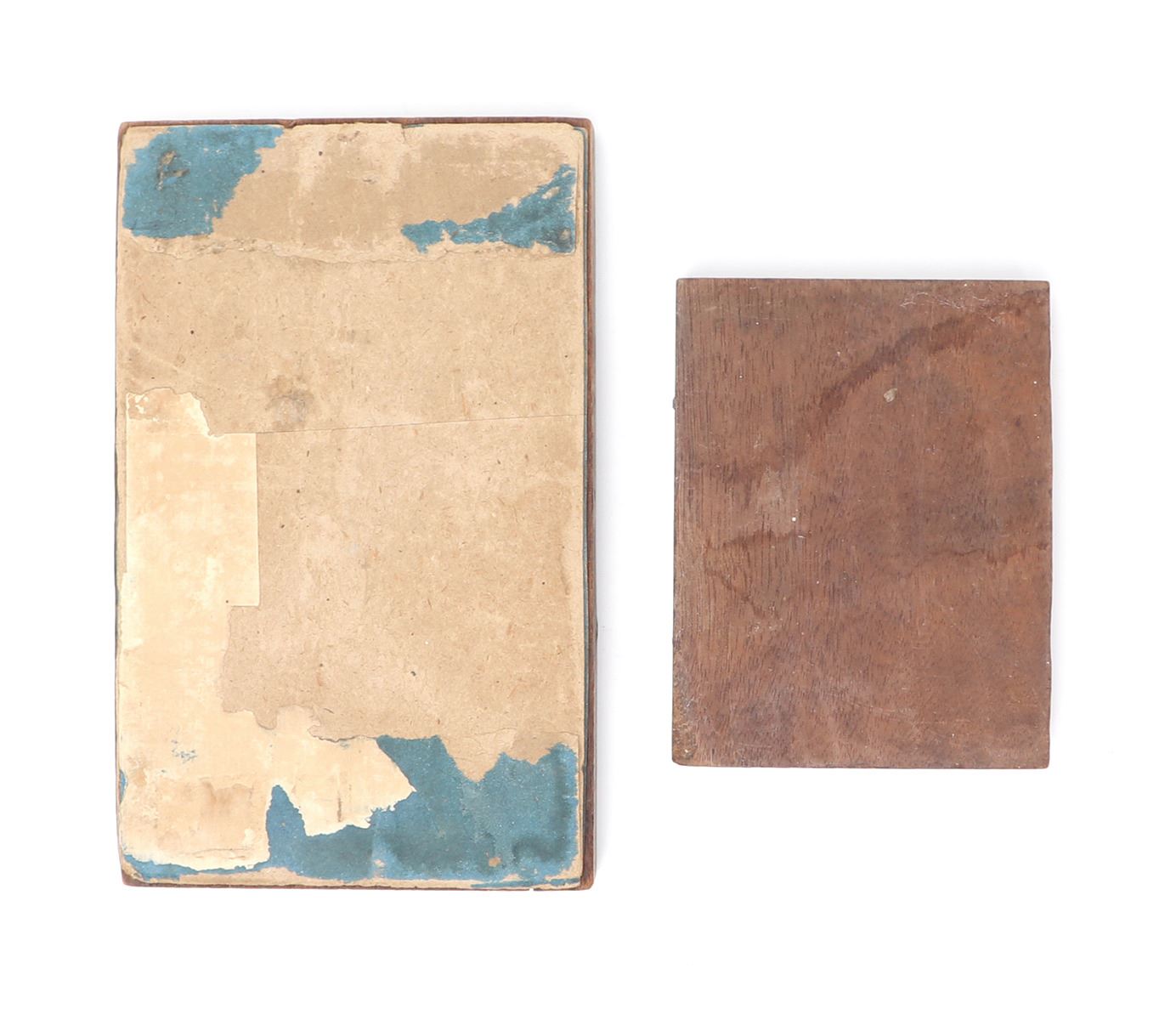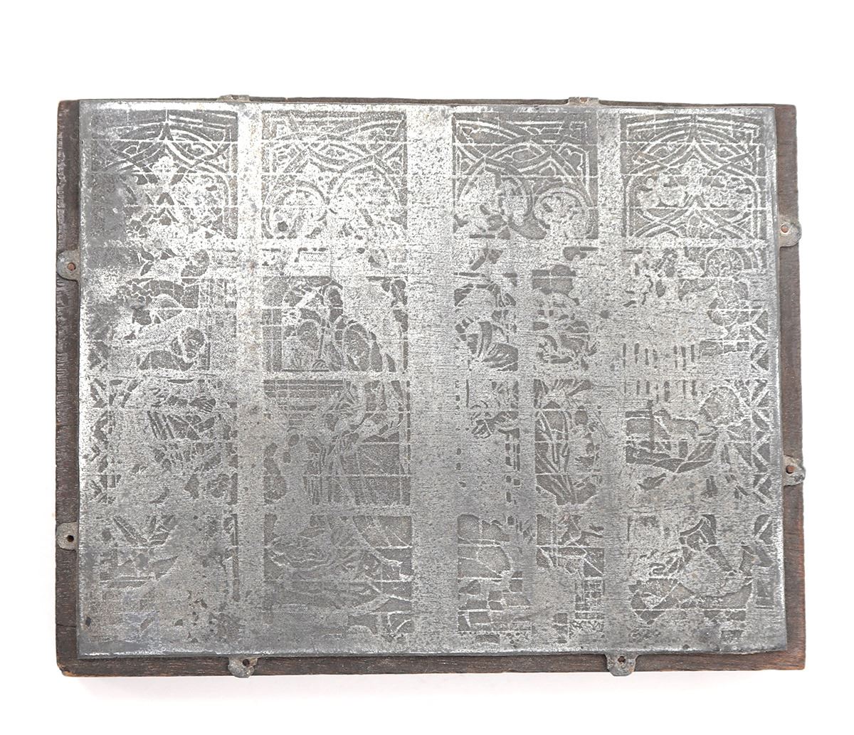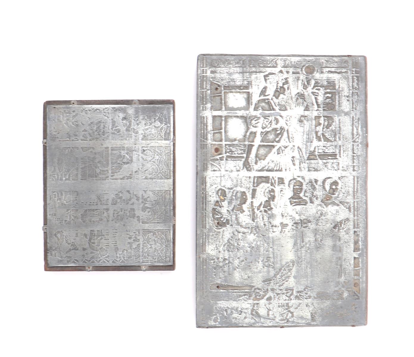 Each printing block is a metal incised or pressed slab affixed with nails on all sides. Both appear to be depicting a religious scene, with an angel or lord above followers on the largest, and what appears to be a scene of villagers bringing gifts to a Saint. Size largest 7 3/4" H x 4 3/4" W. Condition: Worn condition throughout commensurate with age.. Provenance: Collected prior to 2008, ex-Lacy Gallery (Vanna & Lee Lacy collection), Los Angeles CA. Lacy Gallery was founded upon six decades of collecting ethnographic and fine art. Lee Lacy was a distinguished Hollywood producer of iconic TV series and commercials.