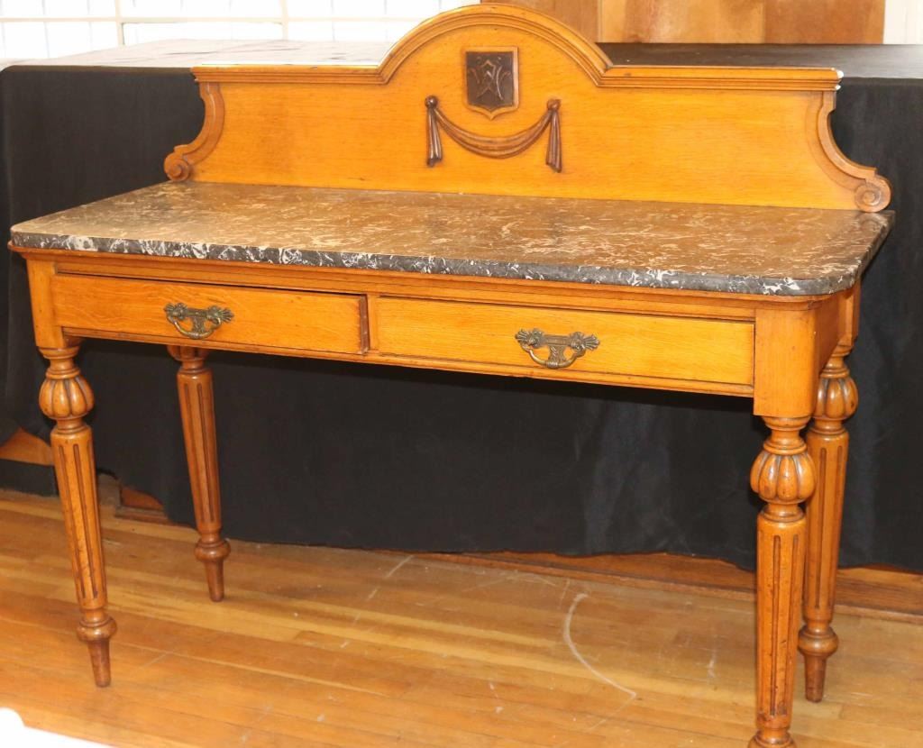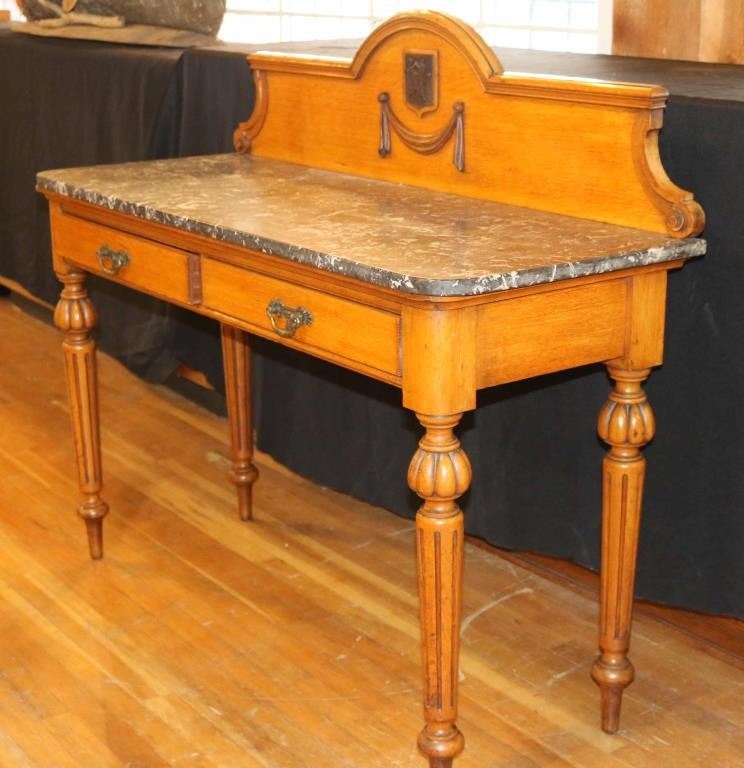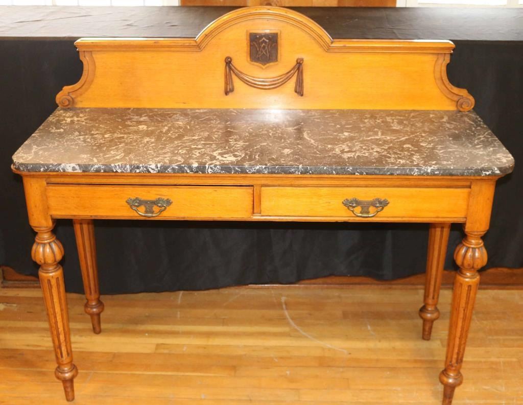 Solid maple construction with carved back and legs. All tongue and grove made. Two drawers with brass drawer pulls and a solid black marble top. Measures 46 1/2" tall x 20 1/2" deep x 54" wide.
