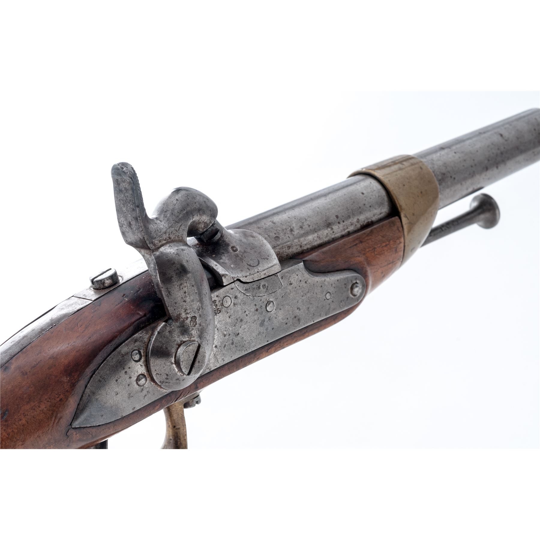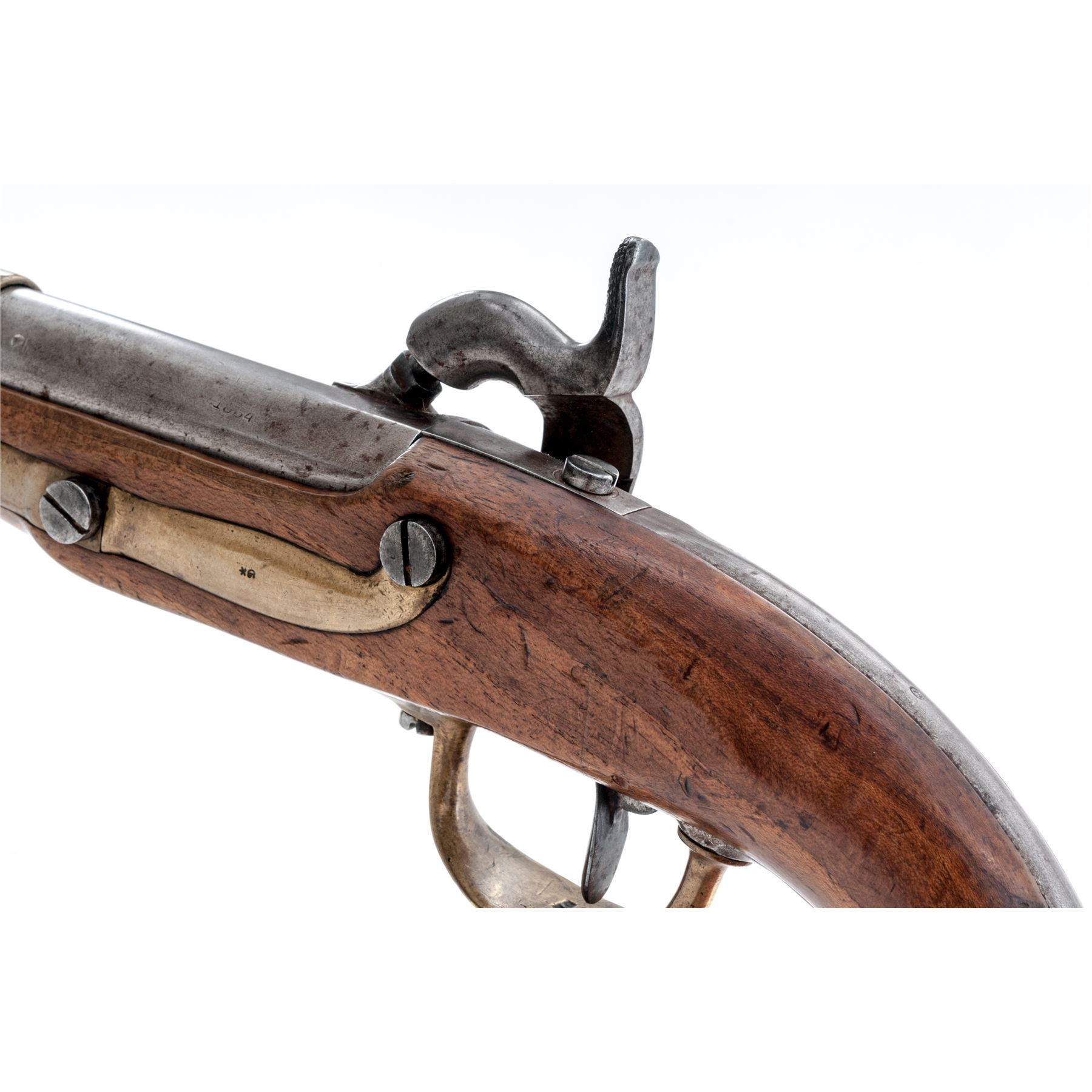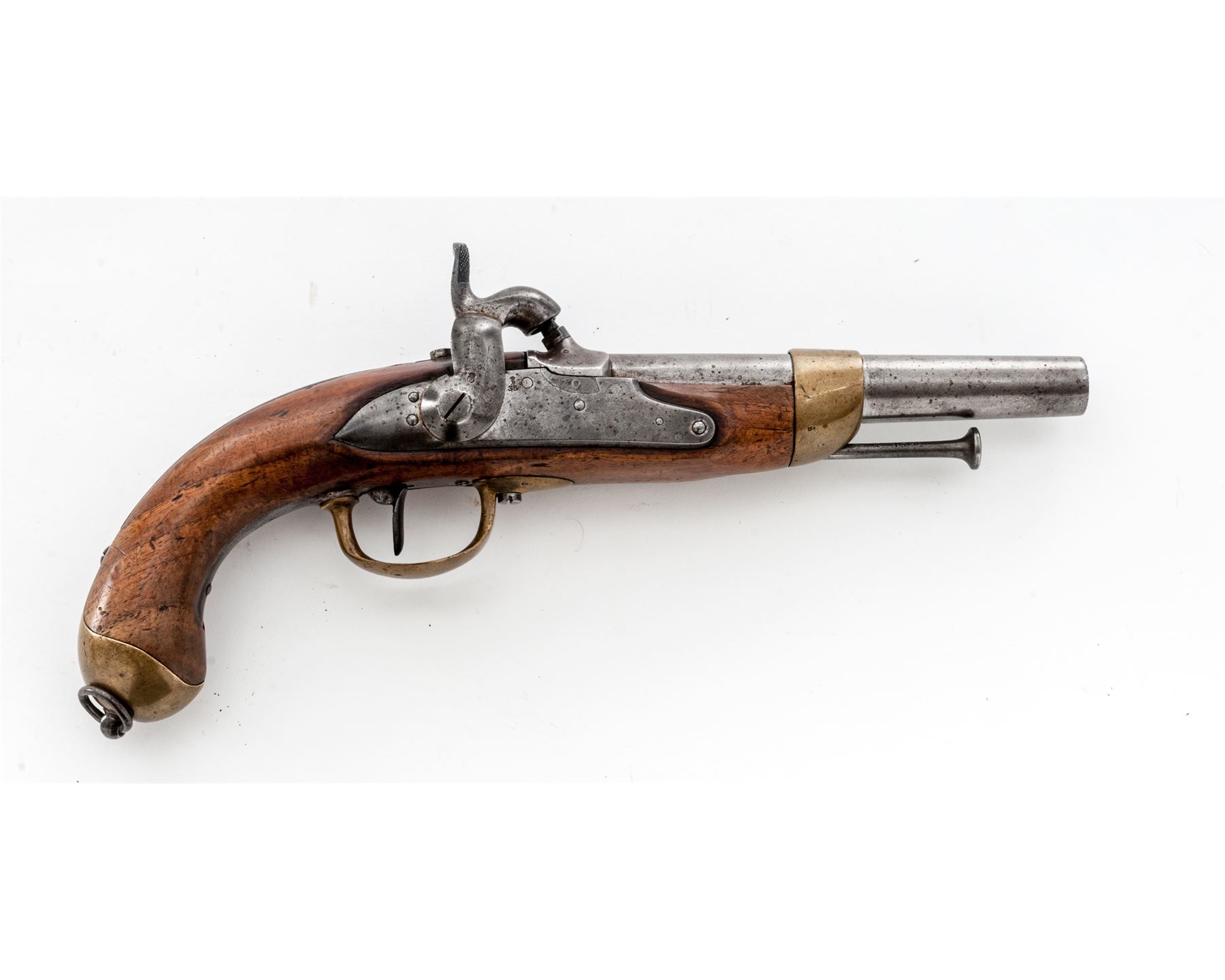 Antique European Military Percussion Pistol, in the Style of the French Model 1822 Pistol, altered from flintlock, #1392, approx. .70 cal., 7.75'' barrel, without sights, stamped ''GB'' in an oval cartrouche at breech, and ''P'' (encircled) ahead of nipple bolster, which is marked ''R'' (encircled); beveled lockplate with long pointed rear tang is marked ''(crown)/P/35'''' behind iron frizzen filler; hammer with an impressed ''(crown)/PA'' cartouche is curved to align with nipple; brass mountings include single wide barrel band (marked ''(star)/D'' and having a long tang adjoining the serpentine sideplate (with same mark), triggerguard (with iron tang having ''(star)/D'' and ''(star)/g'' marks, and buttcap marked ''T'' (encircled) over ''1392'', with iron lanyard ring; iron backstrap marked ''D'' (encircled), extending to top tang. Varnished halfstock of European hardwood. Condition is very good: the iron parts being smooth ''arsenal bright'', the brass with an aged patina. Stock is sound with the expected marks of military use. Original button-tip iron ramrod. Markings are clear, action is strong; smoothbore is brilliant. Est.: $400-$600. (Antique)