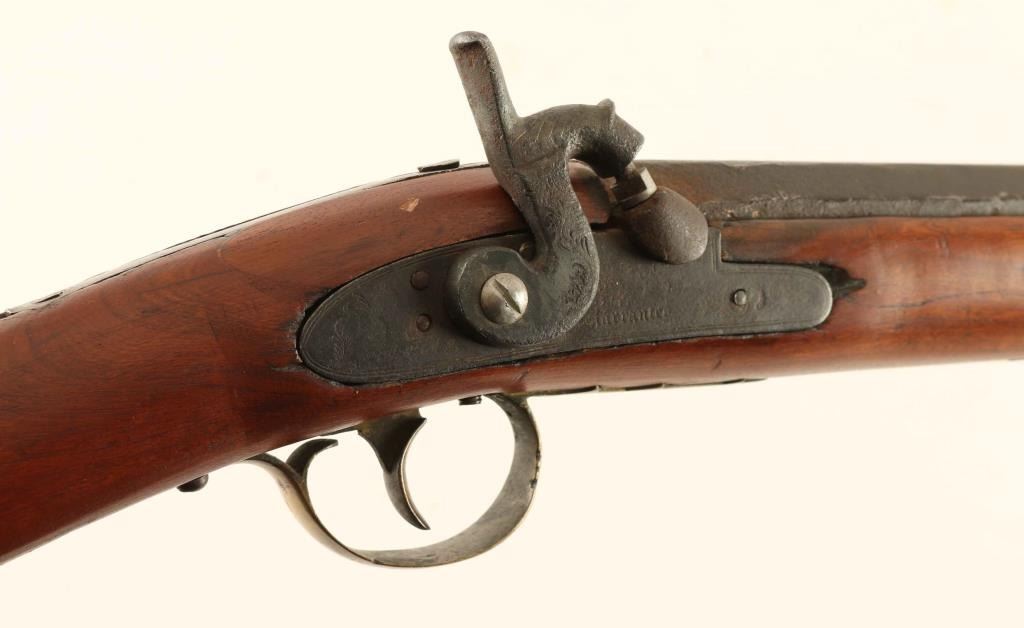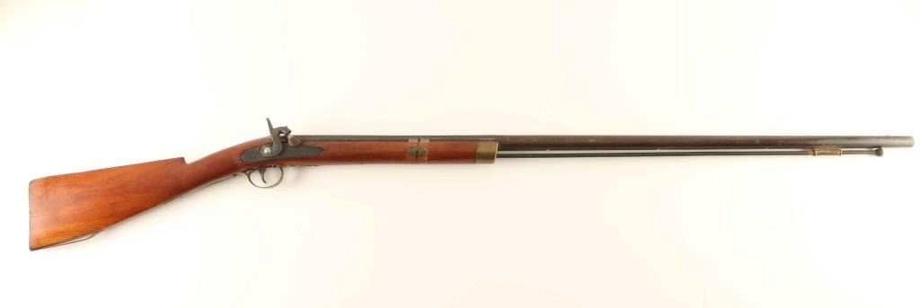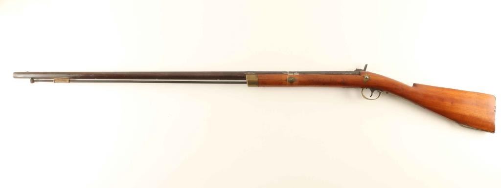 Single-shot percussion, blackpowder rifle. Brown patina finish. One piece wood stock. 37 3/4' barrel. The barrel, lock plate, hammer, and ramrod, appear antique, with age, The stock, and brass furniture appear to be newer replacements. there is a name on the lock plate (unreadable). The nipple is a newer replacement. The hammer has been filed, and is held in place by a newer replacement screw. The one cock hammer works. There is tape holding the barrel to the stock. bore is dark/rusty. Would look nice over the fireplace, but is operable. NRA Condition-Fair. Antique firearm.
