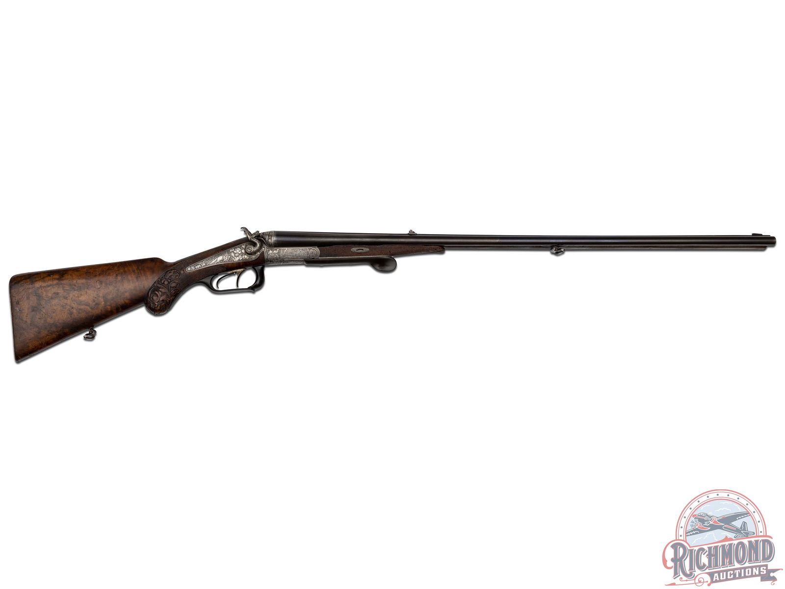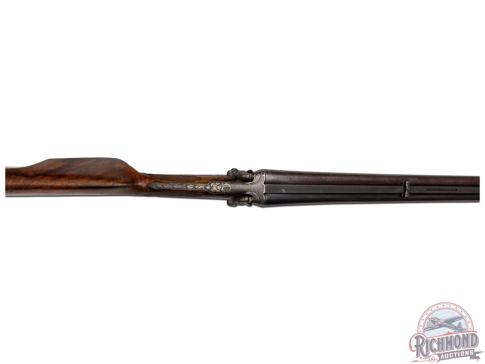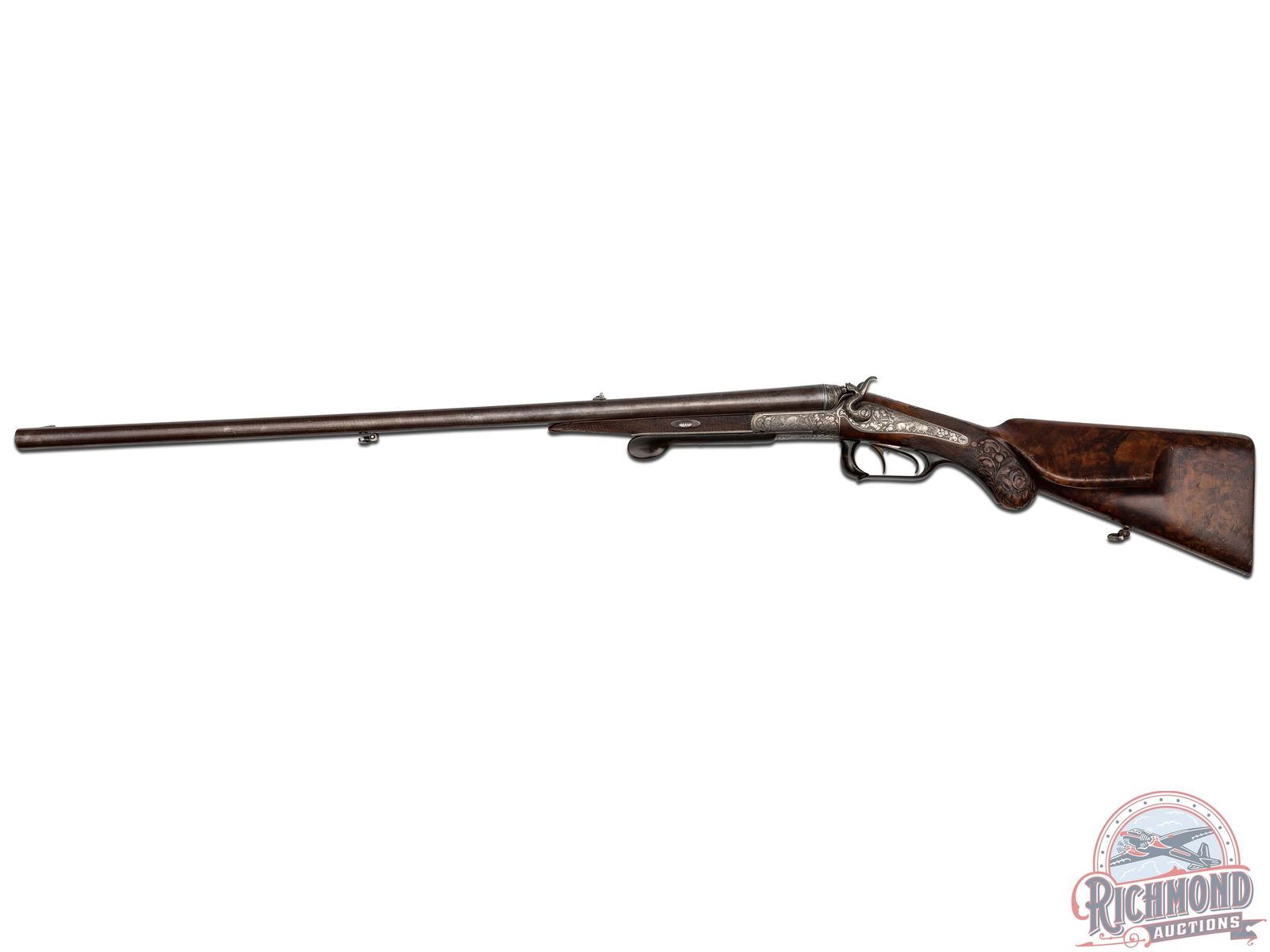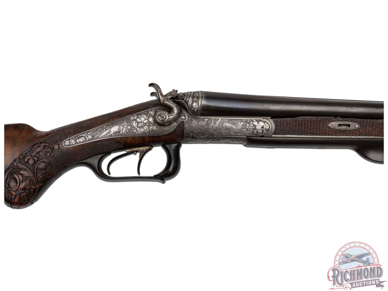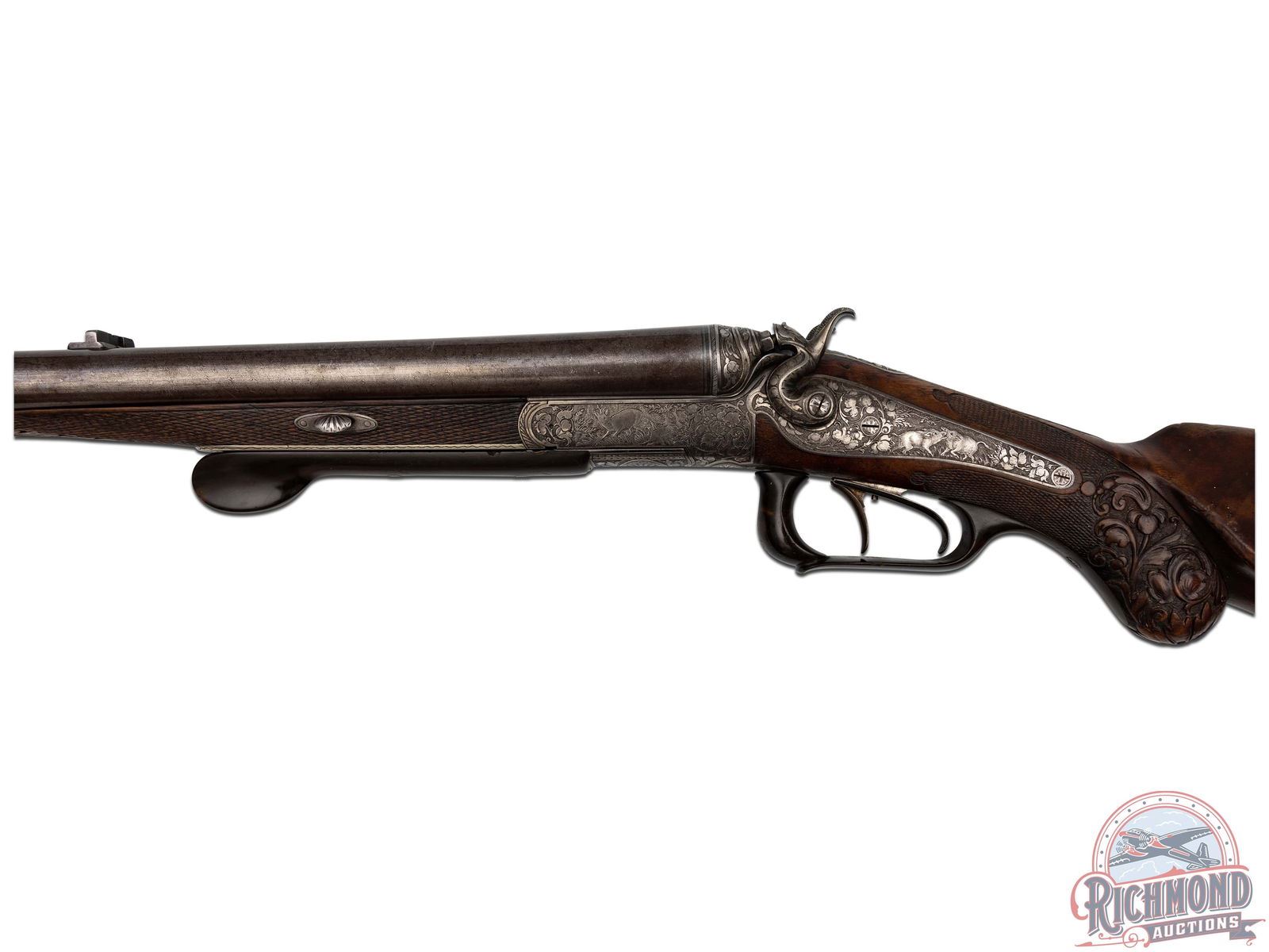Manufactured circa 1890 by Anton Korinski in Erlangen, Germany. 27" SxS Damascus 16 gauge shotgun barrel beside 11 m/m steel rifle barrel (should be chamber cast to verify) with matted rib, marked "A. Korinski Erlangen", rifle sights and extractors. Underlever gray finished game scene engraved frame and back action locks with exposed hammers featuring running deer, wild boar and fox scenes. Action has horn opening lever and horn trigger guard. Two triggers with front being a set trigger. Dark figured European walnut stock with carved floral round knob pistol grip fading into wrist checkering. Stock has Bavarian style over-the-comb cheekpiece with steel bullet trap. Matching splinter checkered and carved forearm held with wedge. CALIBER: 16 & 11MM. S/N: 6742. FFL STATUS: Antique.
