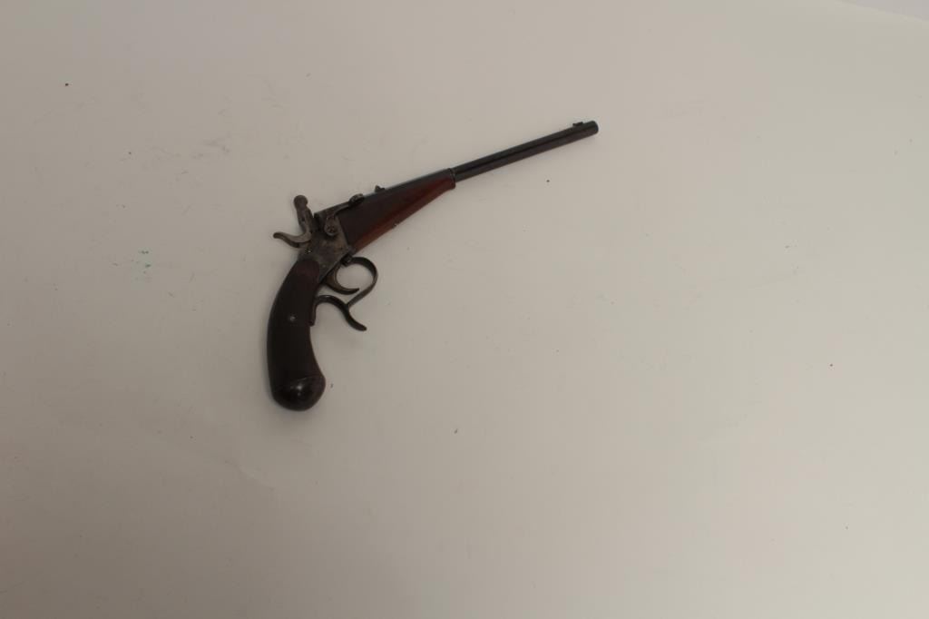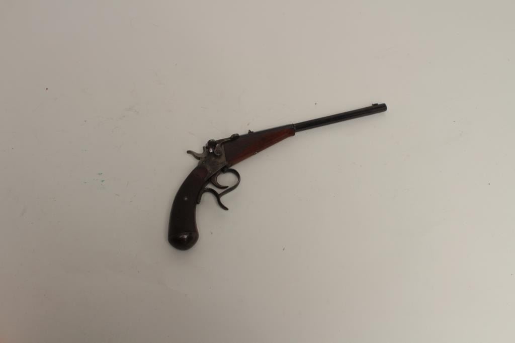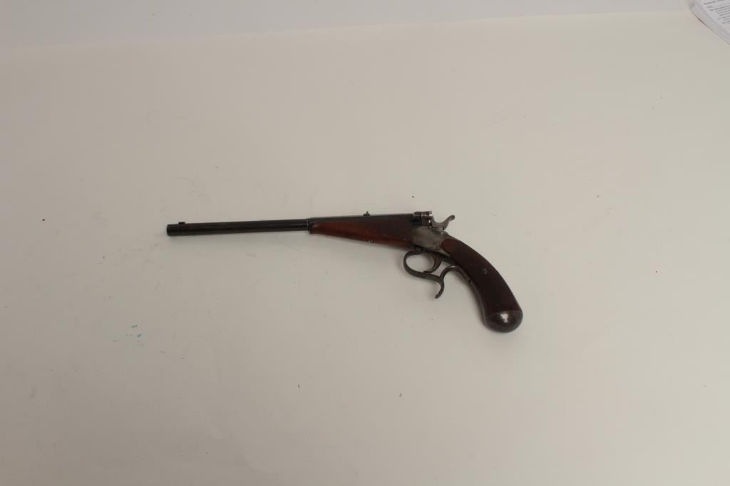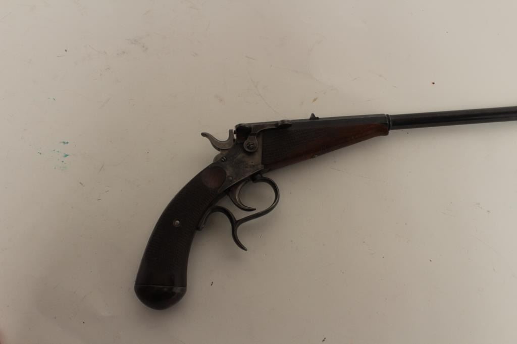 10.25” barrel, blued and case hardened finish, checkered wood grip and forend, very good overall with considerable blue finish remaining on barrel and traces of case colors on the frame; very good bore, good action and very good grips. (Antique). Est.: $200-$400.