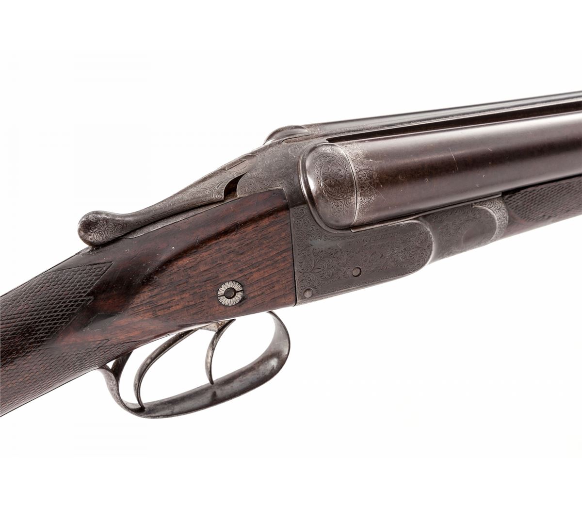 Antique Greener Side-by-Side Shotgun, #20996, 12 ga., 2-5/8'' chambers, 28'' brown game rib damascus barrels with one German silver bead, marked ''W.W. Greener, 68 Haymarket, London, Winner at the London Gun Trials 1876, 1877, 1878 & 1879'', choked Full/IM; boxlock frame, tightly banknote scroll engraved, with panels to both sides inscribed ''W.W. Greener''; slender wrist offset checkered straight stock, and fine English walnut splinter forend with horn tip. Mfg'd approx. 1881. Condition is very good. Barrels show evidence of re-blacking, and both sling swivels have been removed. Receiver with additional English blue over original case hardened frame. Stock with light to just moderate scuffs with near heavy flattening to checks and one significant ding just forward of safety area. Action is mostly tight, bores are fair to good with some mild pitting and light dings midway down. Est.: $750-$1,000. (Antique)