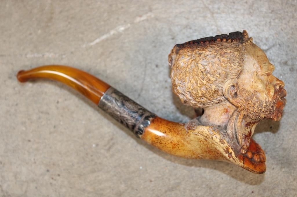 Antique Hand-carved Meerschaum Pipe of an "African Chieftain" with a Bakelite Stem in a Custom Case. It has a Sterling Silver Ring. COLLECTIBLE ANTIQUE TOBACCIANA AND SMOKING PIPES