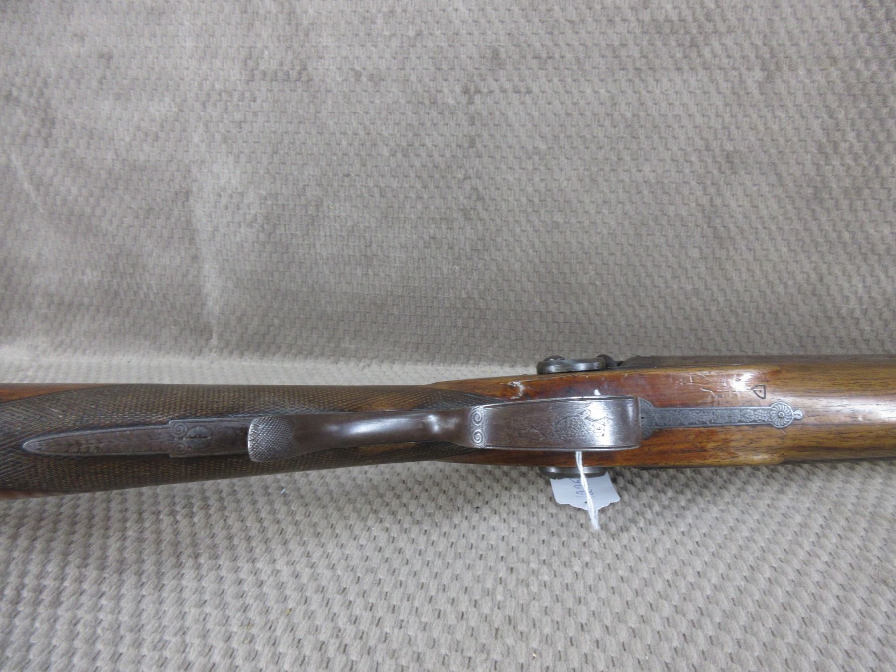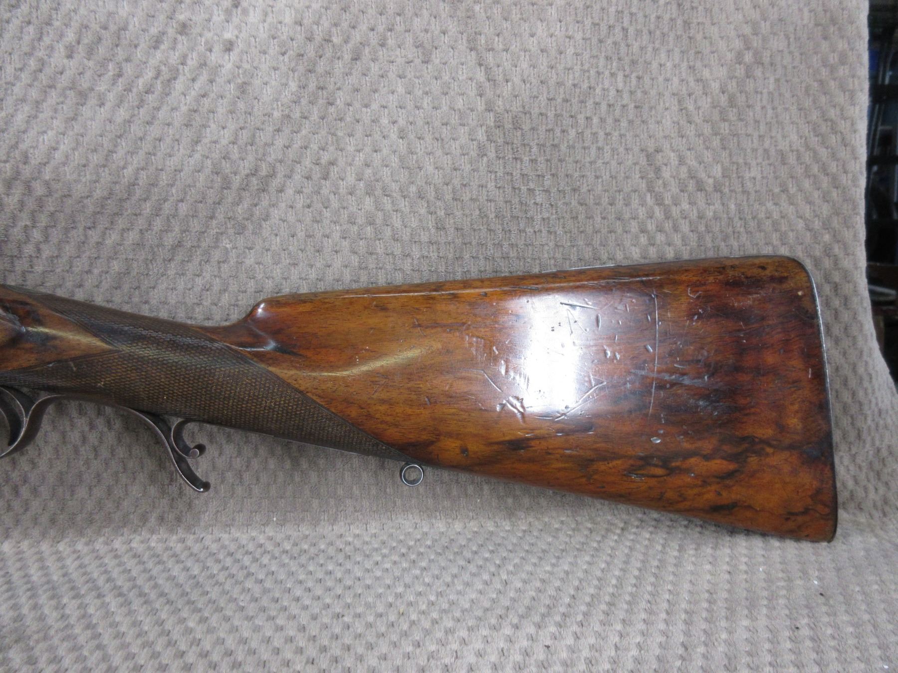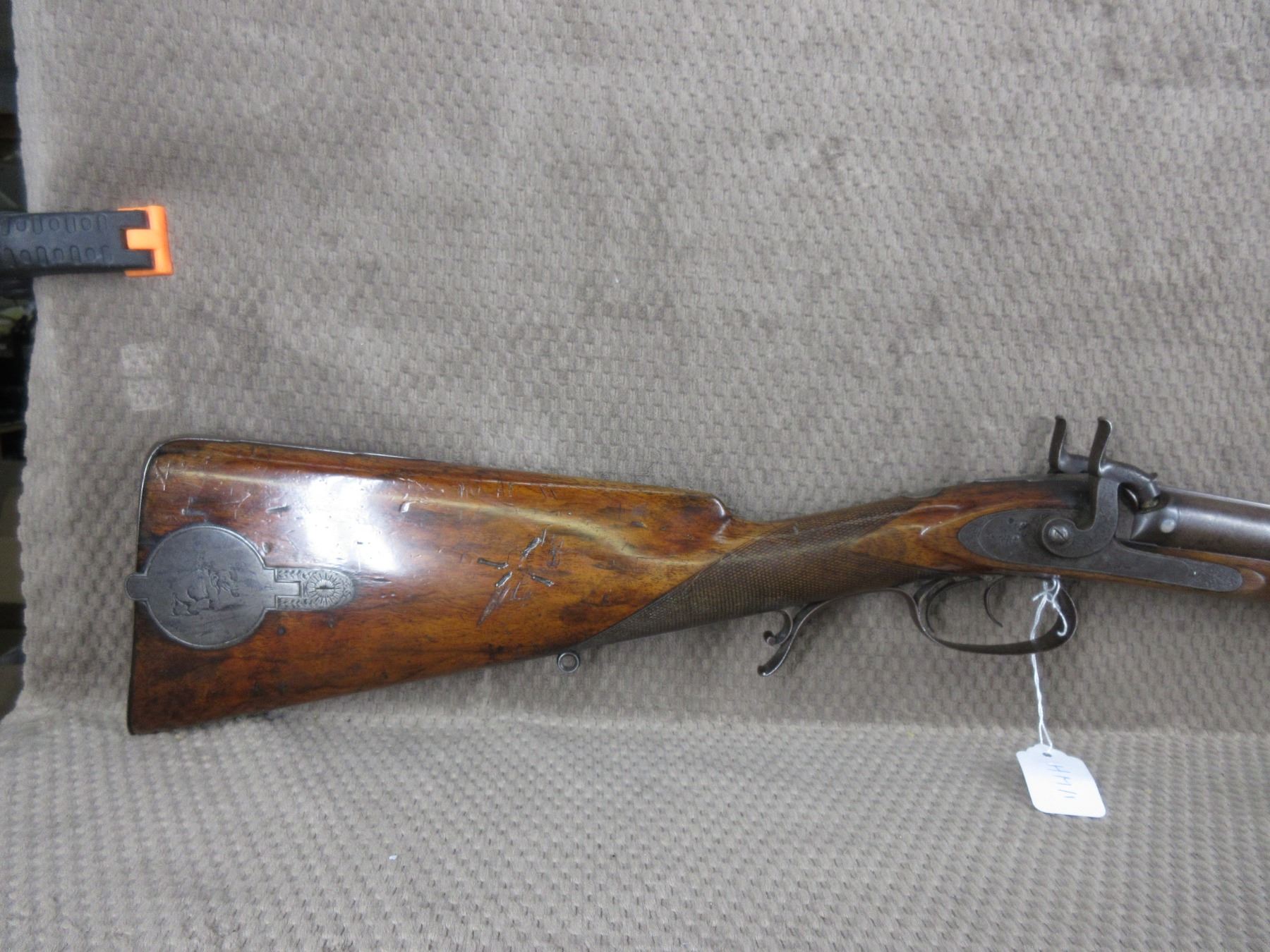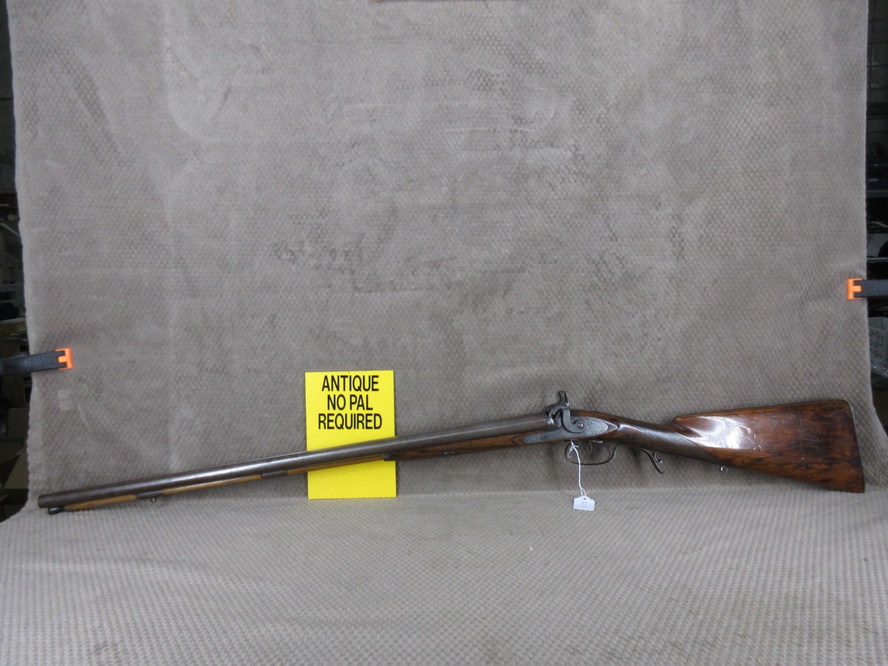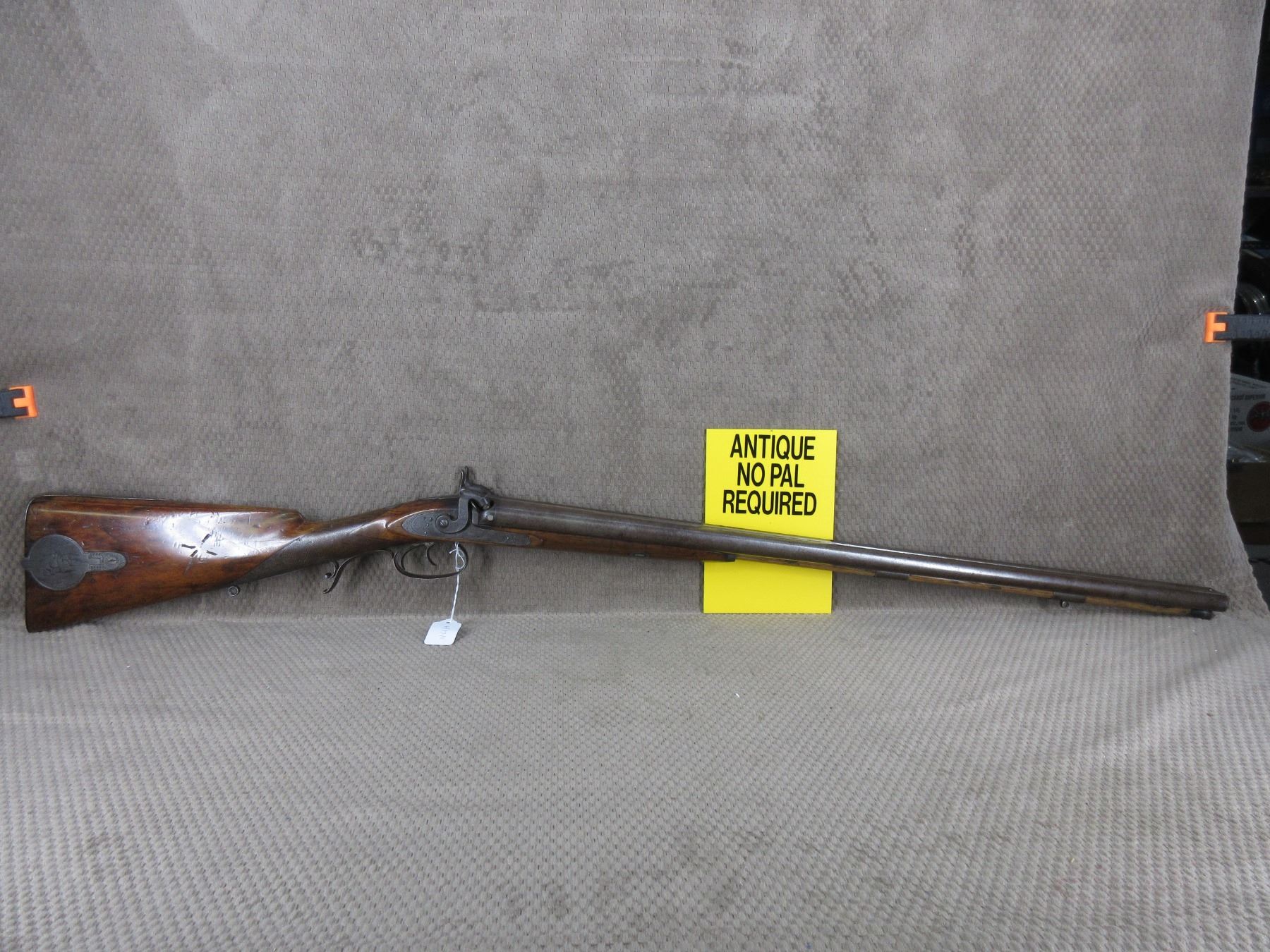 Antique - Henry Allport - Buck & Ball in 12 Gauge/69 Caliber - This nicely engraved double barrel muzzle loading shotgun/rifle appears to be in working order. I was told it is also designed to shot a round ball as found in the patch type box on the stock. Damascus barrels are 28", bores are somewhat shiny but look good (may need cleaning), browning is faded, wood has many marks but appears good to very good for age, metal butt plate Ser # None