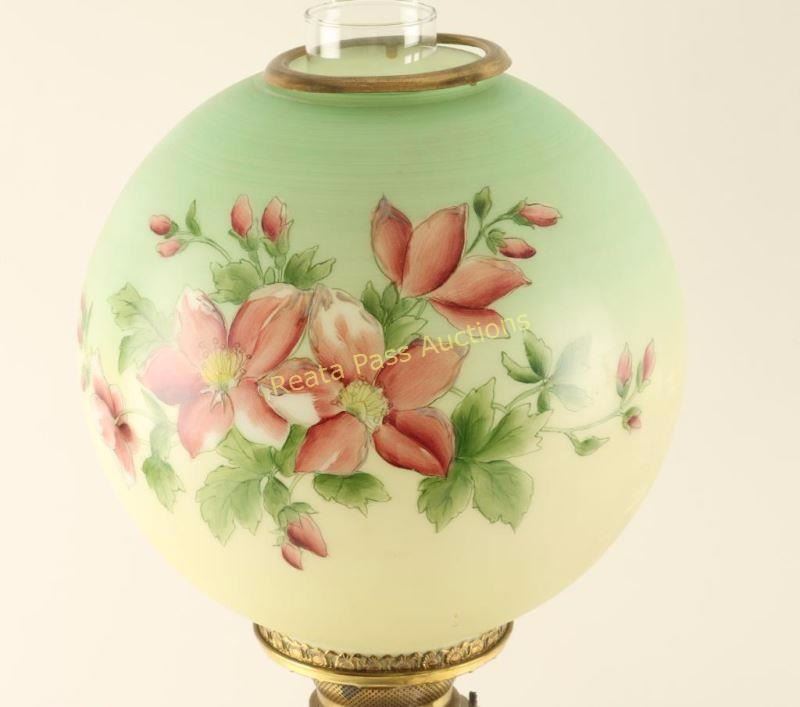 Upper and lower mint green glass globes with painted pink flowers. Brass hardware with nice footed base, lamp has been electrified. Measures 22"h x 8" dia.