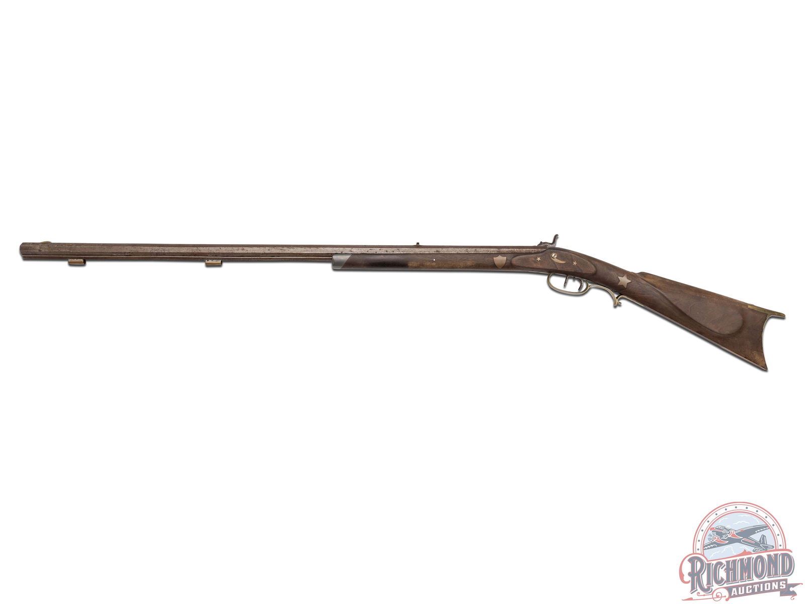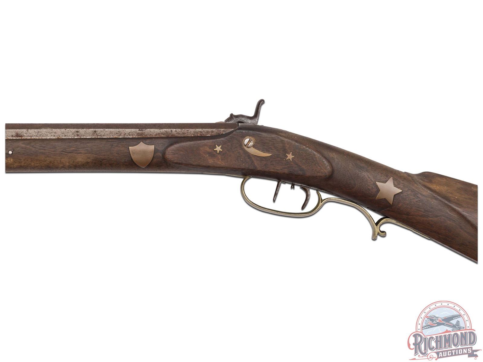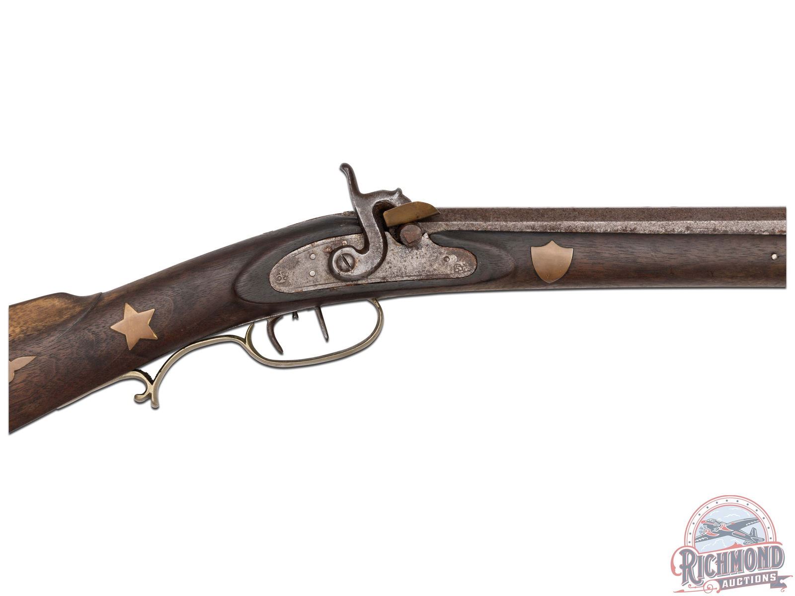 Kentucky style percussion halfstock rifle made by unknown gunsmith circa 1850. Measuring 51 -1/2" overall with a 30" octagon 32 caliber rifled barrel with rifle sights. Percussion lock with double set trigger control. Walnut halfstock with German Silver trigger guard, brass four piece patchbox and brass star and shield inlays. Missing ramrod. CALIBER: 32. FFL STATUS: Antique.