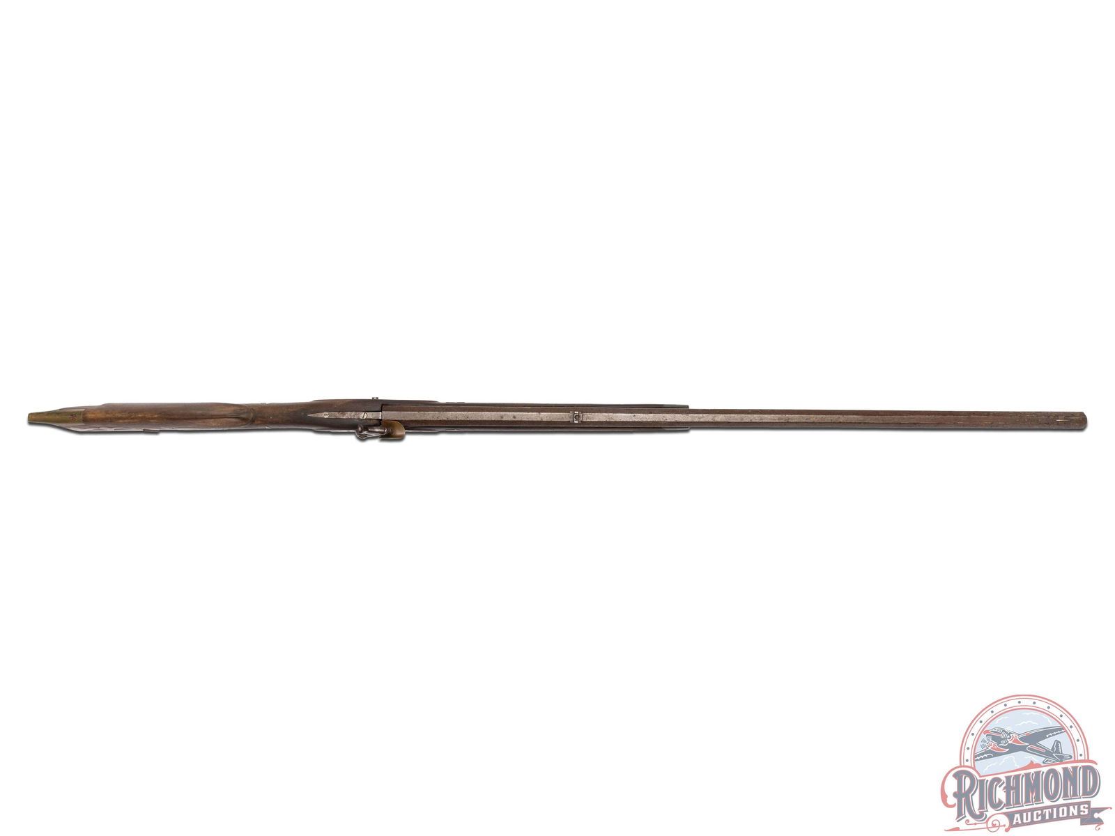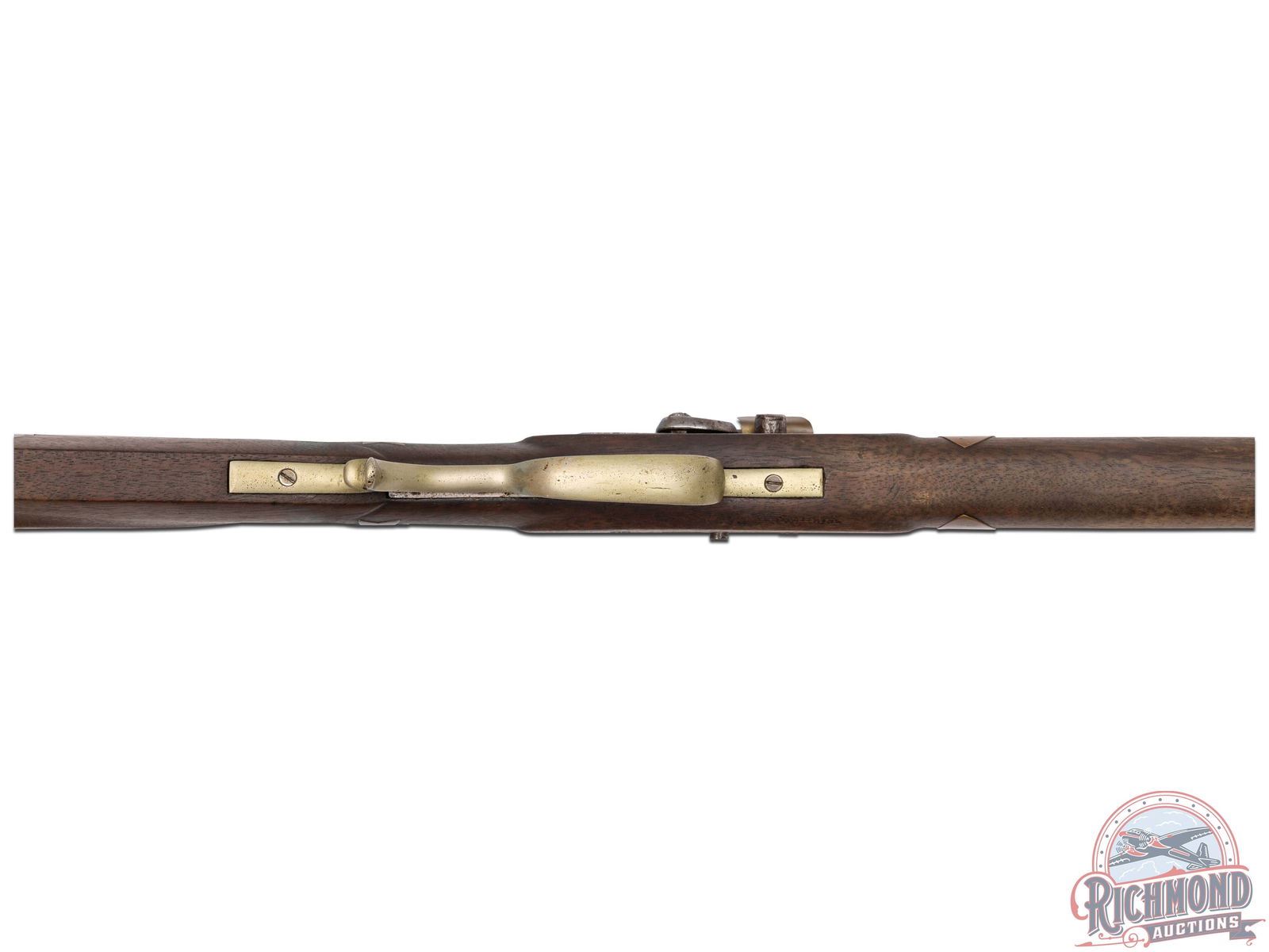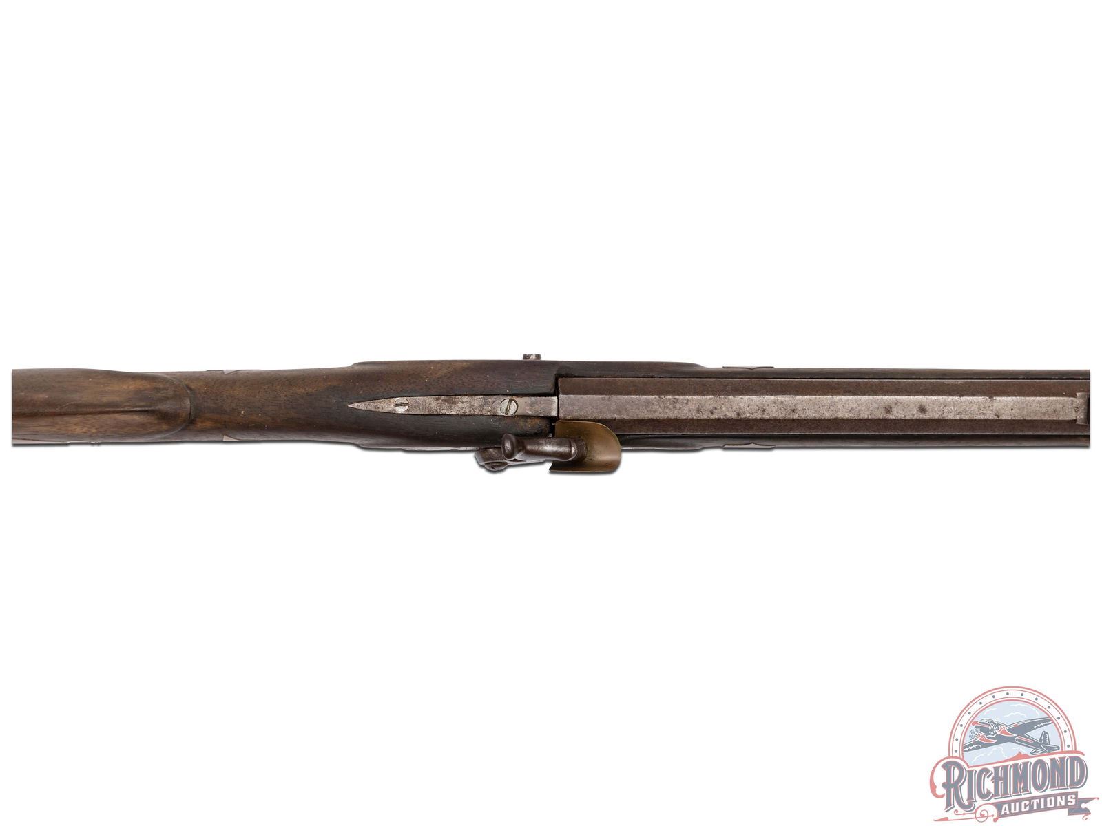 Kentucky style percussion halfstock rifle made by unknown gunsmith circa 1850. Measuring 51 -1/2" overall with a 30" octagon 32 caliber rifled barrel with rifle sights. Percussion lock with double set trigger control. Walnut halfstock with German Silver trigger guard, brass four piece patchbox and brass star and shield inlays. Missing ramrod. CALIBER: 32. FFL STATUS: Antique.