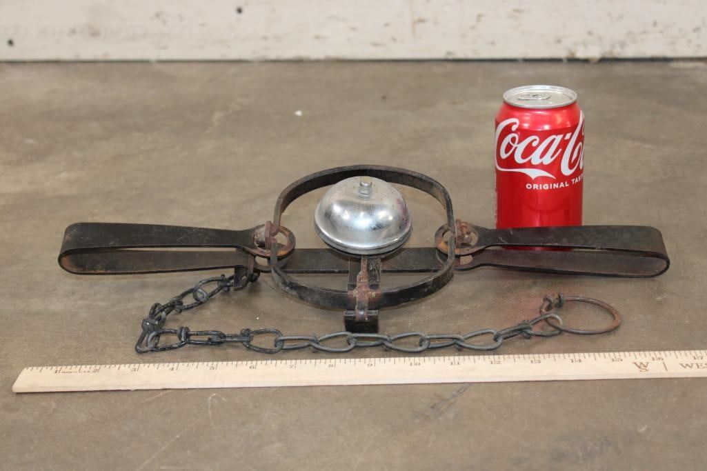 Antique Long Spring Animal Trap with a bell. It Weighs 2 lbs 3 oz and measures 17.5" Long x 6.25" Wide. It has no identifying makers marks but closely resembles the Oneida Victor animal trap No. 3 from 1927-1929. PRIMITIVES AND TAXIDERMY TRAPS