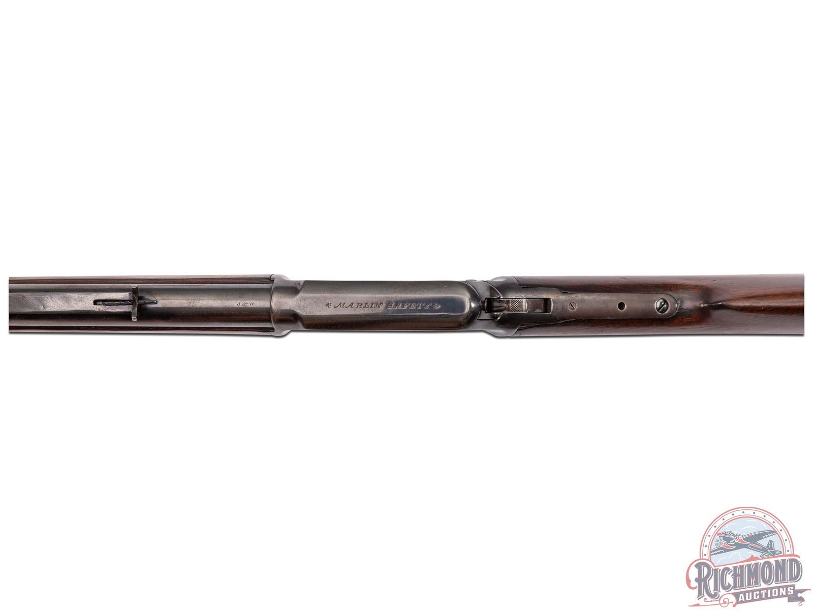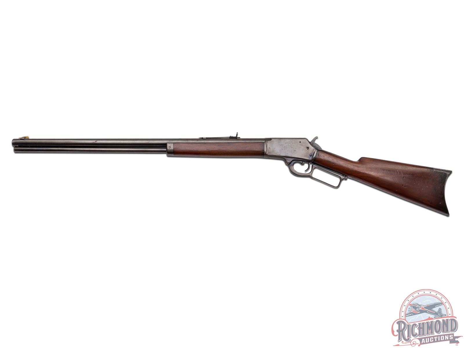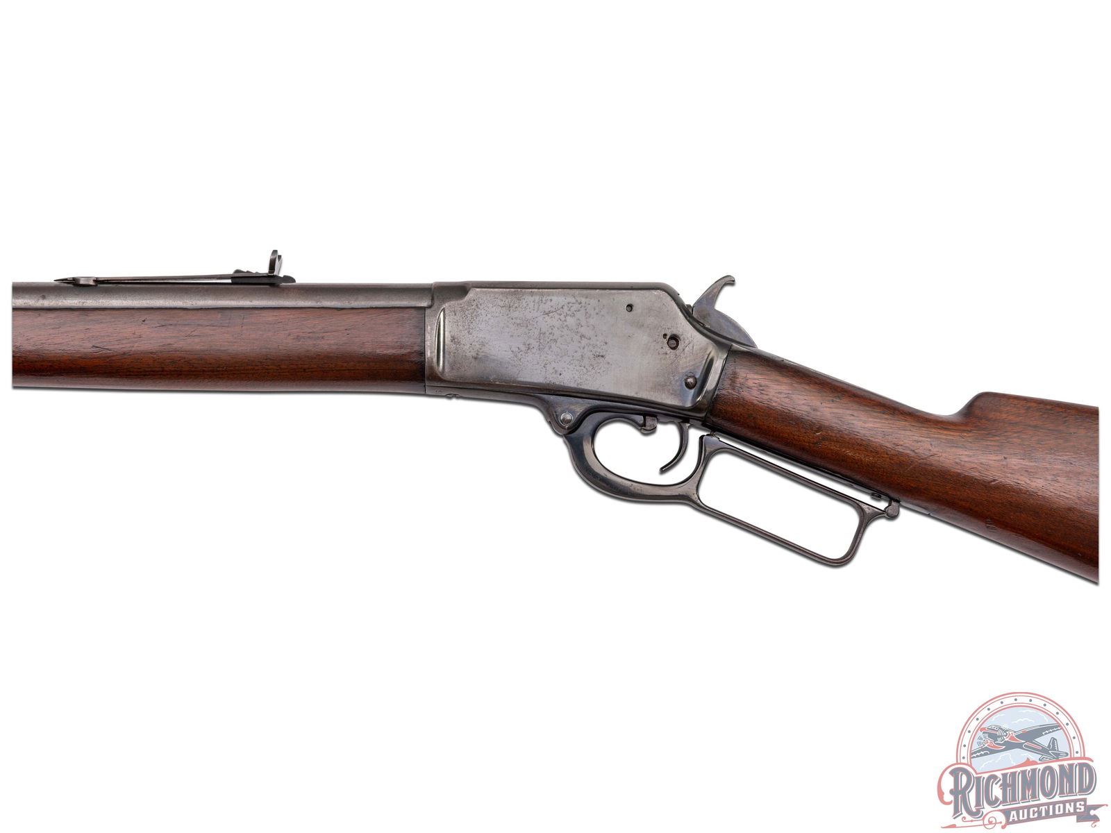 Manufactured circa 1898. This Marlin model 1889 features a 24" blued round barrel with rear Buckhorn sight with elevator and nickel blade front sight. Top of the barrel is stamped "MARLIN FIRE-ARMS CO. NEW HAVEN, CT U.S.A. / PATENTED OCT. 11, 1887, APRIL 2, 1889". Full length magazine tube holds up to 13 rounds of the .32 WCF cartridges. Blued receiver with side loading gate and side ejection. Top is stamped "MARLIN SAFETY". Smooth straight walnut wood stock with crescent metal butt plate and matching forearm with metal cap. LOP: 13". CALIBER: 32-20 WIN. S/N: 35786. FFL STATUS: Curio & Relic.