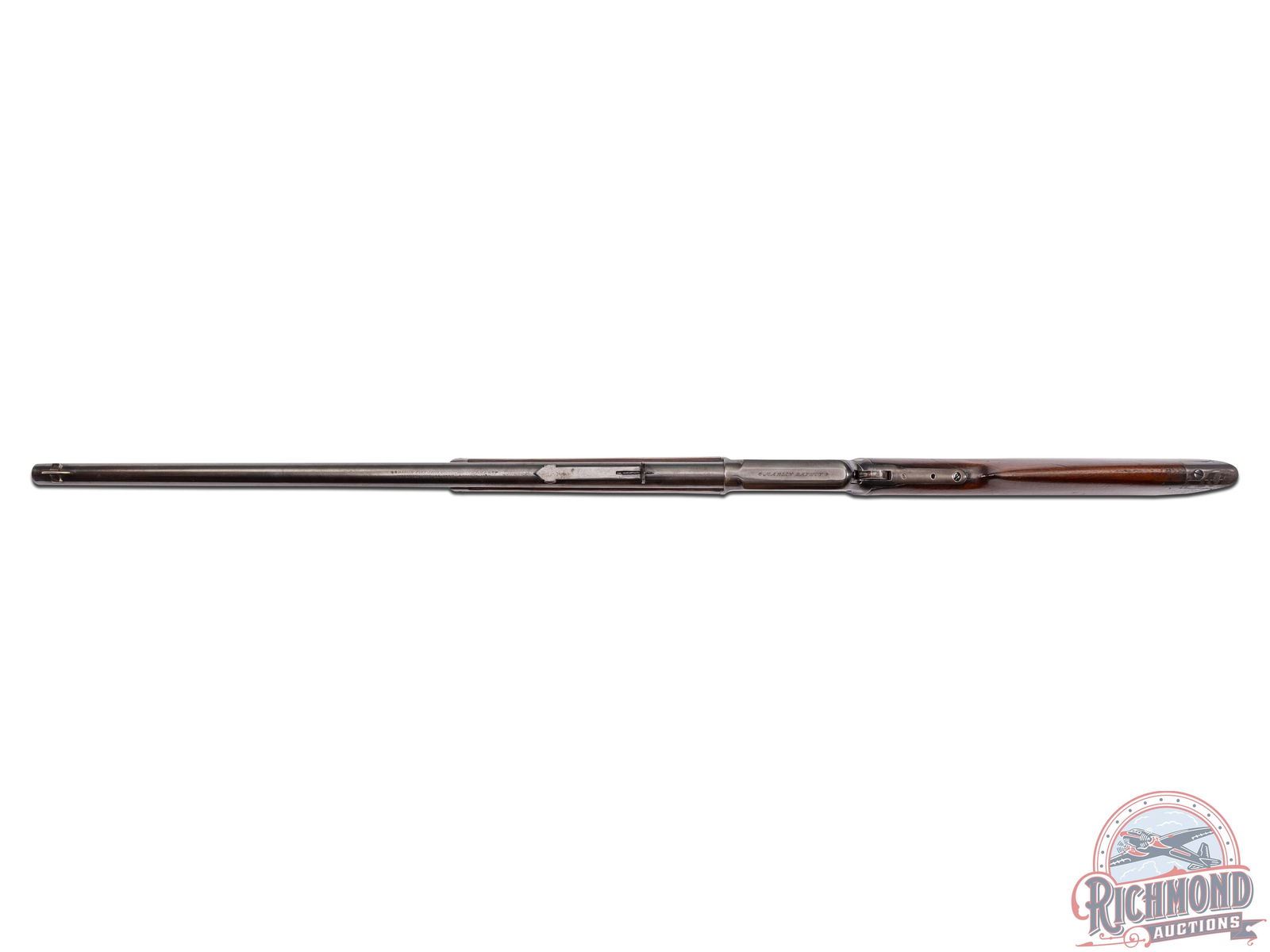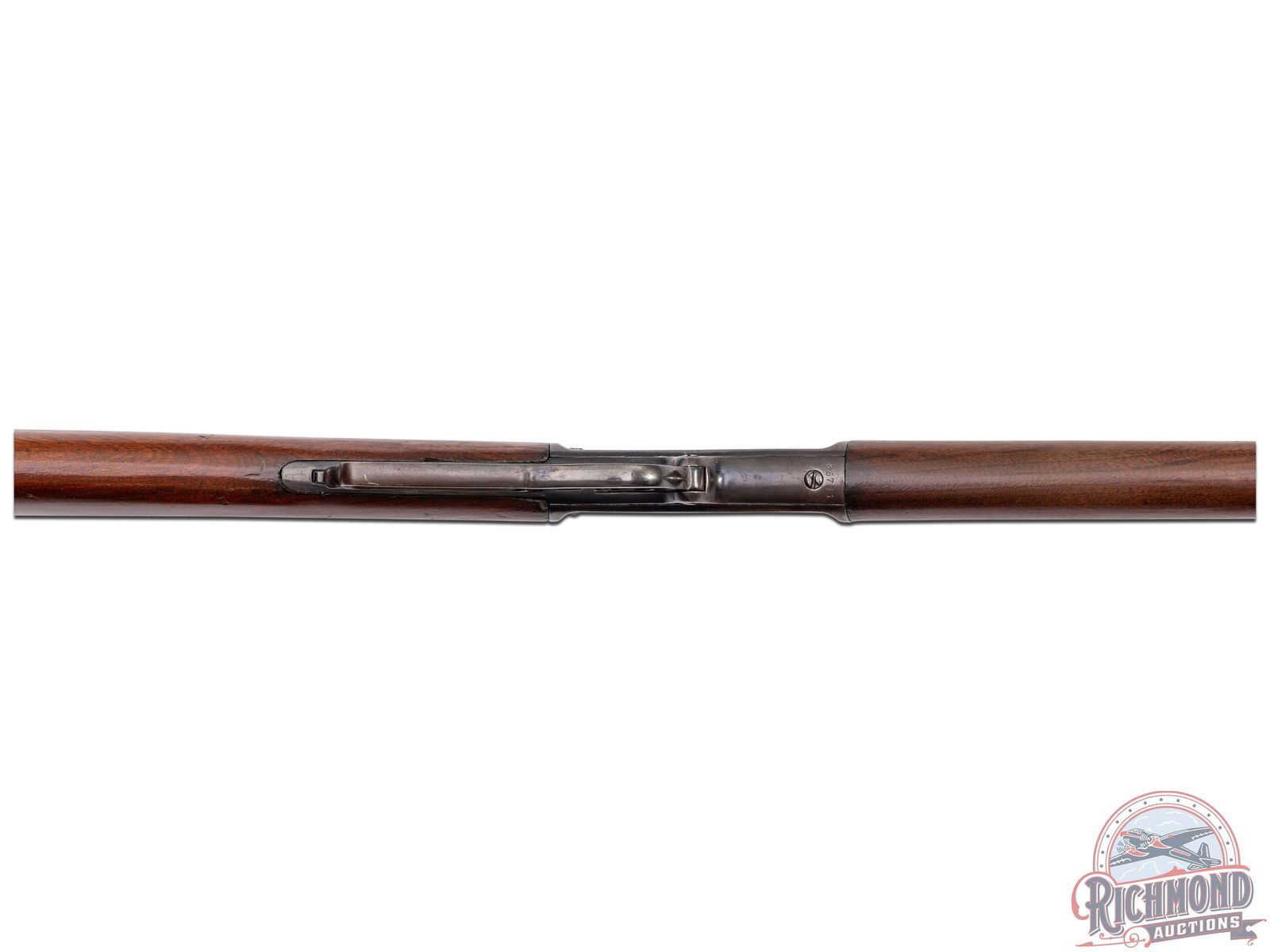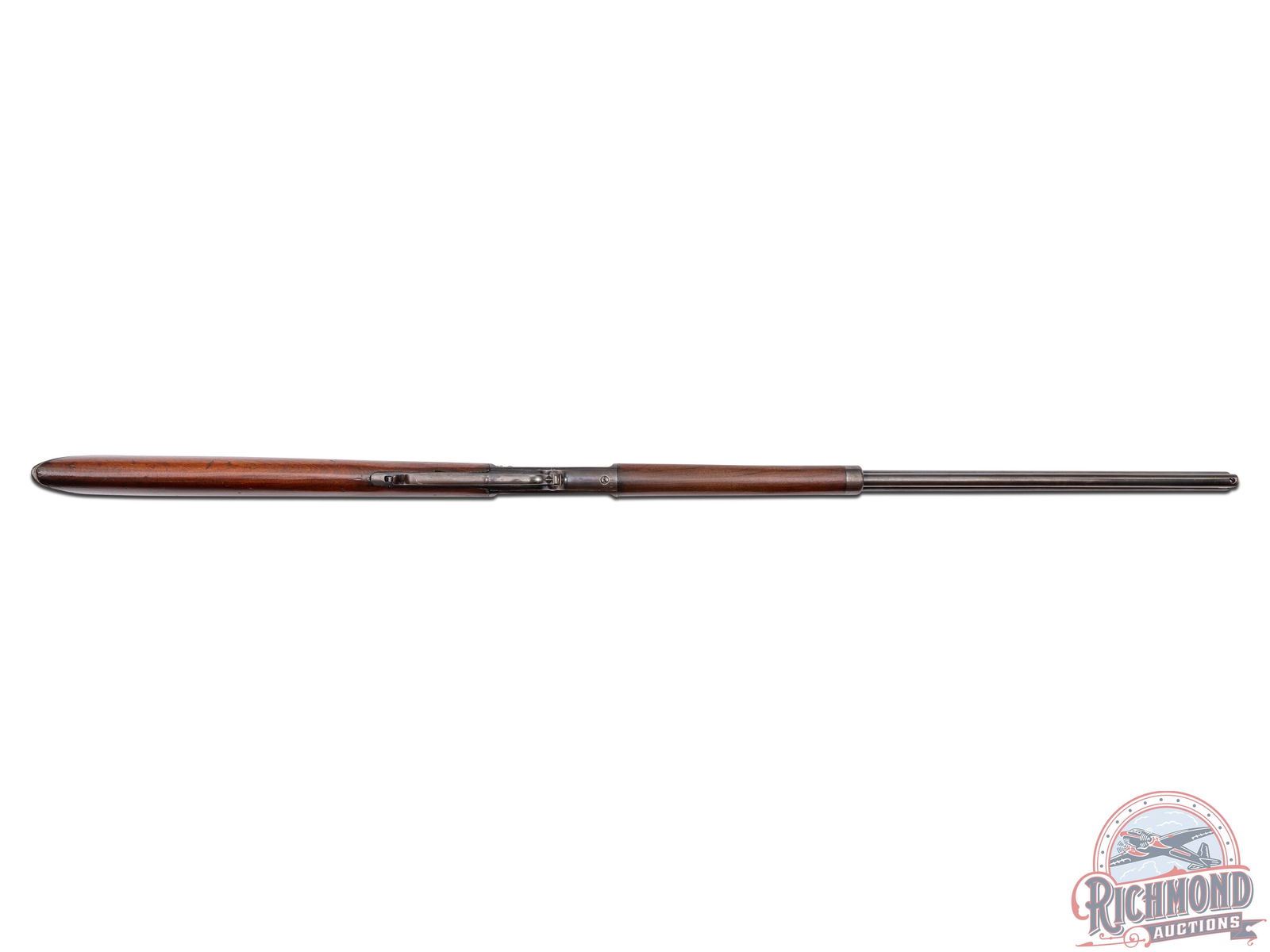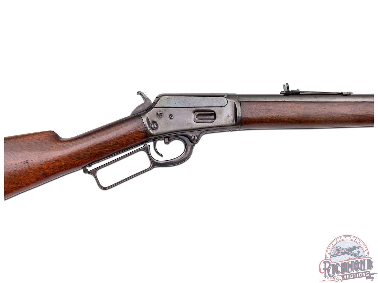 Manufactured circa 1898. This Marlin model 1889 features a 24" blued round barrel with rear Buckhorn sight with elevator and nickel blade front sight. Top of the barrel is stamped "MARLIN FIRE-ARMS CO. NEW HAVEN, CT U.S.A. / PATENTED OCT. 11, 1887, APRIL 2, 1889". Full length magazine tube holds up to 13 rounds of the .32 WCF cartridges. Blued receiver with side loading gate and side ejection. Top is stamped "MARLIN SAFETY". Smooth straight walnut wood stock with crescent metal butt plate and matching forearm with metal cap. LOP: 13". CALIBER: 32-20 WIN. S/N: 35786. FFL STATUS: Curio & Relic.