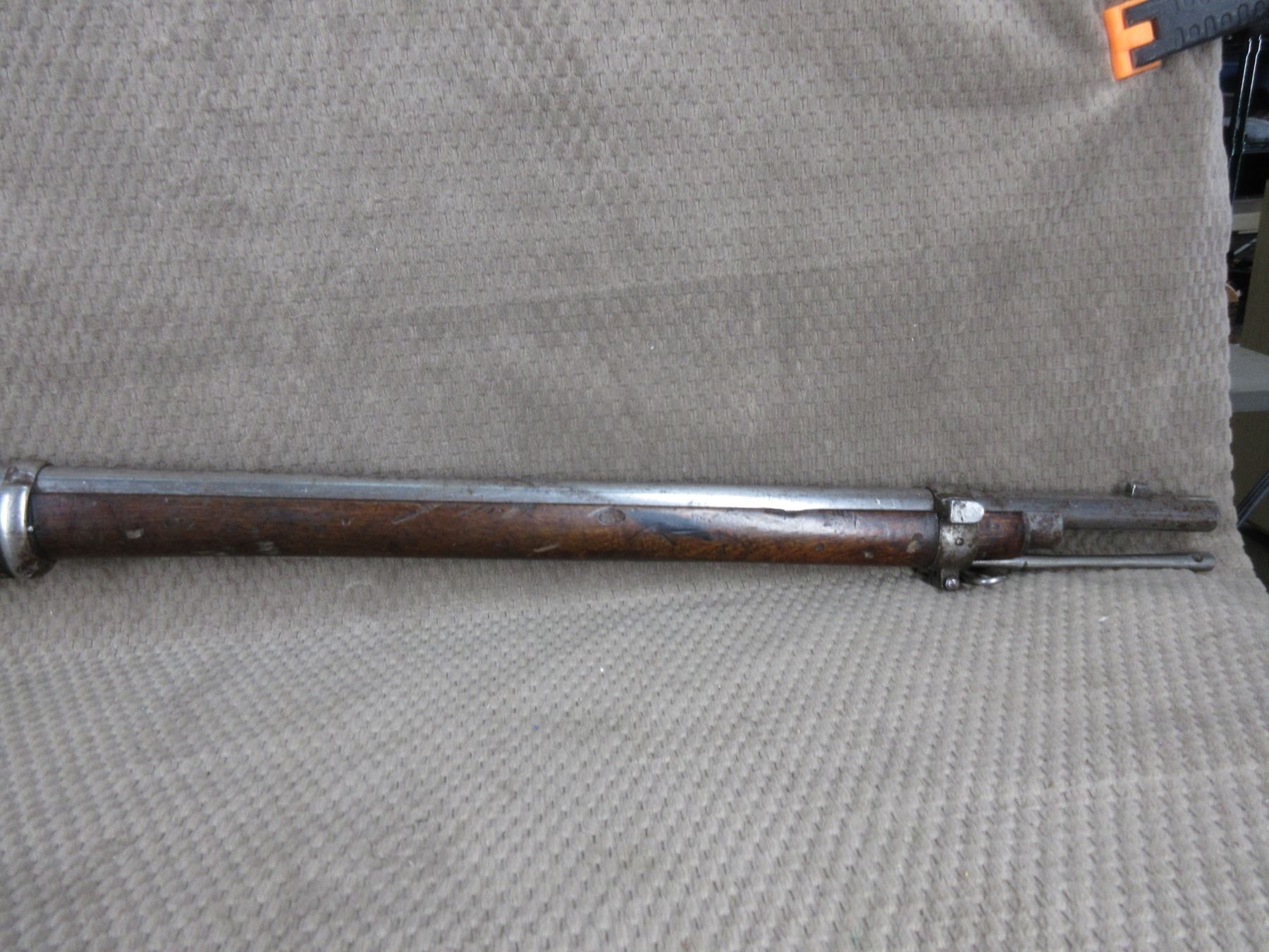 Antique - Martini Henry in 577-450 - This short lever action single shot rifle appears to be in poor working order as lever opens action but is very stiff and trigger is very heavy. Barrel 33", rifling is good but a dark, bluing is gone, has both sights, stock is poor, forearm is poor, metal butt plate has cleaning rod.